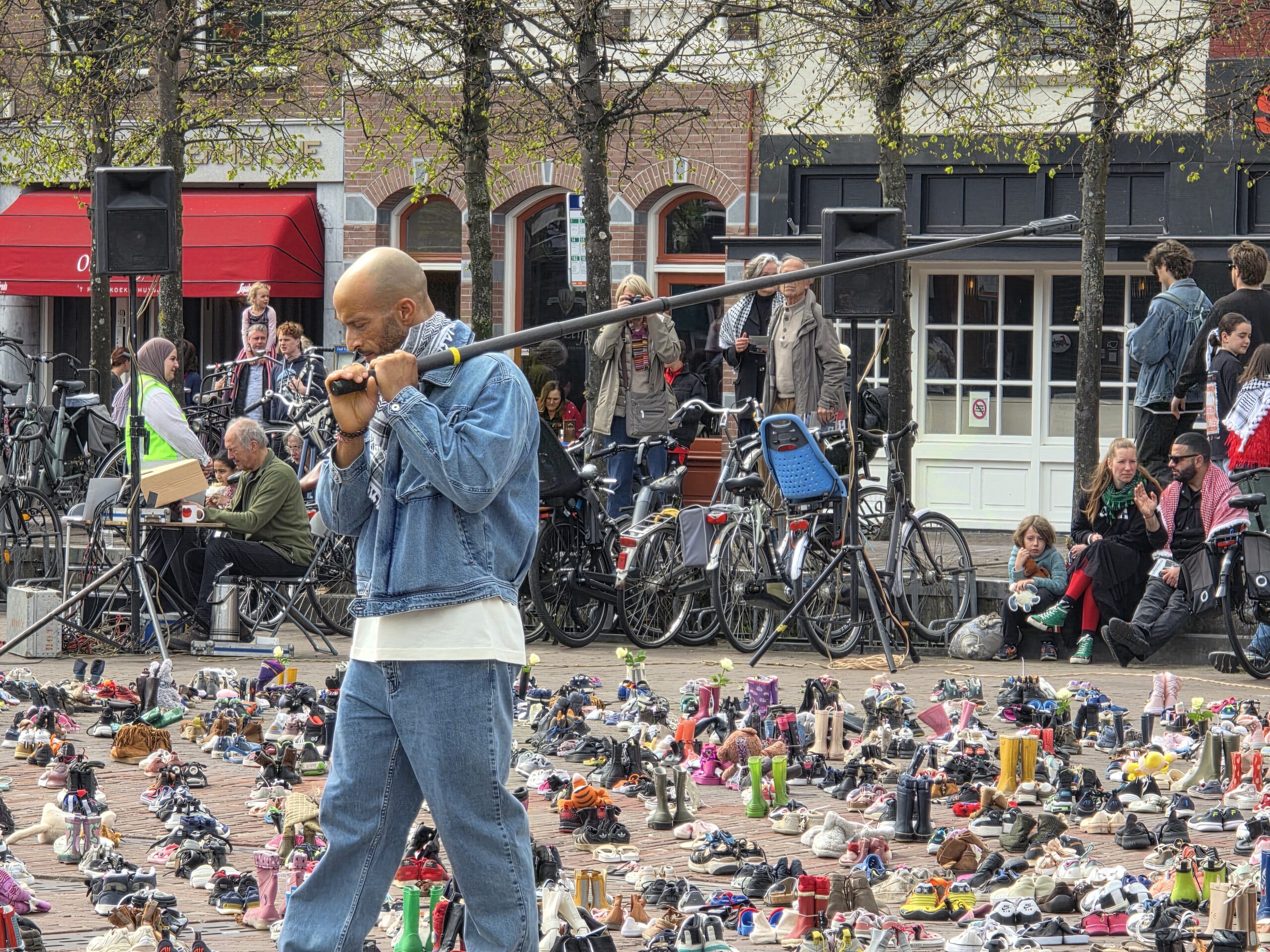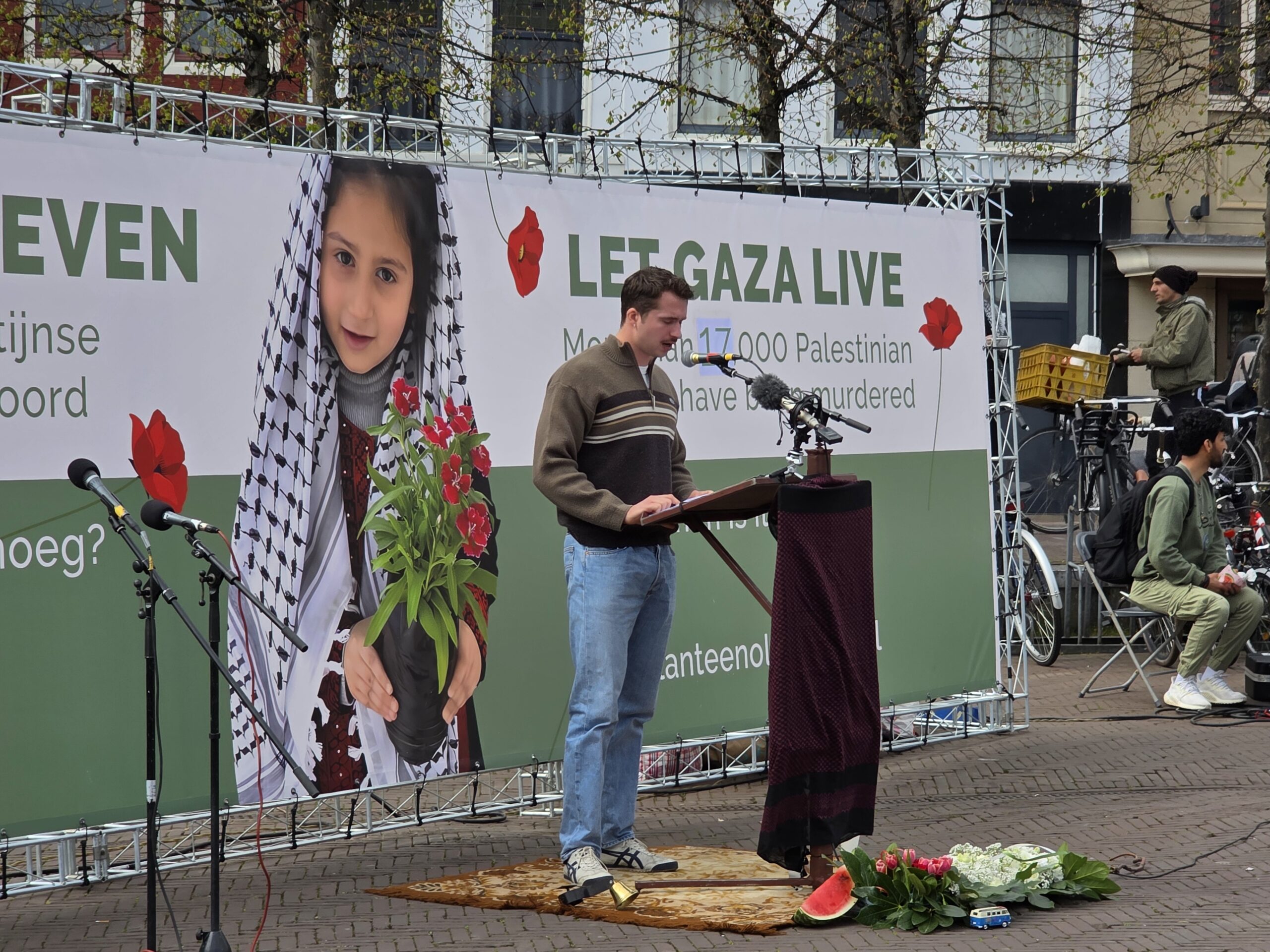 Ondertussen werden duizenden namen van de omgekomen kinderen voorgelezen. Urenlang, elke tien minuten een andere spreker. Docenten, vertegenwoordigers van kinderorganisaties, Amnesty International. “Mijn naam is Ellen, ik ben docent Nederlands op een VMBO-school en ik ben mama van Aymen van twee jaar. Mijn kind is niet anders dan… en weer volgt een eindeloze lijst namen van kinderen die slachtoffer zijn geworden van de Israëlische bombardementen op Gaza.
