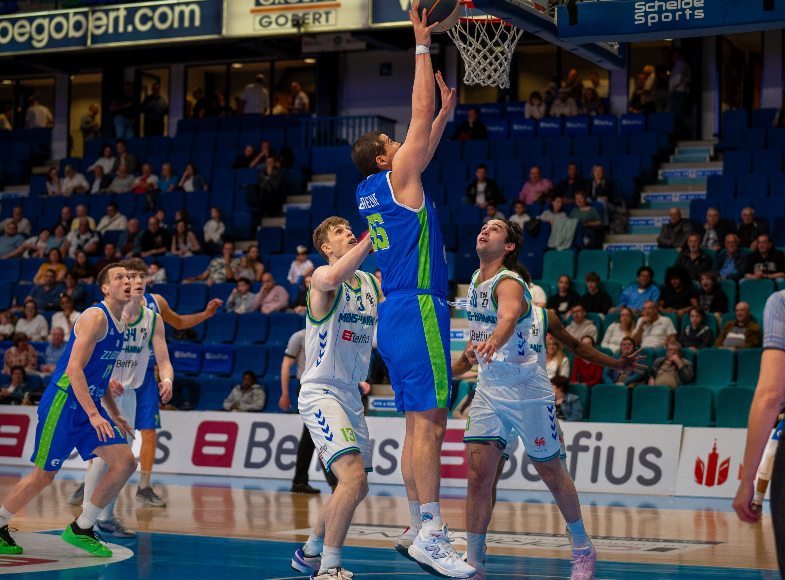 Na de pauze (42-45) waren de scores duur. Aaron Cook, die voor rust nog niet had gescoord, pakte vijf punten op rij, zodat ZZ Leiden uitliep naar 45-52. Ook dit keer kreeg Union Mons-Hainaut weer alle gelegenheid om terug in de wedstrijd te komen. De Belgische ploeg nam zelfs een 59-55 voorsprong.