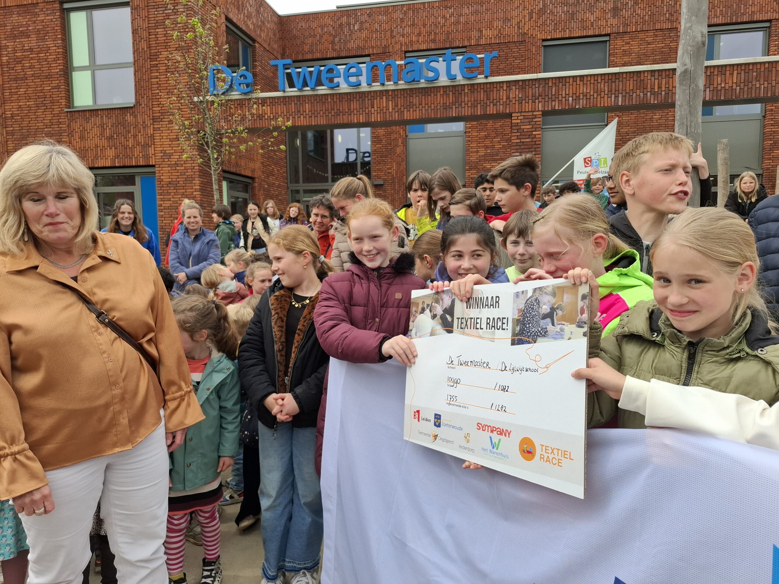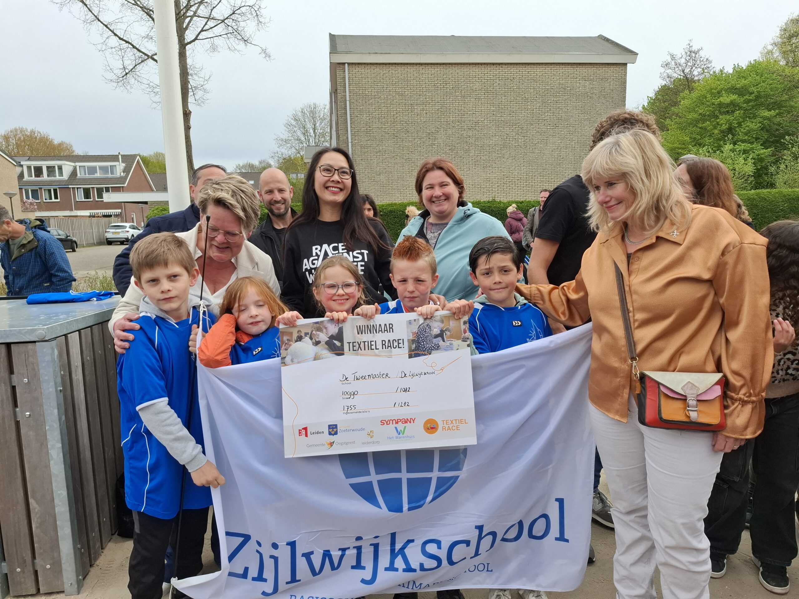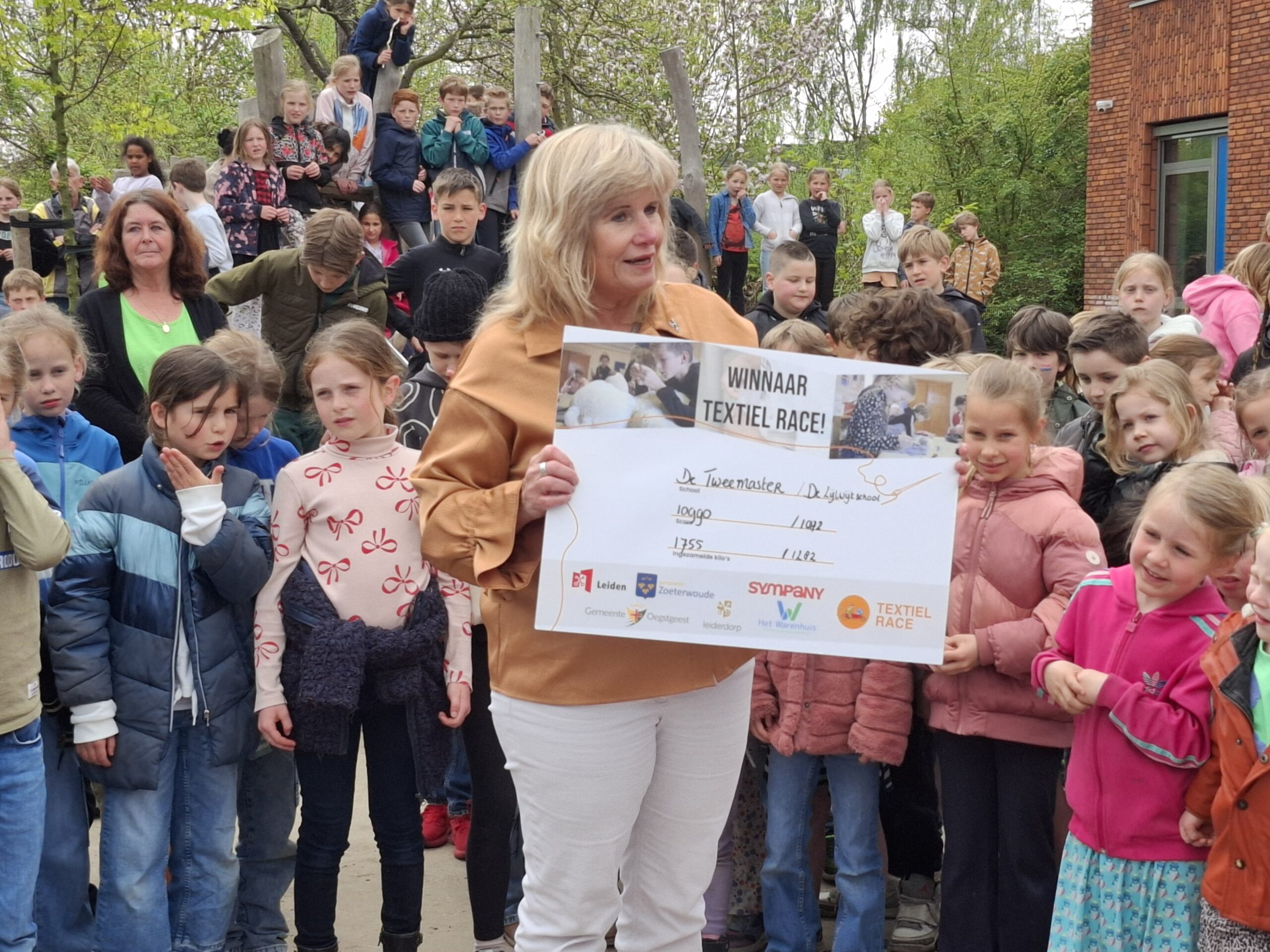 Groep7/8 van basisschool De Tweemaster én groep 5 van de Zijlwijkschool eindigden samen op de eerste plaats en wonnen hiermee allebei de hoofdprijs: een schoolreisje naar Science Museum NEMO in Amsterdam. De prijs werd uitgereikt door wethouder Yvonne van Delft en Sarah Portier en Kasper van Rooy van Race Against Waste. Deze Textiel Race is een initiatief van de gemeenten Leiden, Leiderdorp, Oegstgeest en Zoeterwoude in samenwerking met Stichting Kringloopwinkel Het Warenhuis.