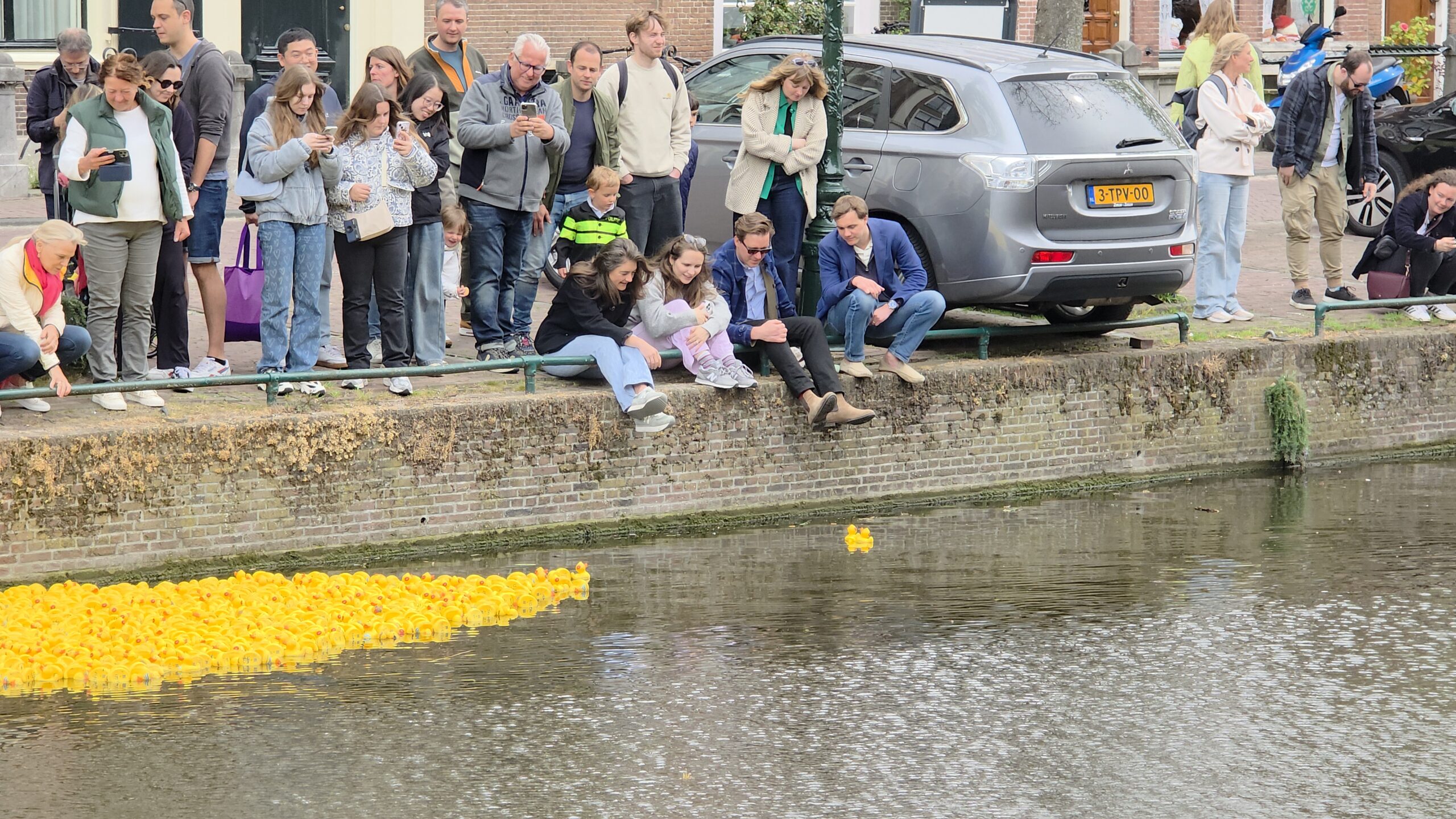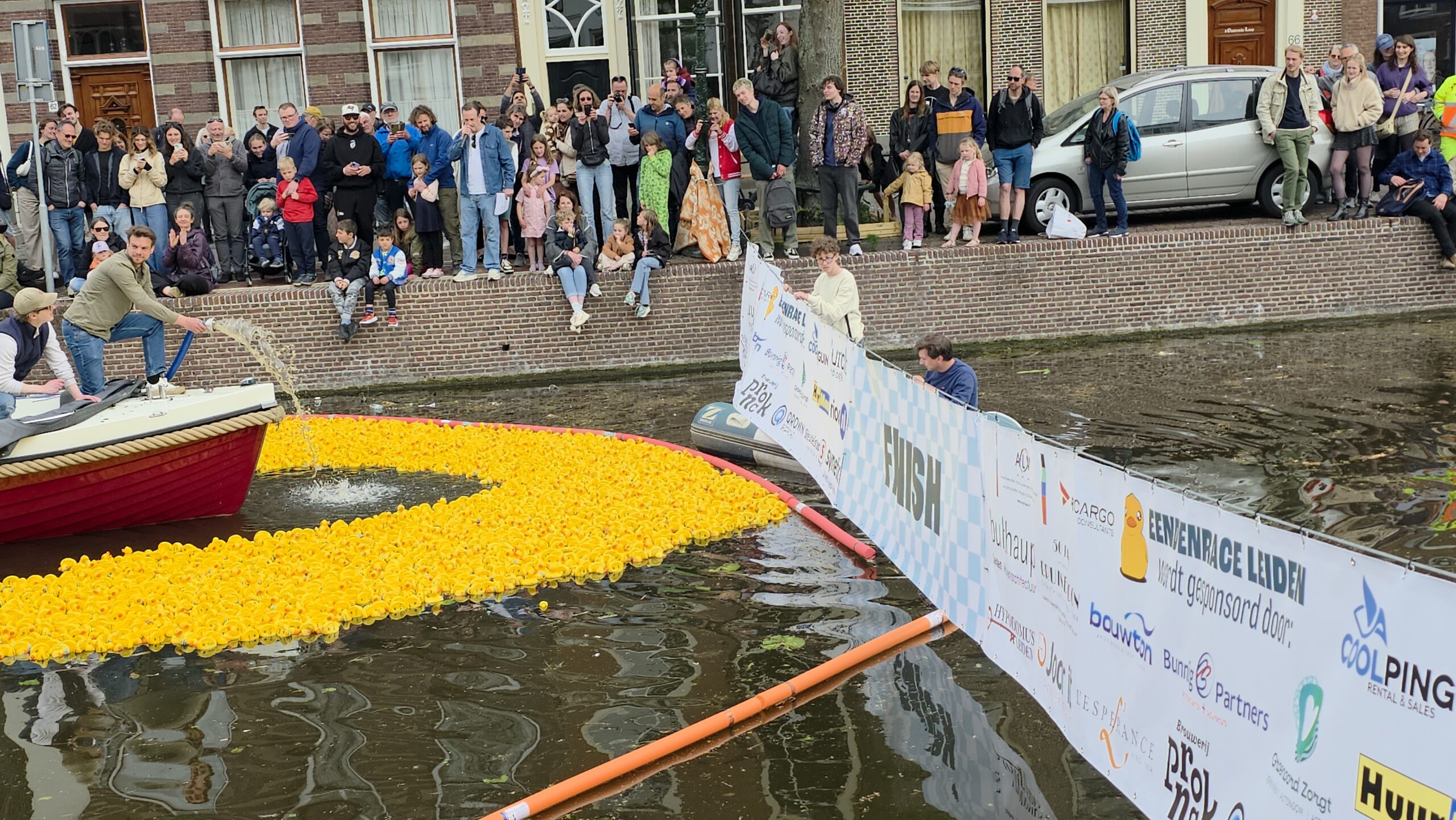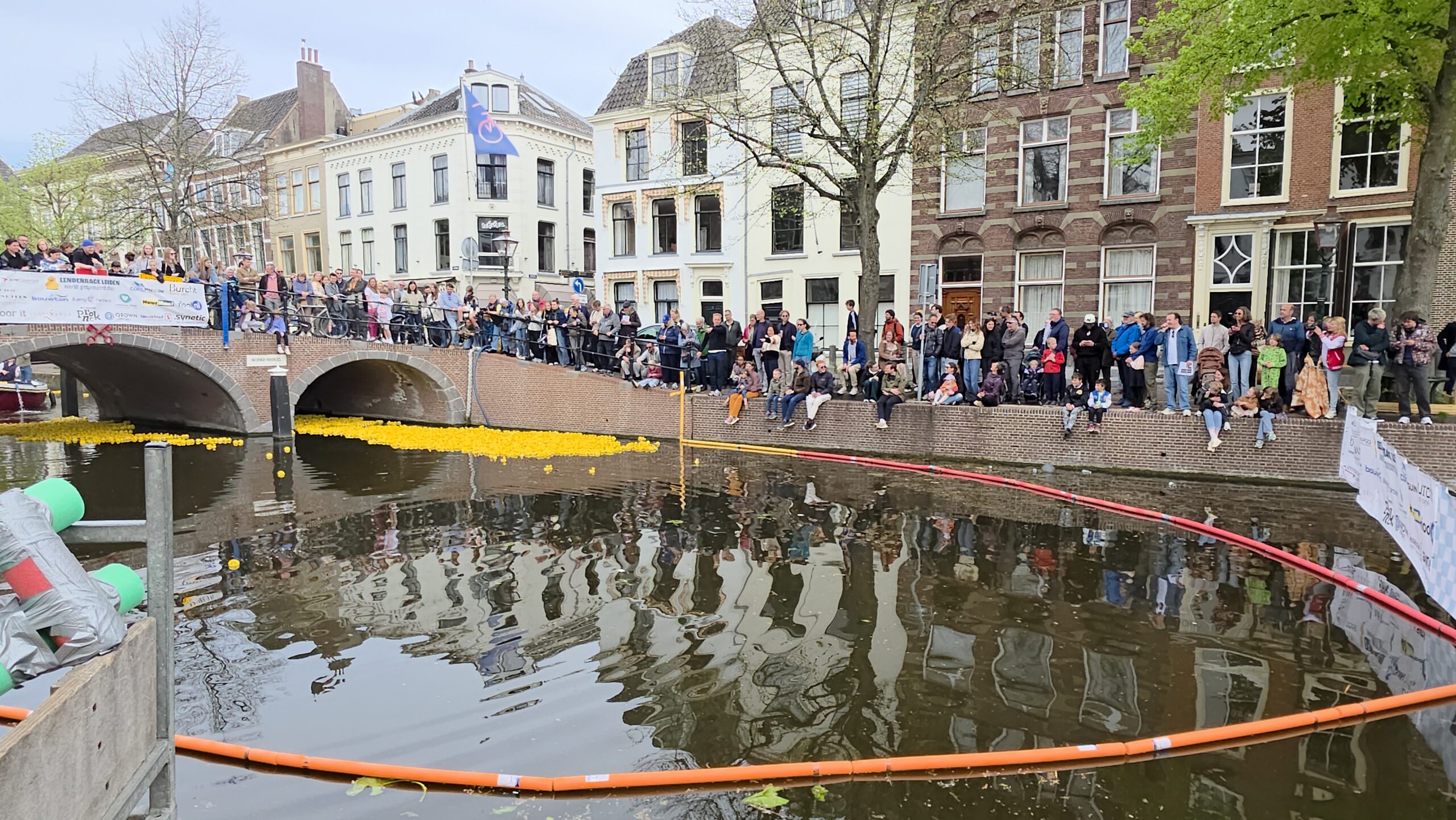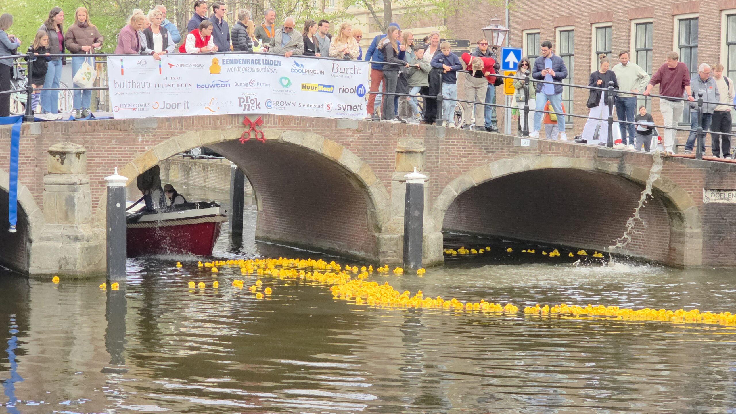 De afgelopen weken werden er 3.500 gele badeendjes geadopteerd voor de race. Die gingen rond 13.30 uur te water vanaf de Doelenbrug. Zo’n drie kwartier later dreven de eerste eendjes richting de finish achter de Nonnenbrug. Daarbij werden ze wel een beetje vooruit geholpen. Organisator De Ronde Tafel 150 Leiden had een aantal pompen geregeld om het grachtenwater te laten stromen. Vanuit een volgsloep werd daarmee het water in beweging gebracht.