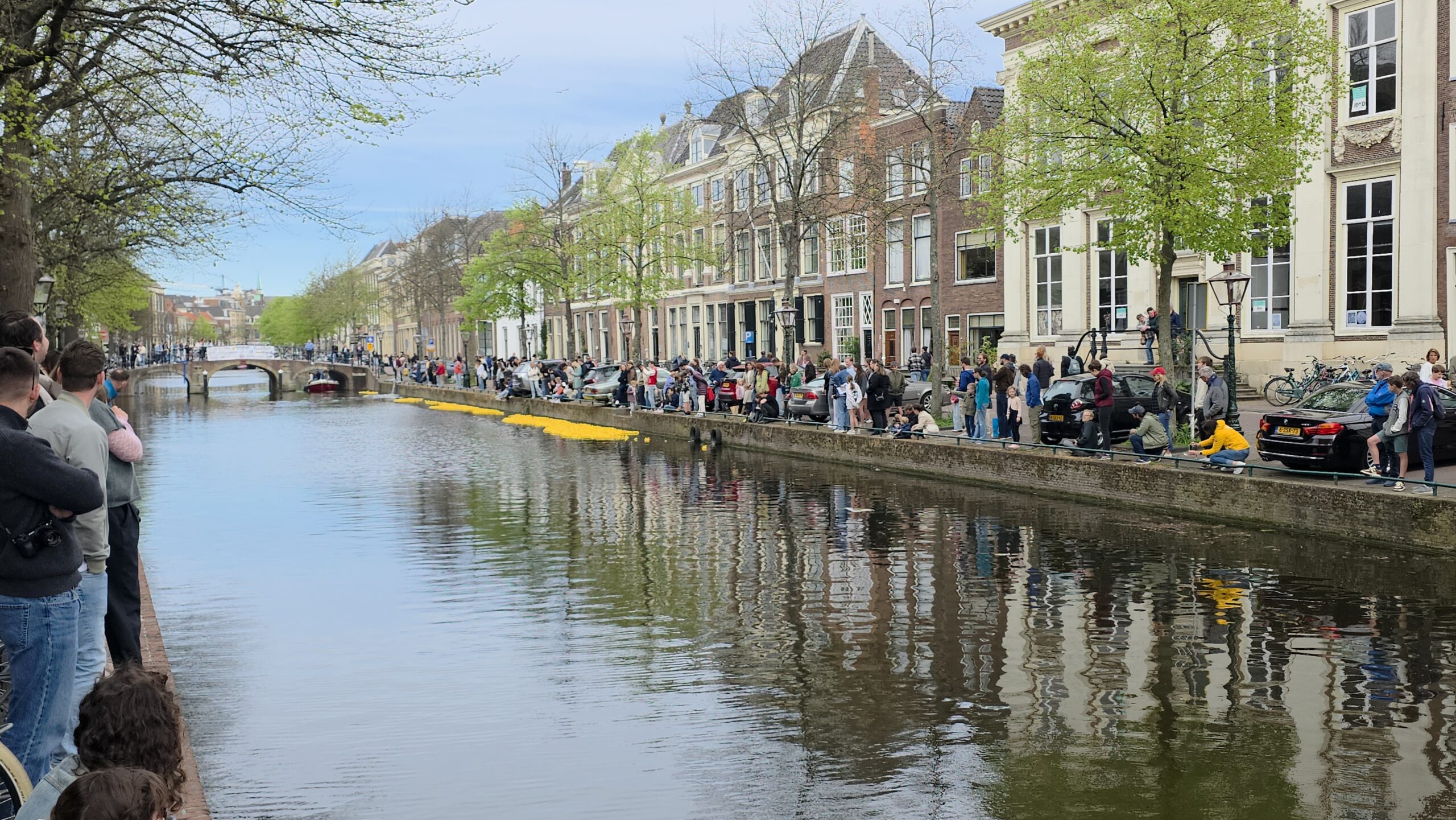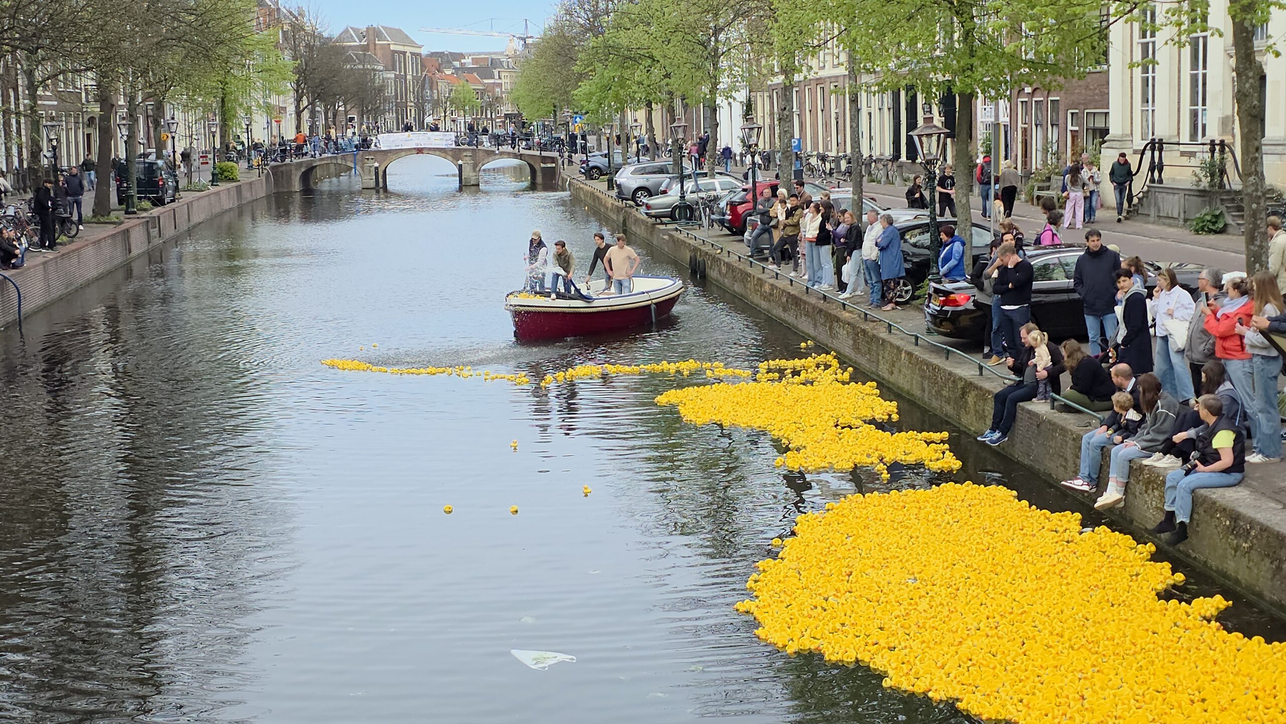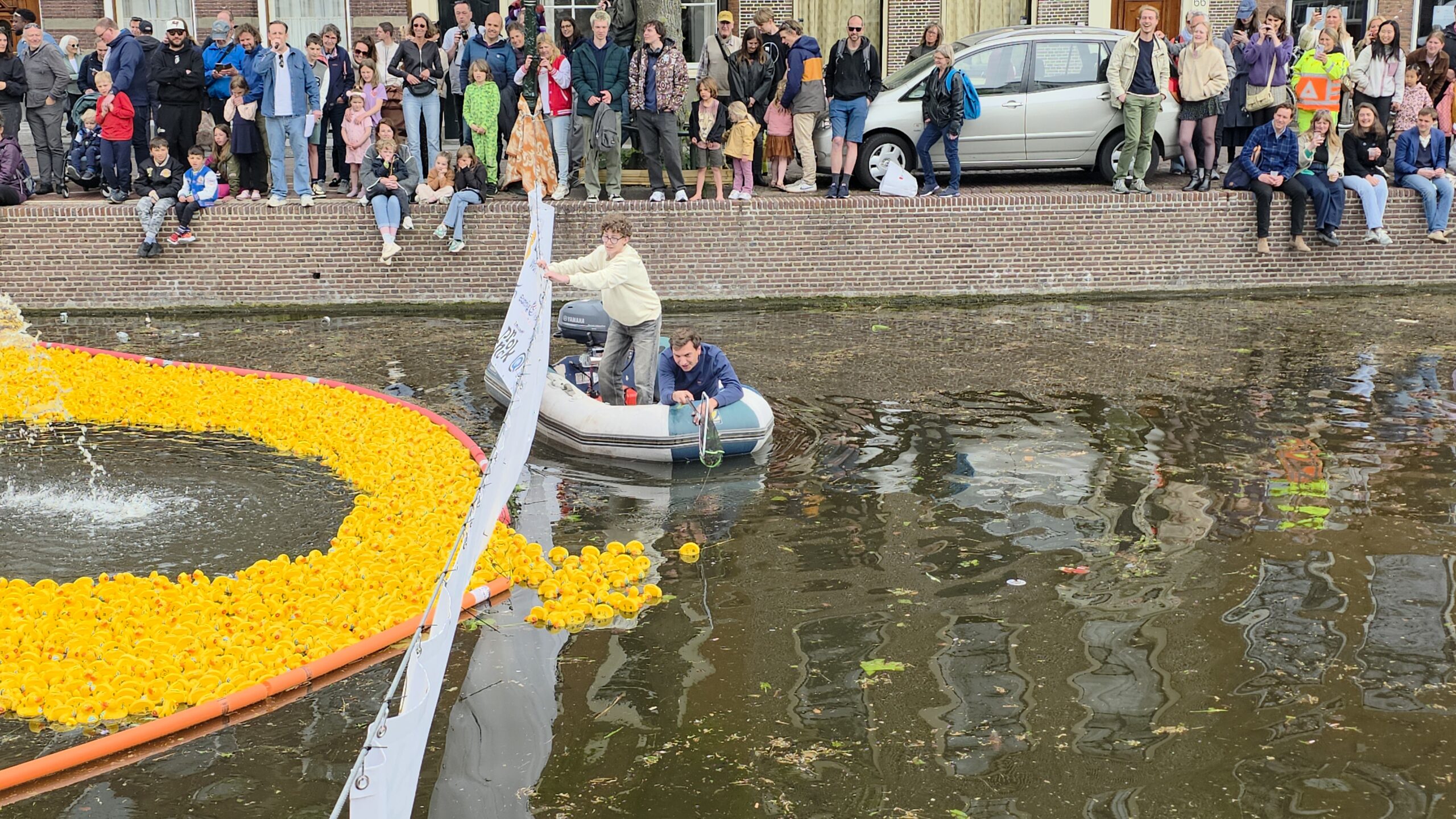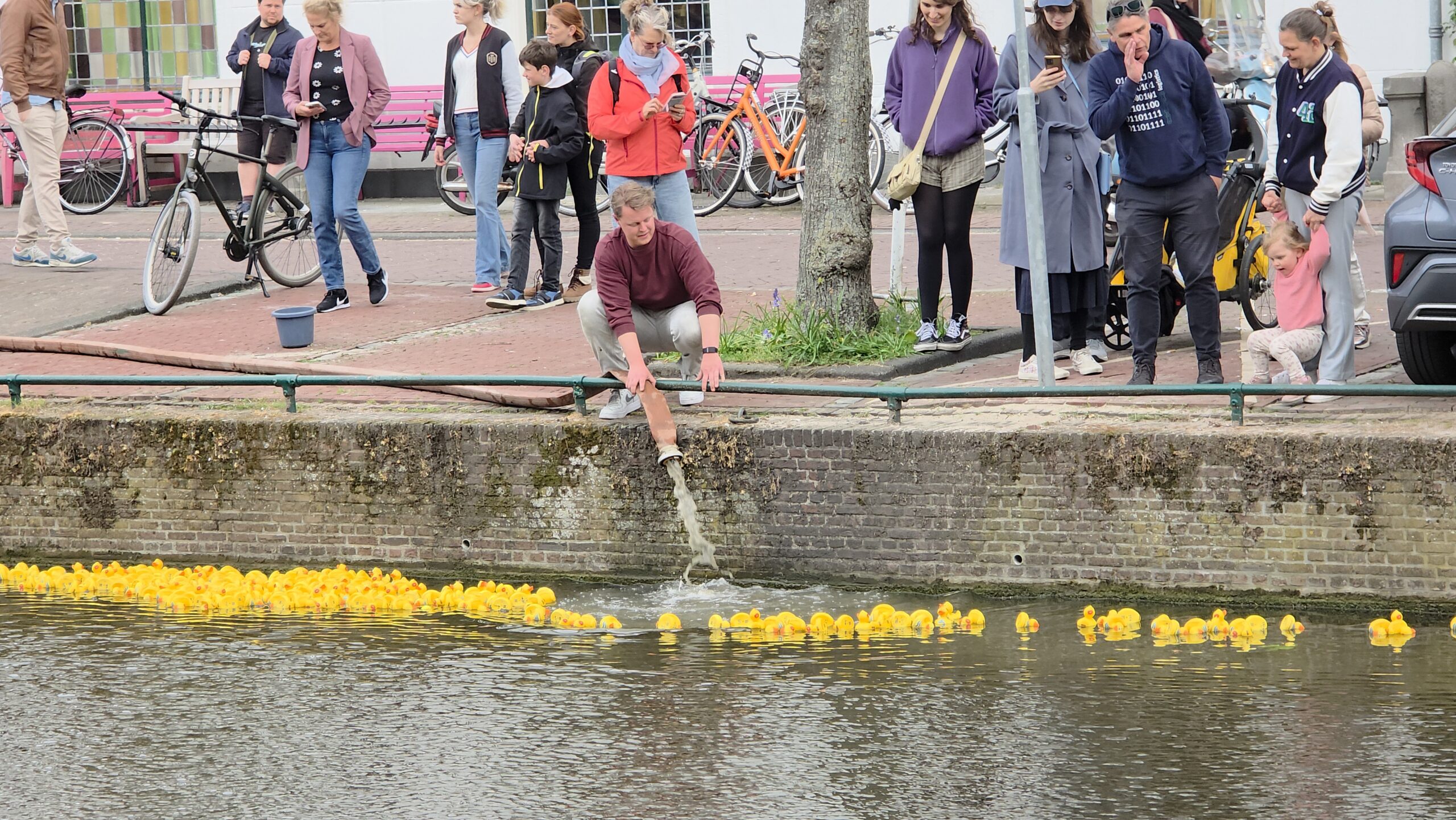 De afgelopen weken werden er 3.500 gele badeendjes geadopteerd voor de race. Die gingen rond 13.30 uur te water vanaf de Doelenbrug. Zo’n drie kwartier later dreven de eerste eendjes richting de finish achter de Nonnenbrug. Daarbij werden ze wel een beetje vooruit geholpen. Organisator De Ronde Tafel 150 Leiden had een aantal pompen geregeld om het grachtenwater te laten stromen. Vanuit een volgsloep werd daarmee het water in beweging gebracht.