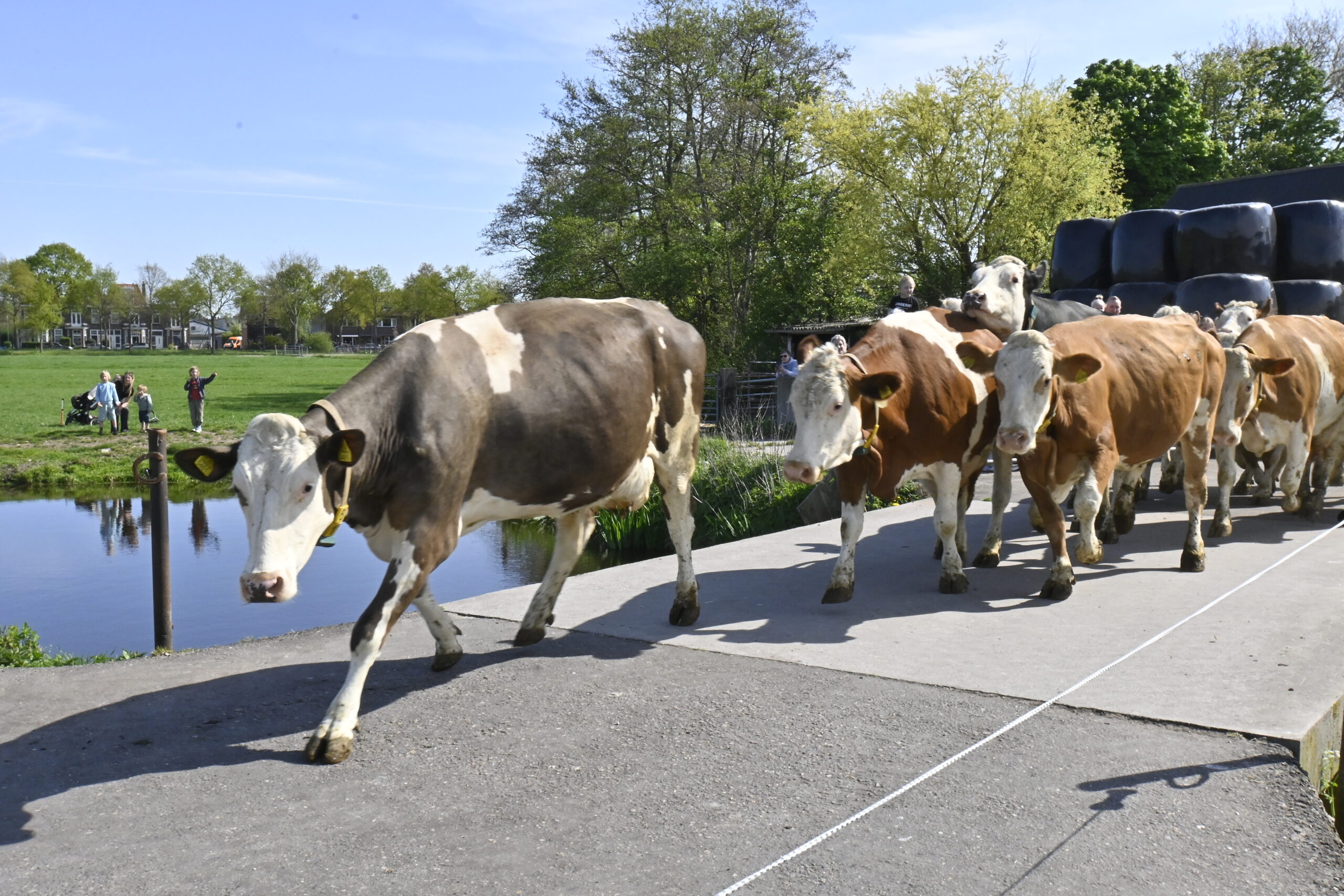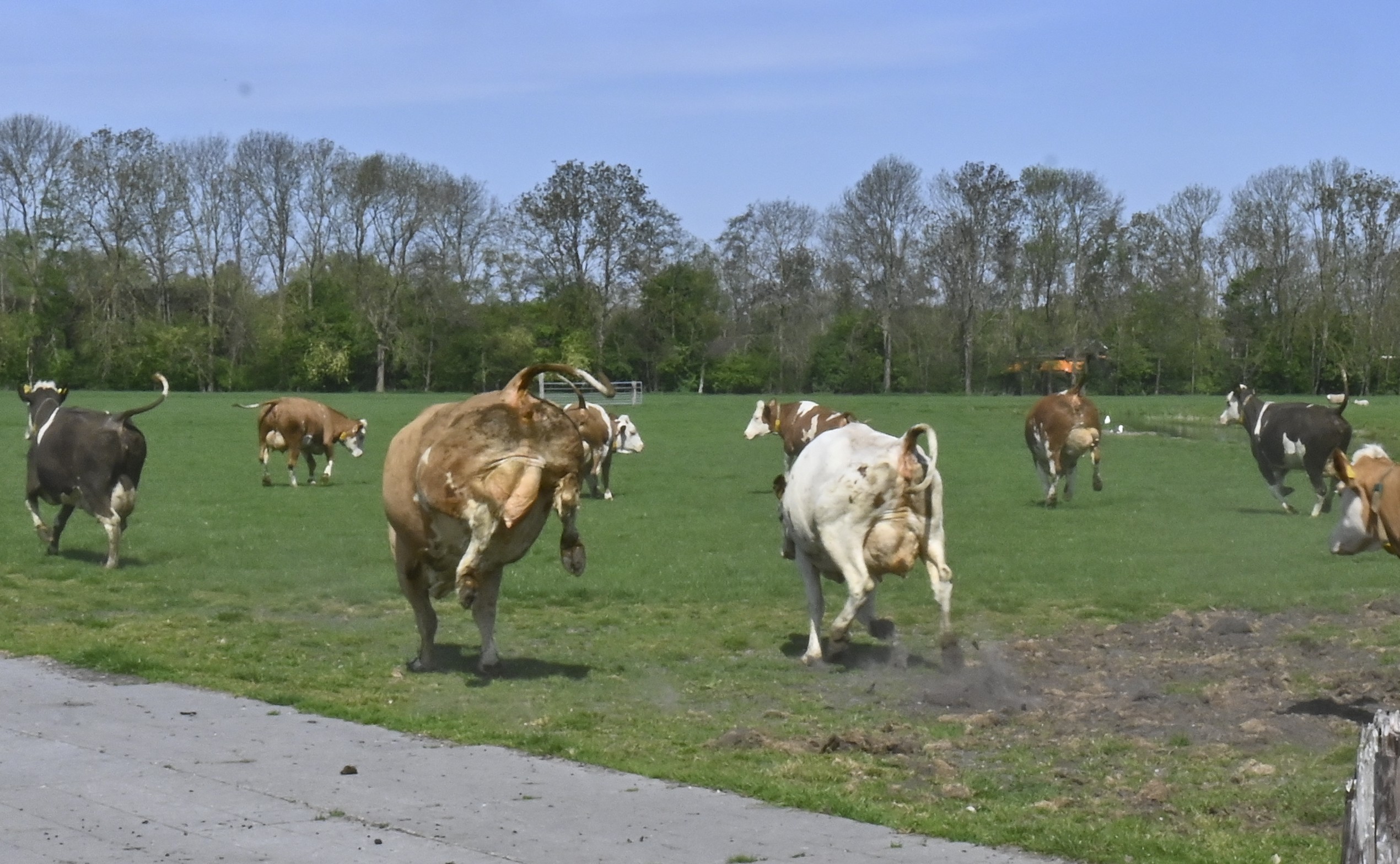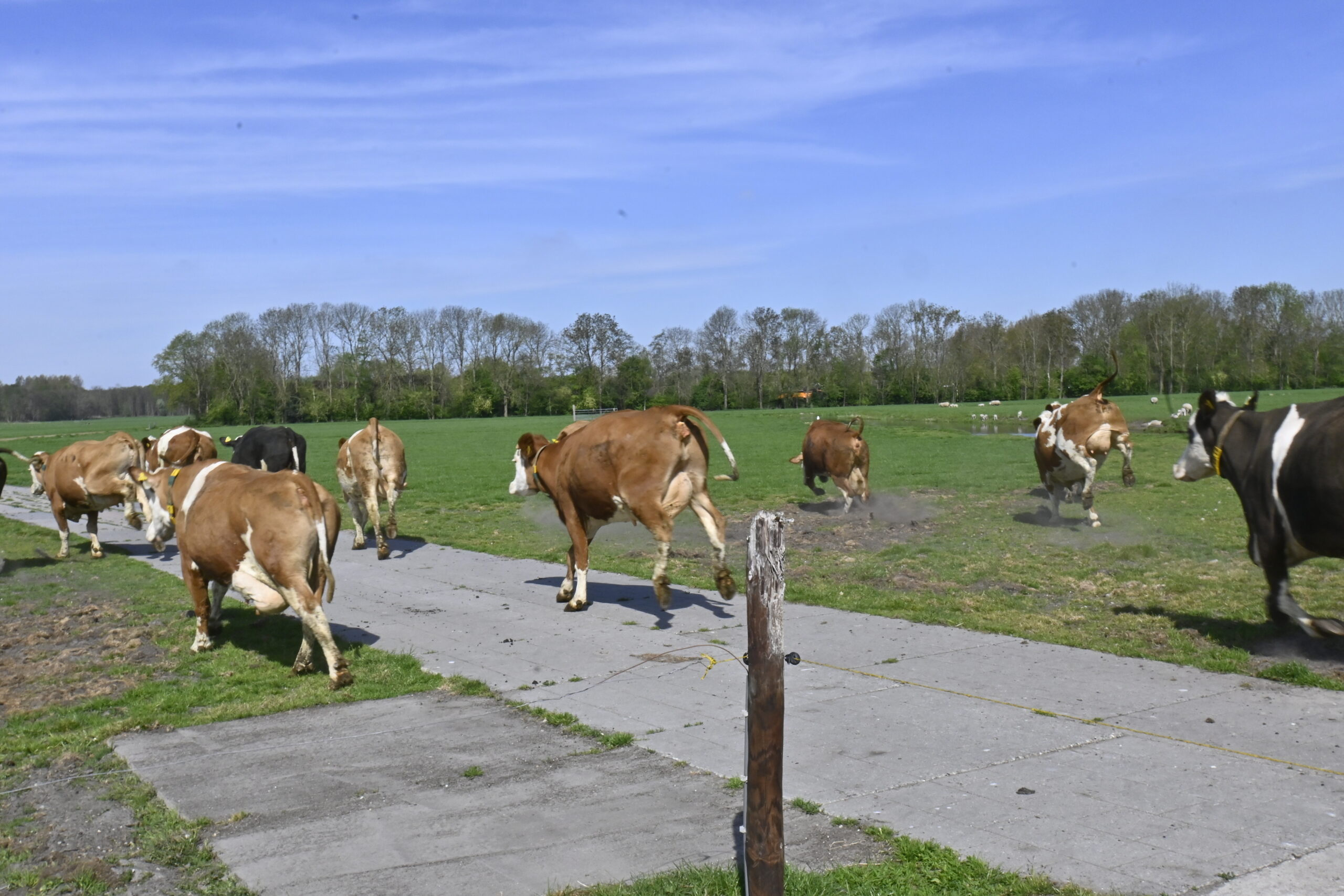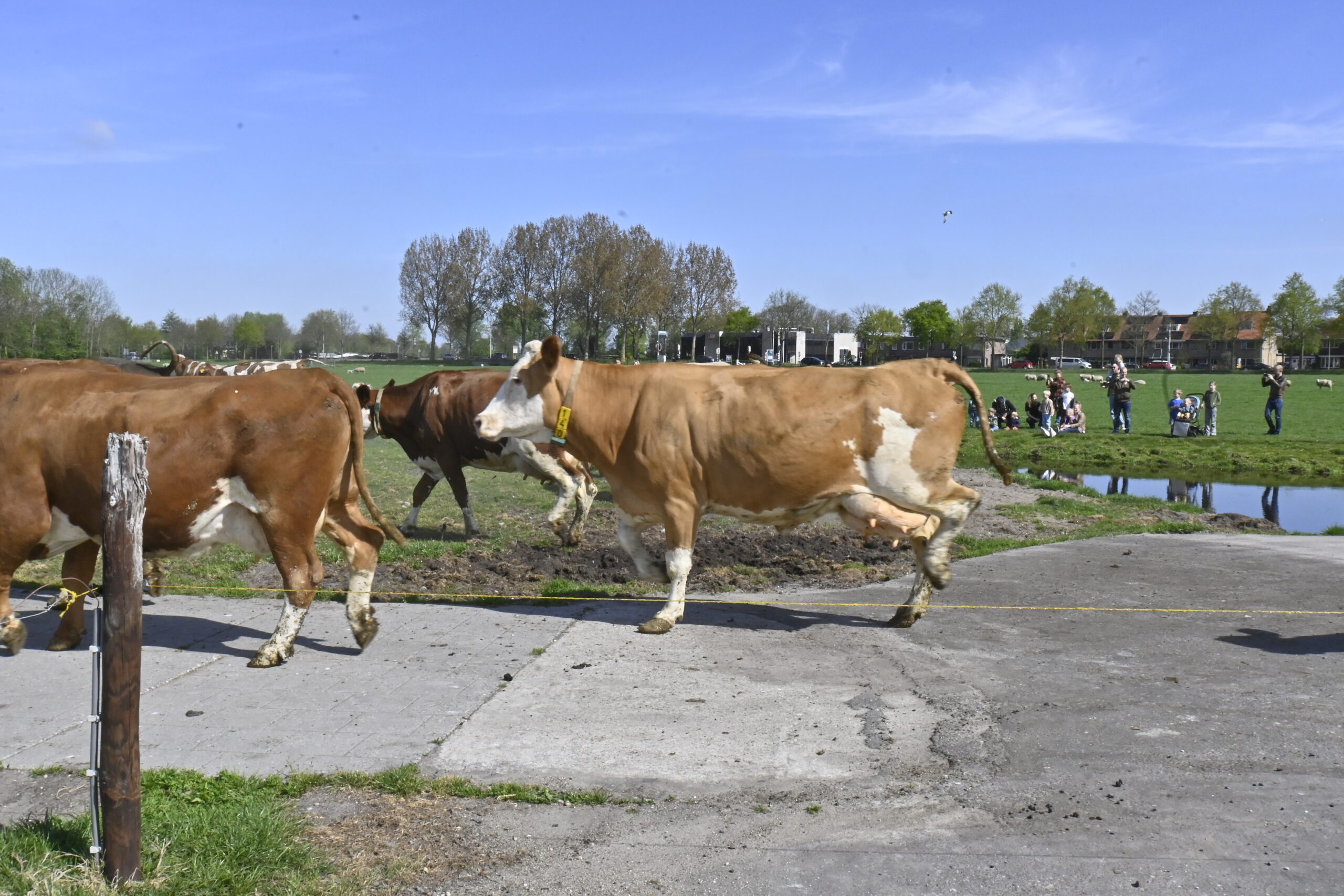 Toch moesten de koeien nog even geduld hebben, want eerst was het paaseieren zoeken voor de kinderen uit de buurt. Om 11.30 uur was het zover. Onder het toeziend oog van een paar honderd mensen publiek, verdrongen de koeien zich op de brug, op weg naar het malse gras. En wie wist dat deze toch logge beesten zo hoog konden springen…… “Bokken en springen in de wei, graven in de grond, vinden ze heerlijk”, zegt boer Peter.