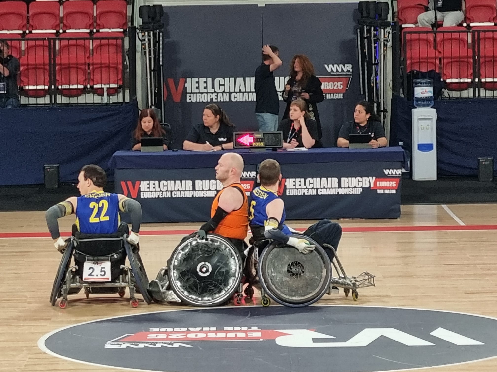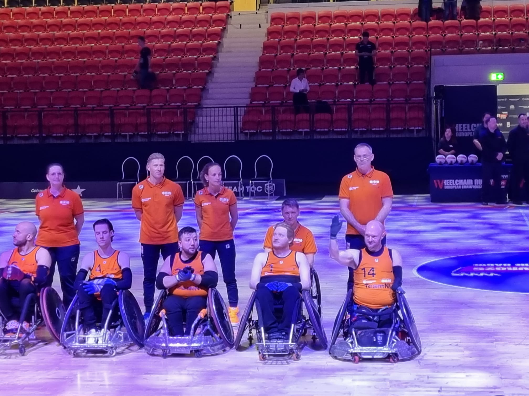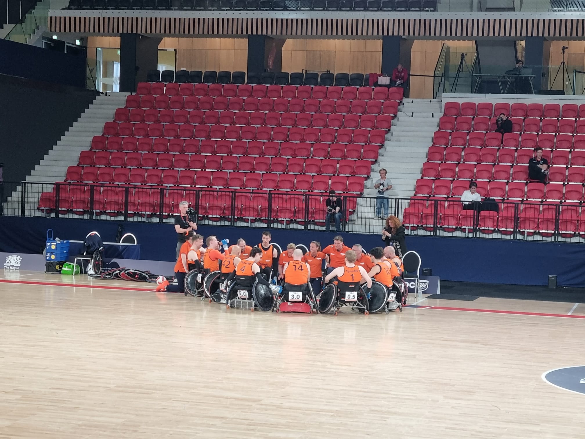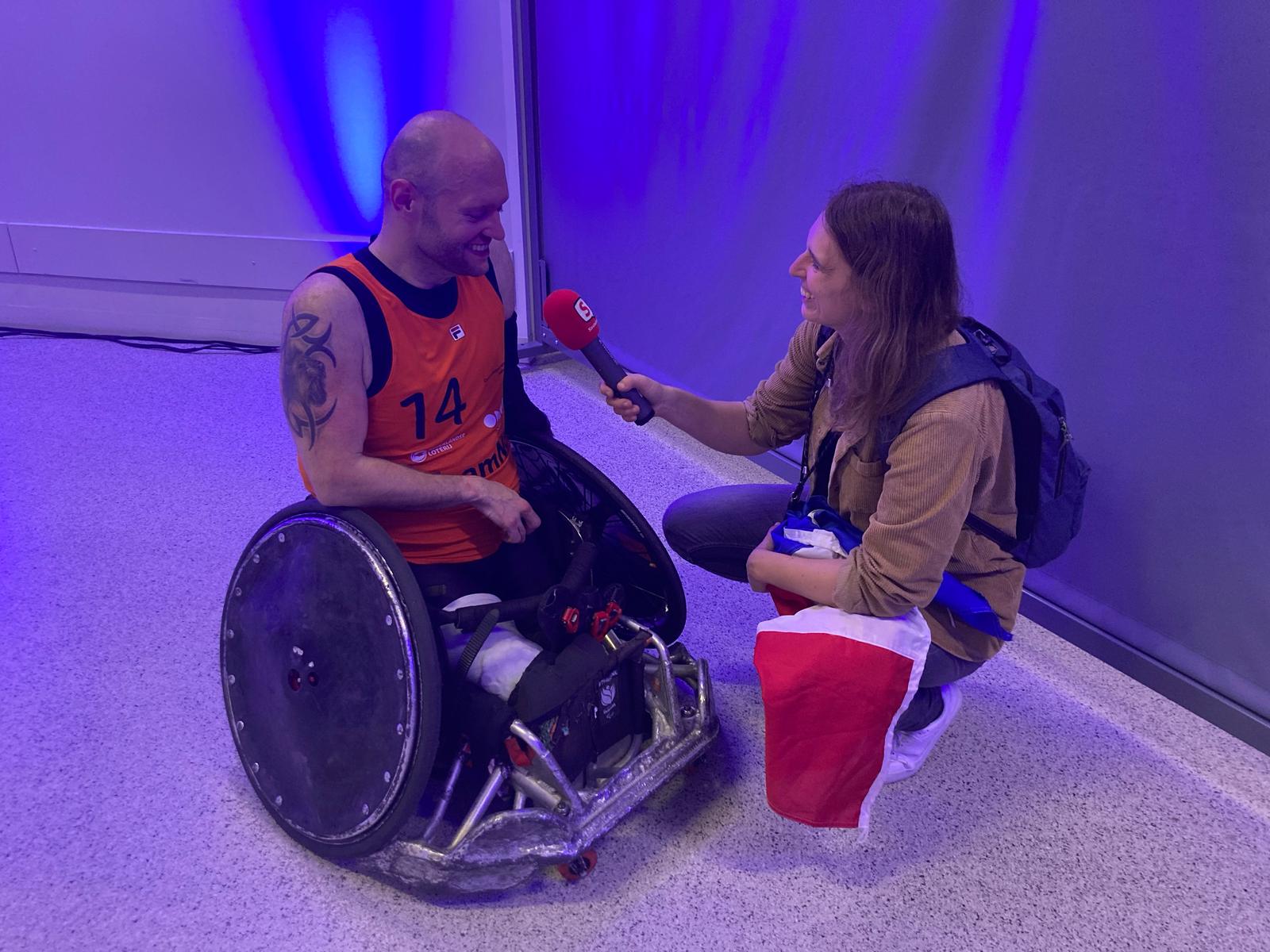 Reanne van Kleef in gesprek met Davy van den Dop na winst tegen Zweden op het EK Rolstoelrugby.