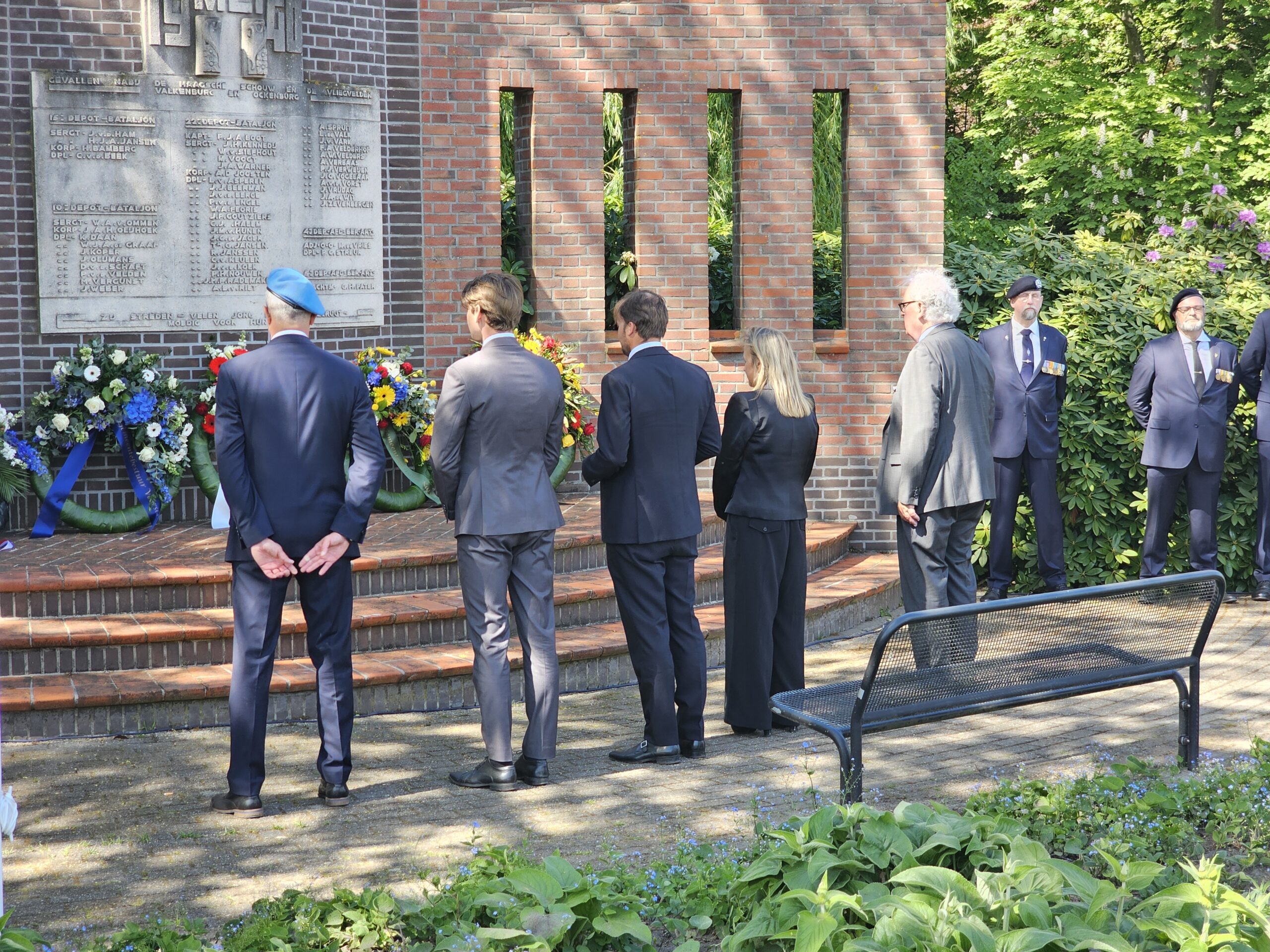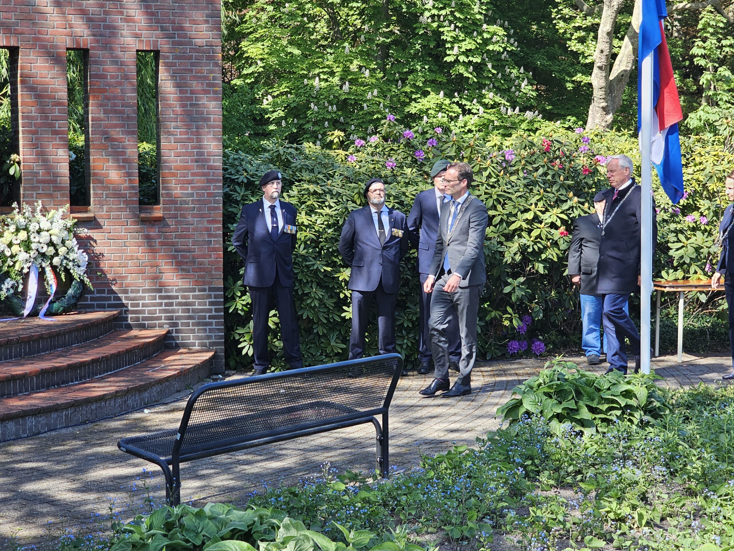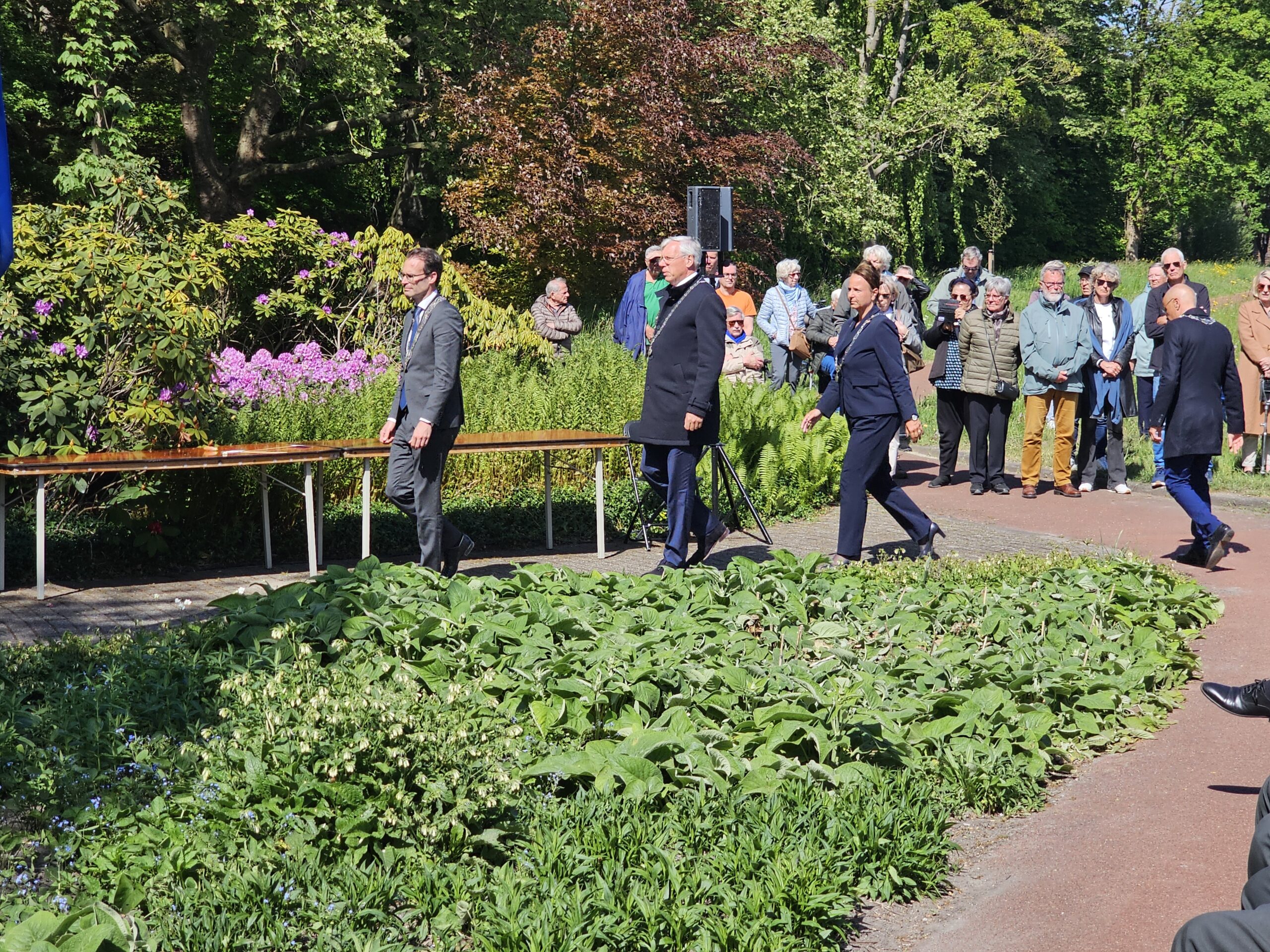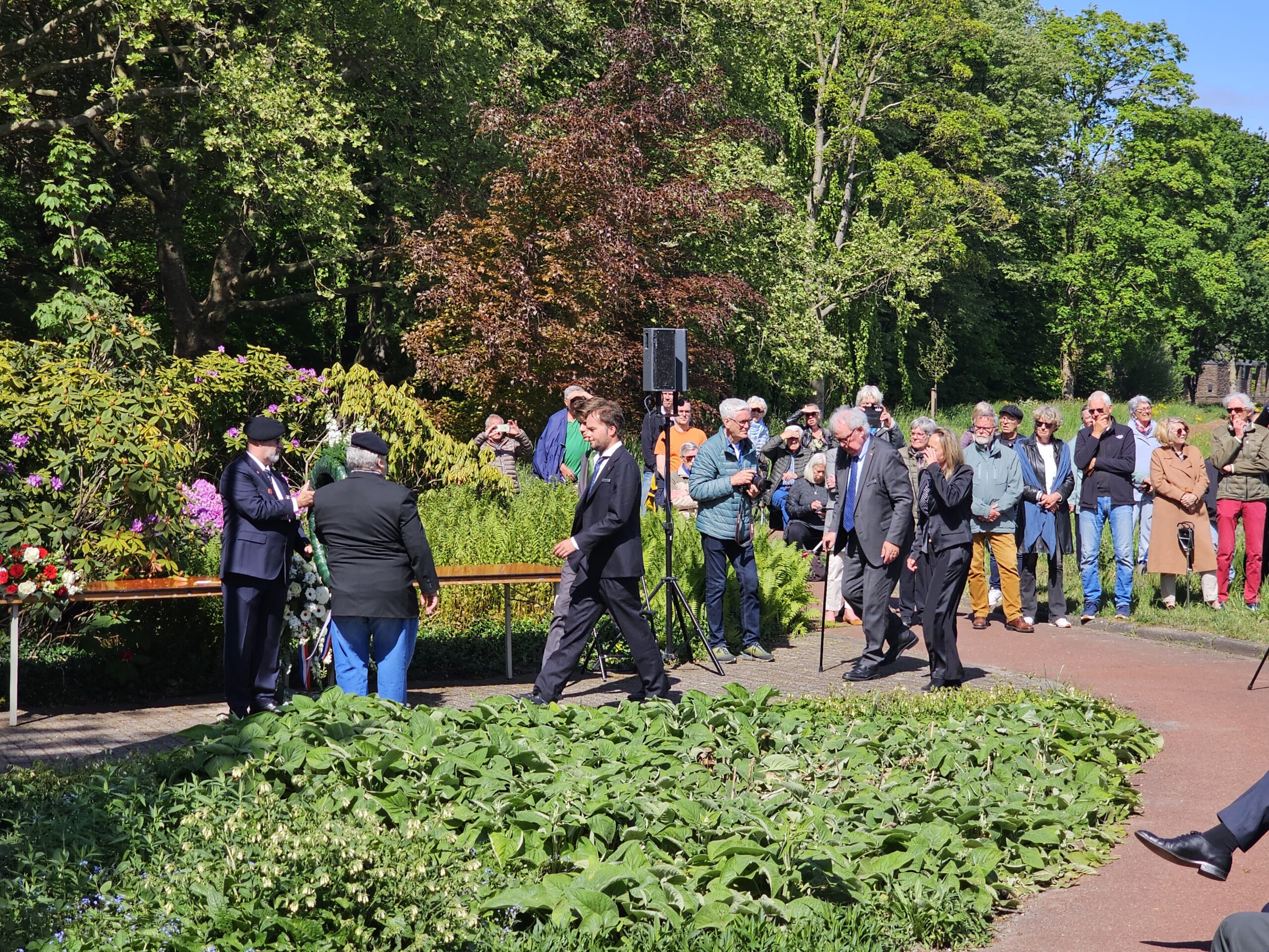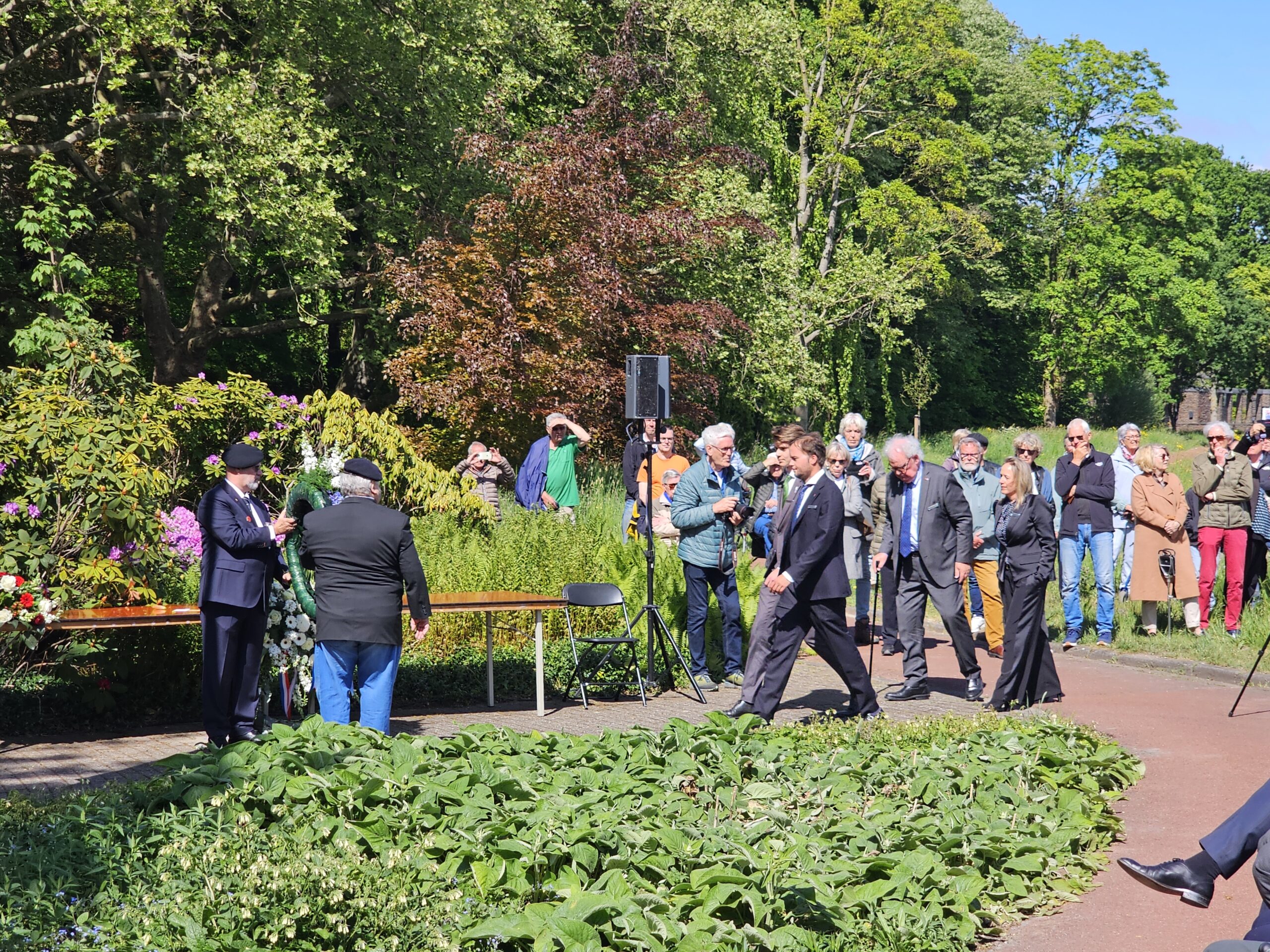 Aansluitend werden door de burgemeesters van Leiden, Oegstgeest, Voorschoten en Katwijk kransen gelegd. Na het spelen van de Last Post, het Wilhelmus en twee minuten stilte defileerden enkele honderden aanwezigen langs het monument, waarbij sommigen bloemen neerlegden.