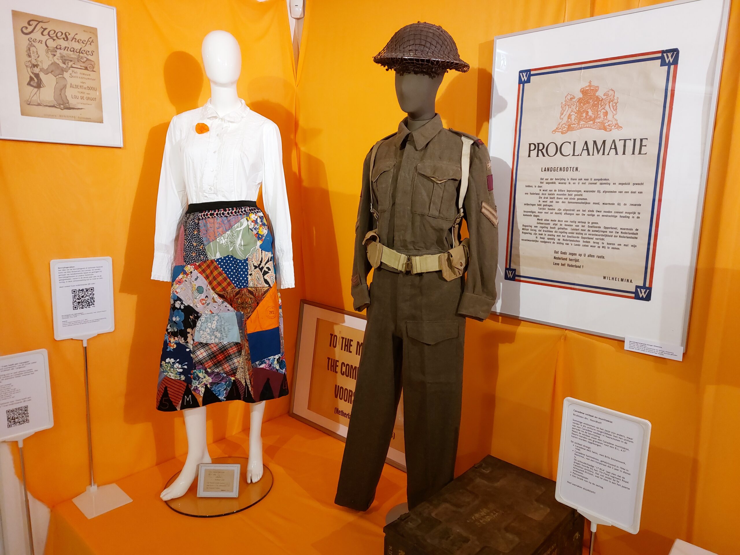 De tentoonstelling toont niet alleen foto’s, filmbeelden, bevrijdingskranten en posters, maar ook allerhande objecten zoals een pot met ingemaakte bloembollen uit de hongerwinter, een in de oorlog gebruikte motorfiets en historische uniformen. Mets vindt vooral de twee getoonde nationale bevrijdingsrokken ontroerend. “Rokken gemaakt van reepjes stof die voor de draagster van het kledingstuk bepaalde persoonlijke gebeurtenissen vertegenwoordigden. Die rokken werden geregistreerd en van een stempel voorzien. We tonen er twee, een uit de eigen collectie en een van een bruikleengever, wiens moeder de rok maakte en bij de bevrijding heeft gedragen.”