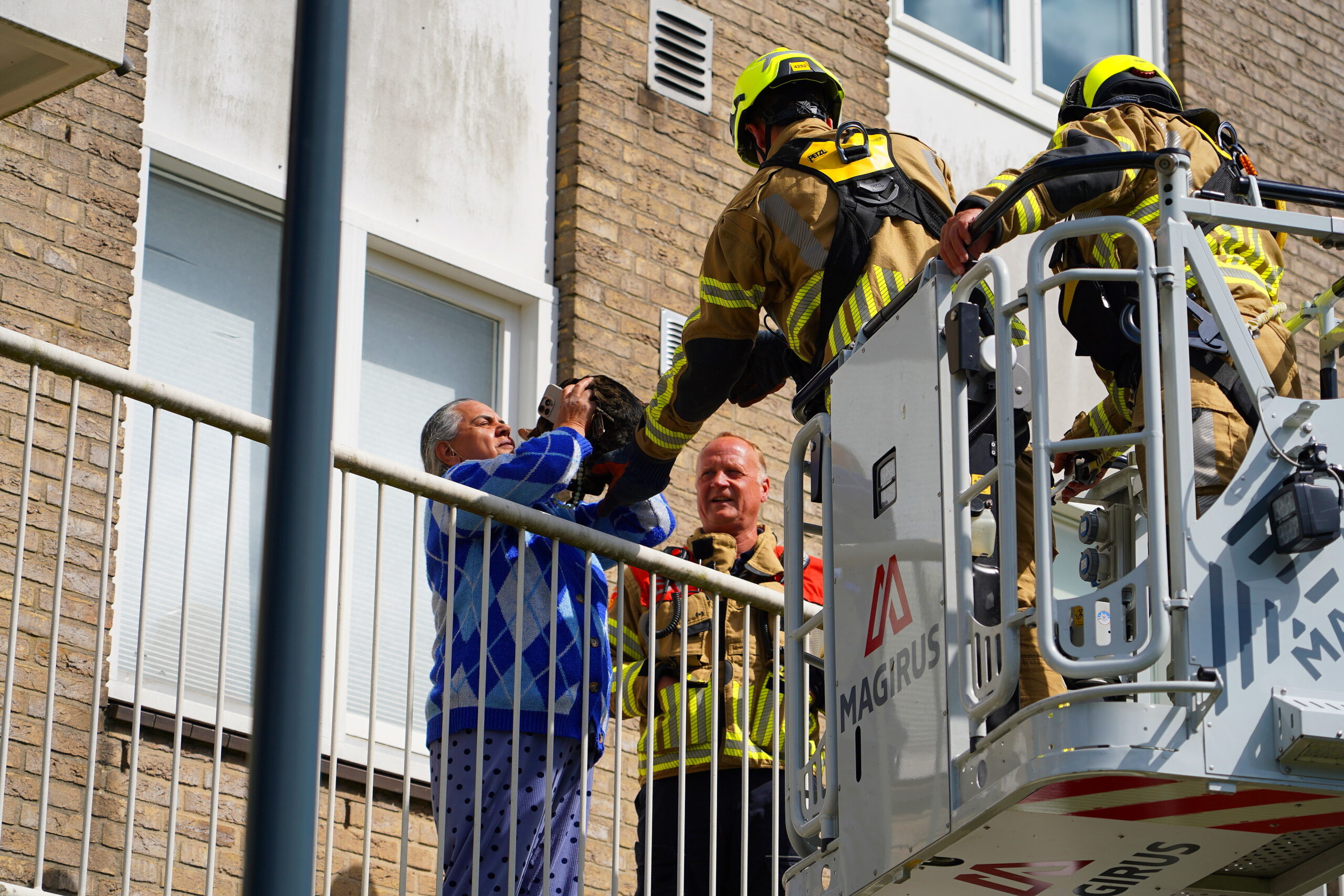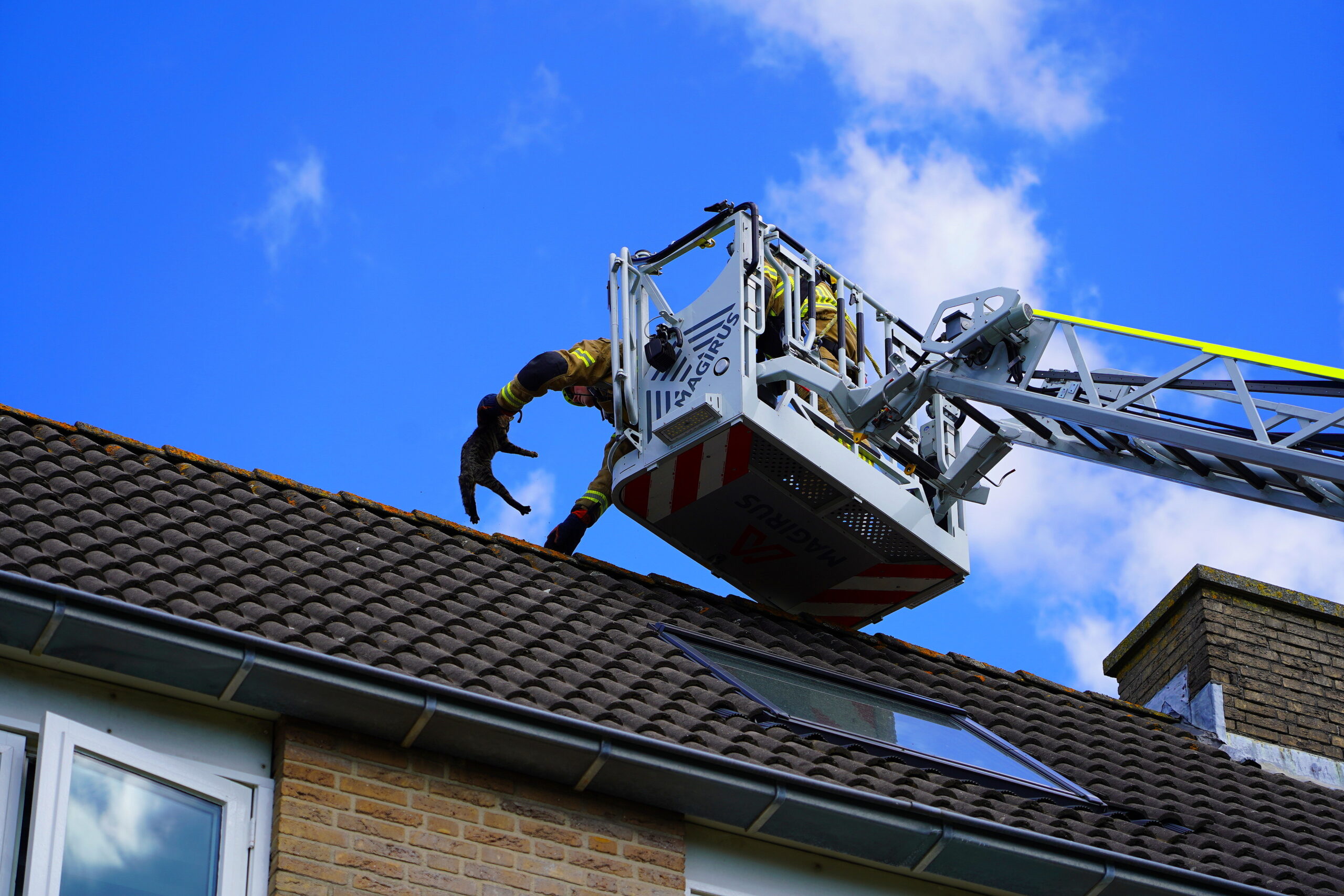 De kat zat op het dak van een huis in de Nellie van Kolstraat. Die loopt parallel aan de Stevenshofdreef. Het diertje durfde niet meer naar beneden en is door de brandweer met behulp van een autoladder van het dak gehaald.