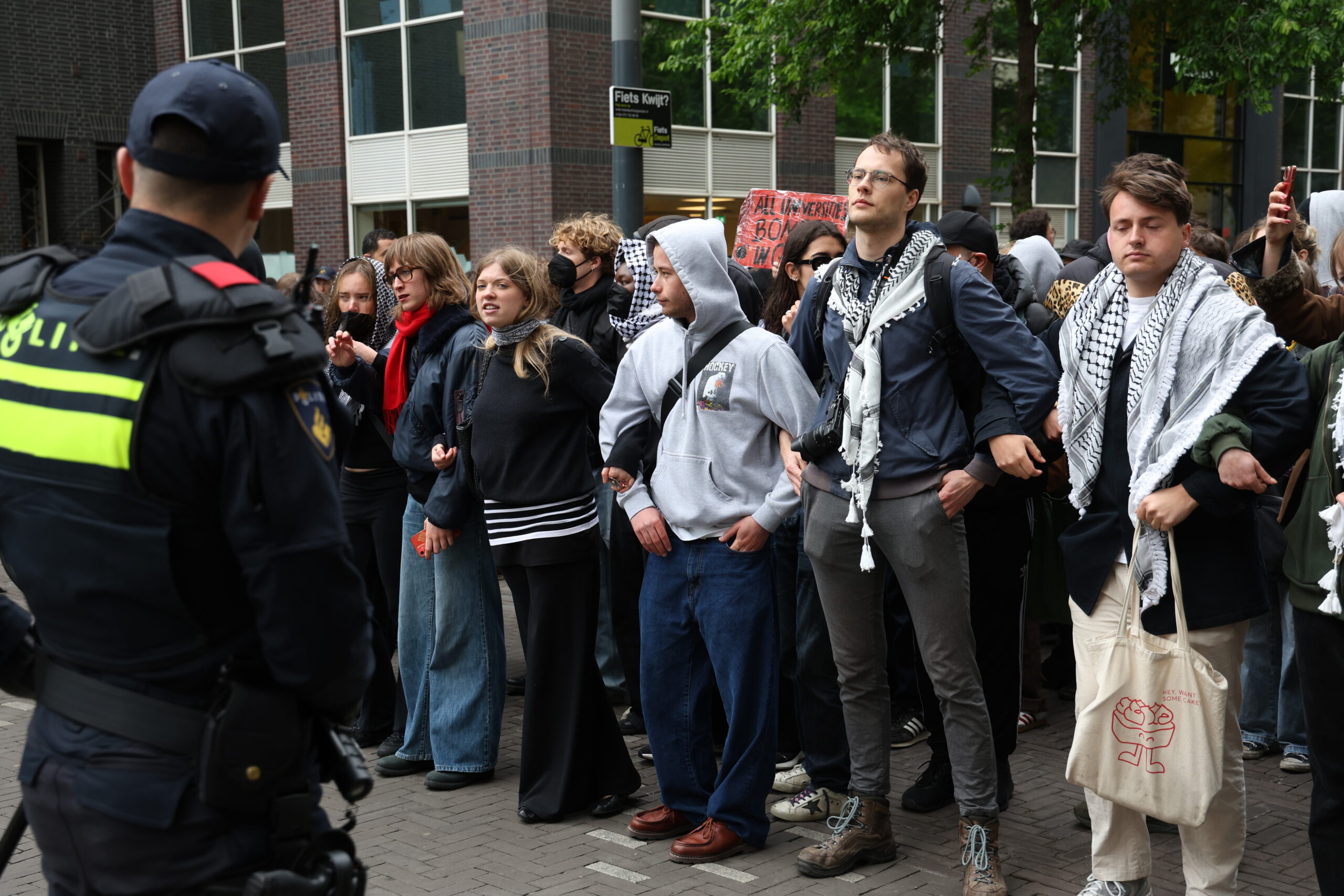 De politie heeft woensdag aan het einde van de middag zo’n 75 demonstranten aangehouden die weigerden de gebouwen van de Universiteit Leiden in Den Haag te verlaten na een pro-Palestina demonstatie bij het gebouw aan de Turfmarkt.