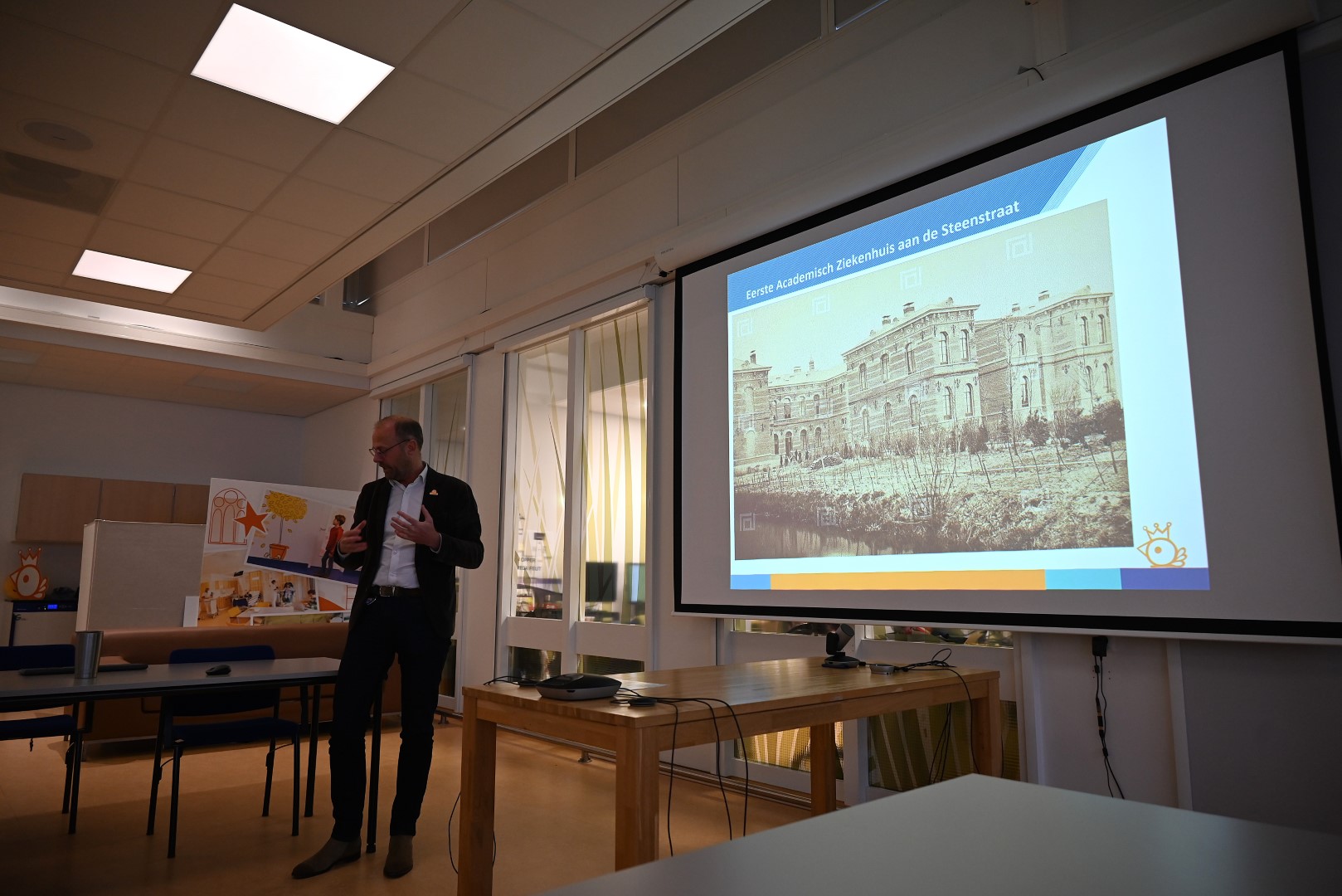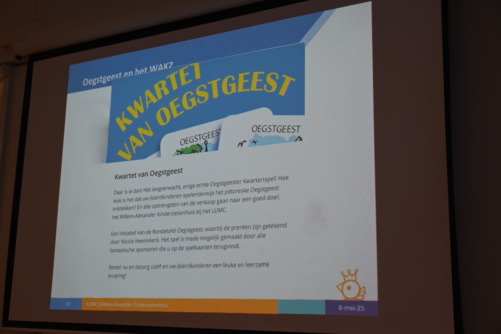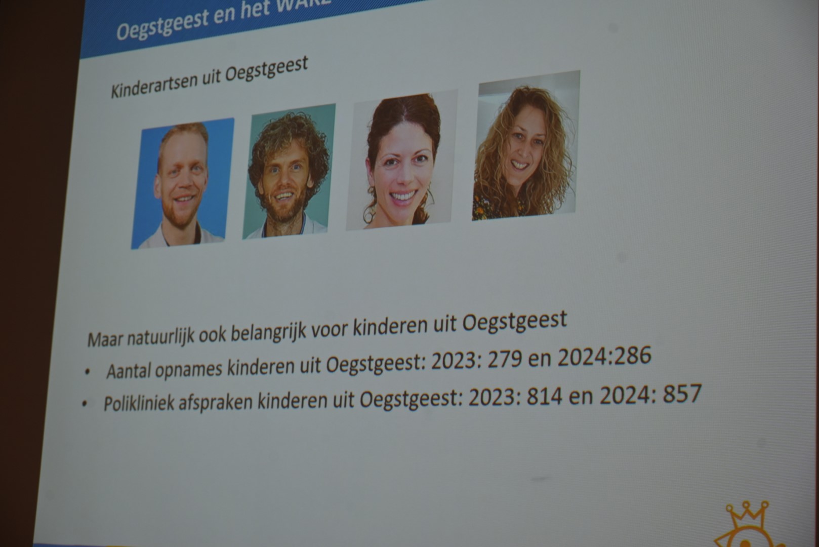 De inleiding over het kinderziekenhuis, door kindercardioloog Arno Roest, was gedeeltelijk aangepast aan het bezoek van de Oegstgeester burgemeester. Roest vertelde dat er vier kinderartsen van het WAKZ uit Oegstgeest komen. Jaarlijks worden er rond de 280 kinderen uit Oegstgeest opgenomen en 1.500 poliklinisch behandeld.