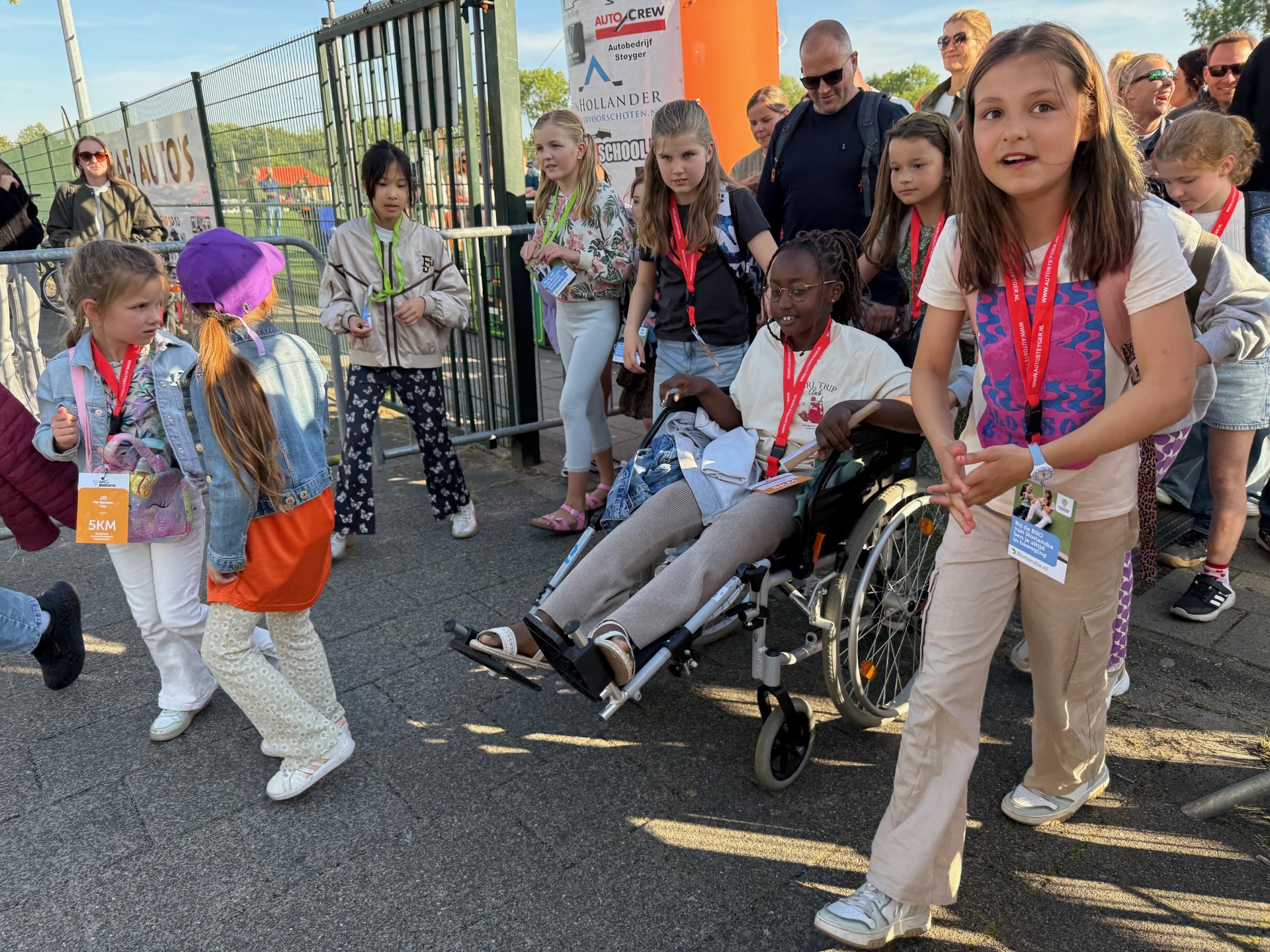 Vriendinnen Maud en Lauren van Basisschool De Regenboog lopen de tien kilometer. “Het is gewoon zo leuk, je krijgt allemaal snoep”, giechelen ze. Getraind hebben ze niet maar ze hebben wel goede schoenen, alhoewel een beetje afgetrapt. En bang voor blaren zijn ze ook niet, ze hebben er gewoon heel veel zin in.