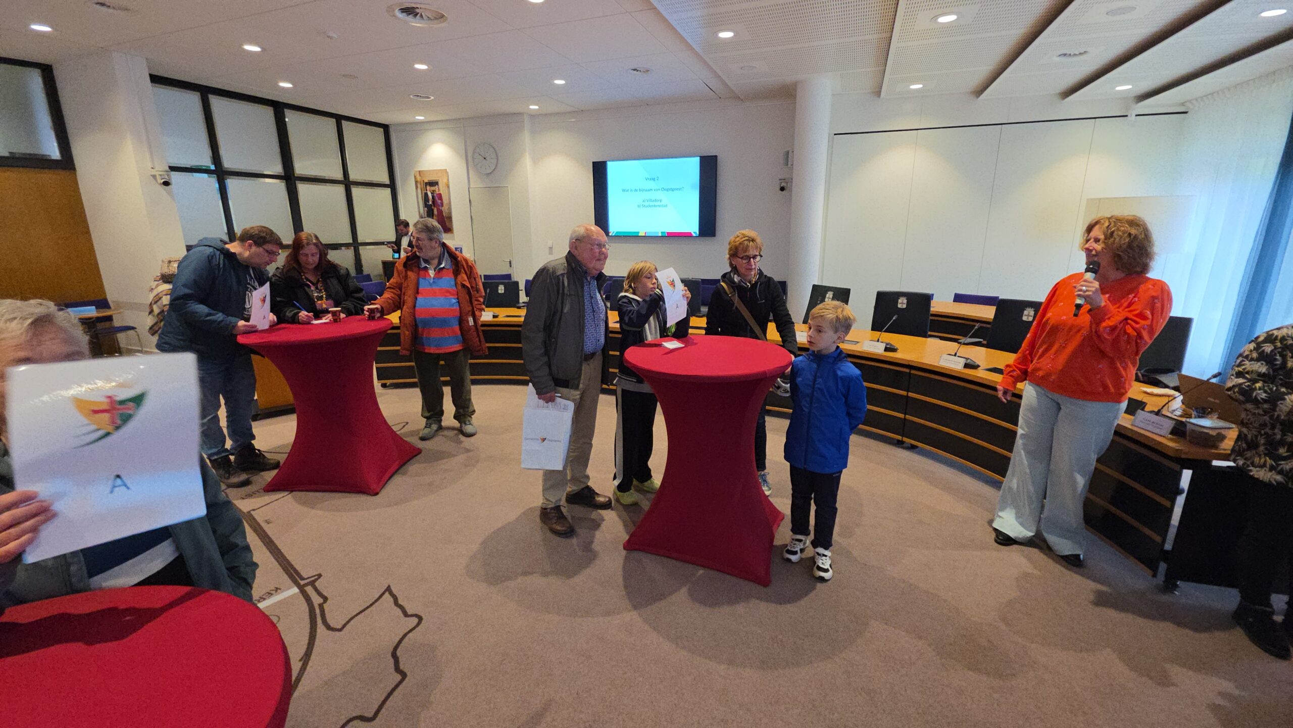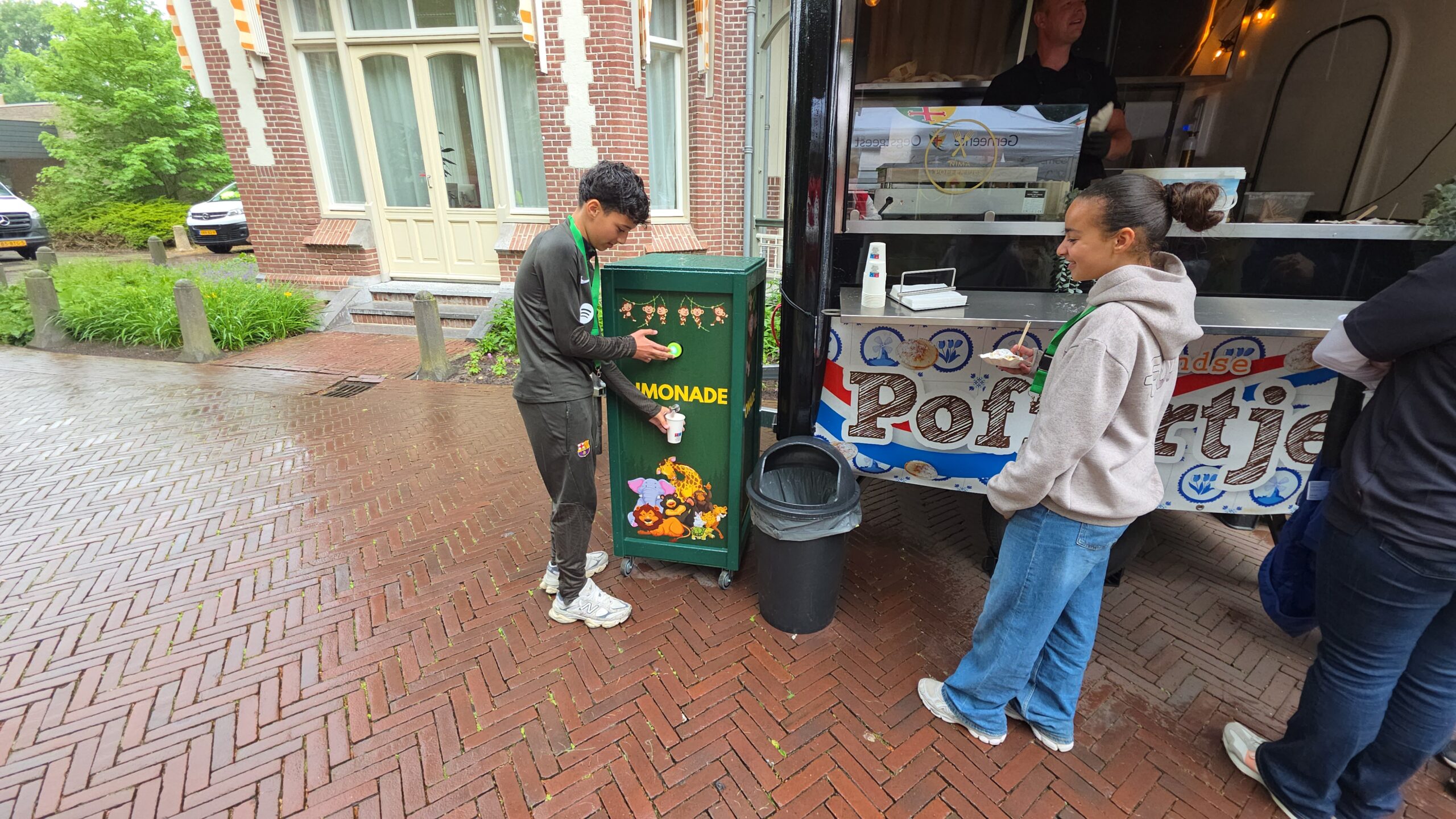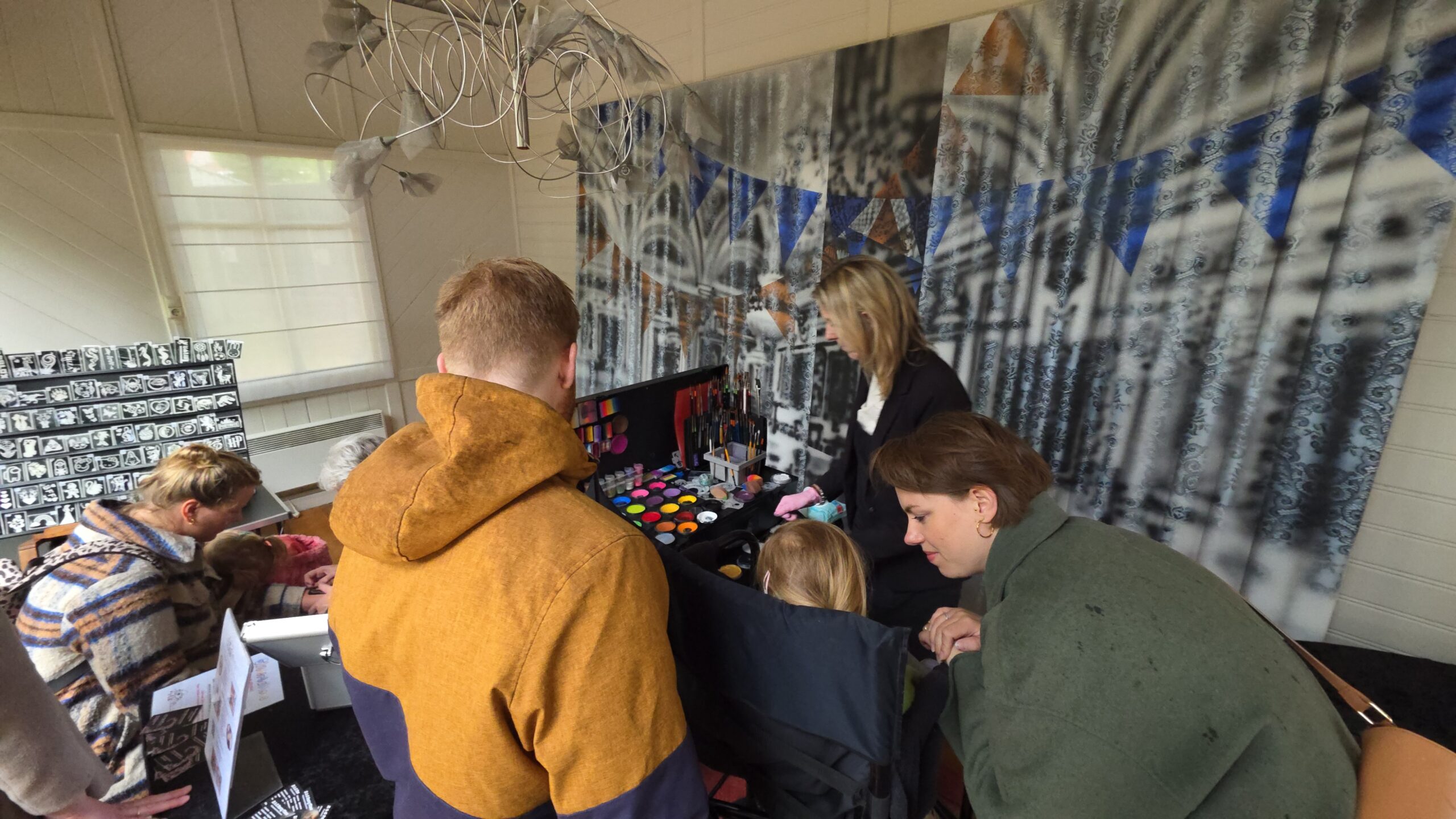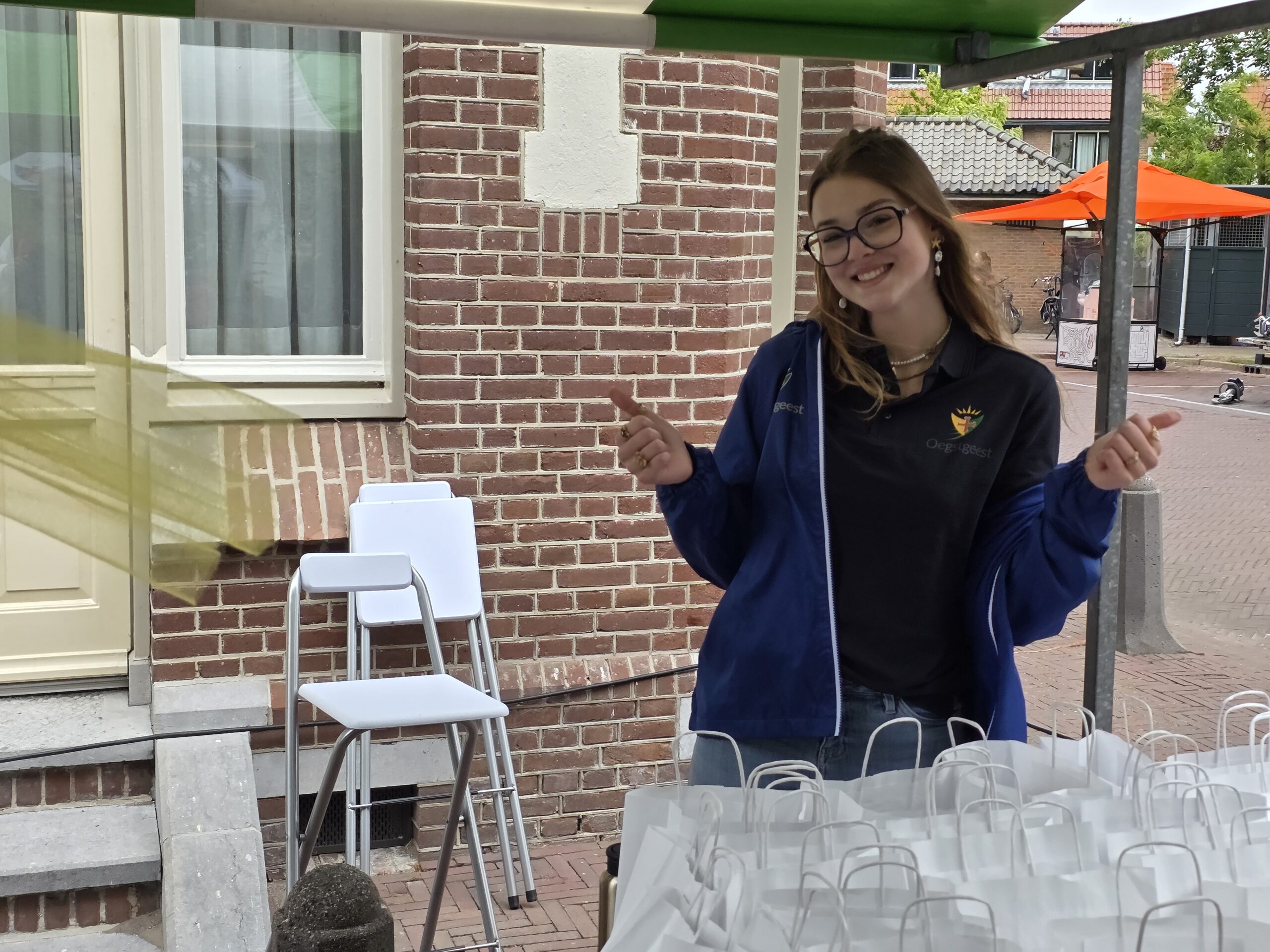Terwijl buiten de paraplu’s hun werk ook deden in de rij voor de poffertjekraam en de andere standjes, vond binnen een proefhuwelijk plaats. Kinderen konden er aan de slag met kleurige pasta om daarmee een eigen ambtsketen te maken en in de raadzaal traden raadsleden op als quizmaster met vragen over Oegstgeest en de taken van het gemeentebestuur. “Wie is de hoogste baas? De gemeenteraad of de burgemeester?”