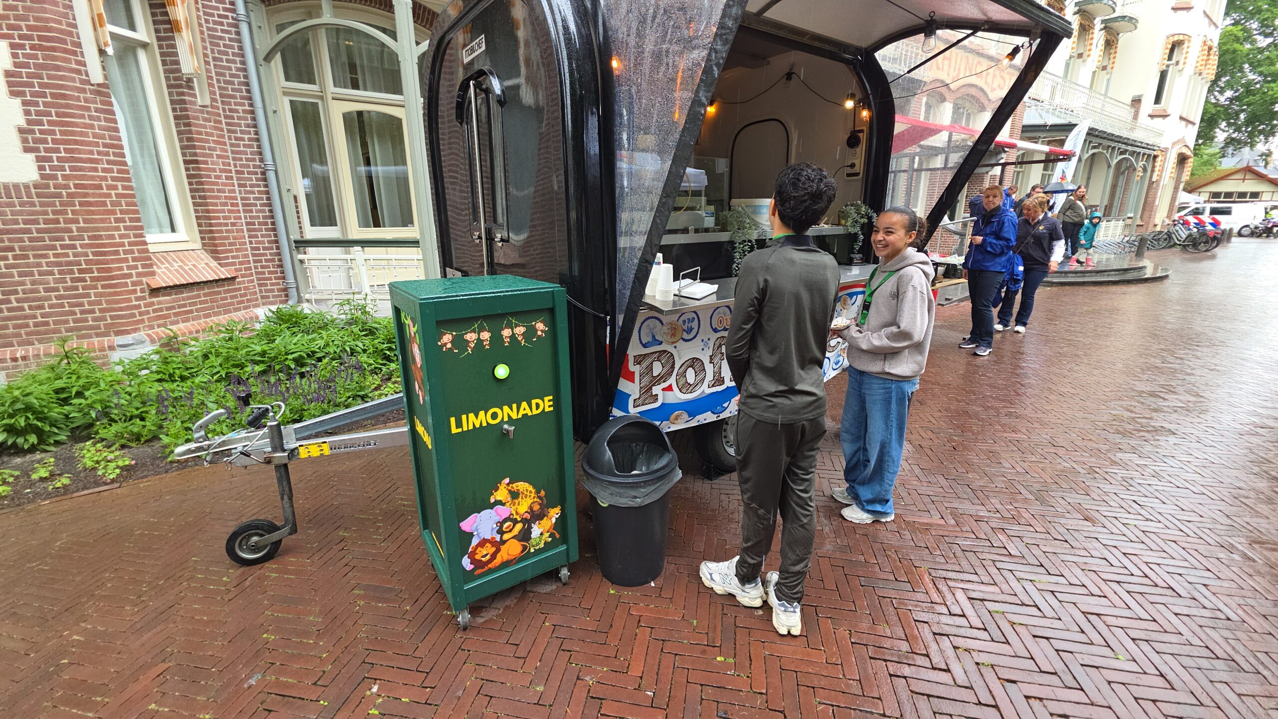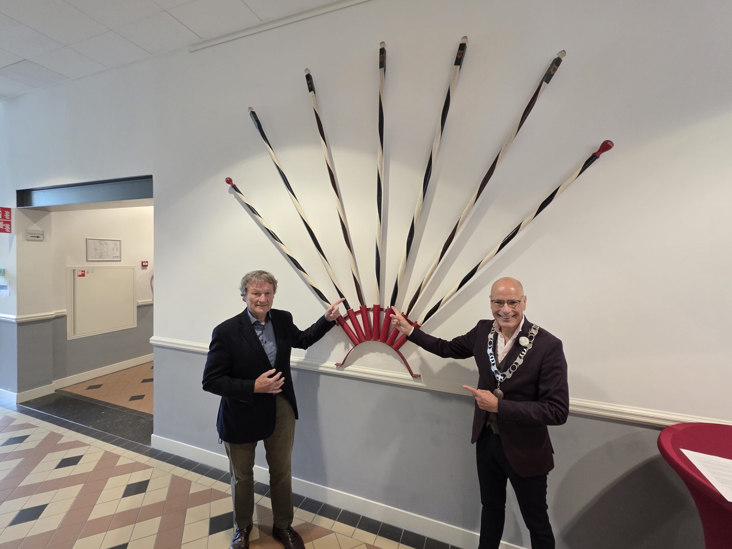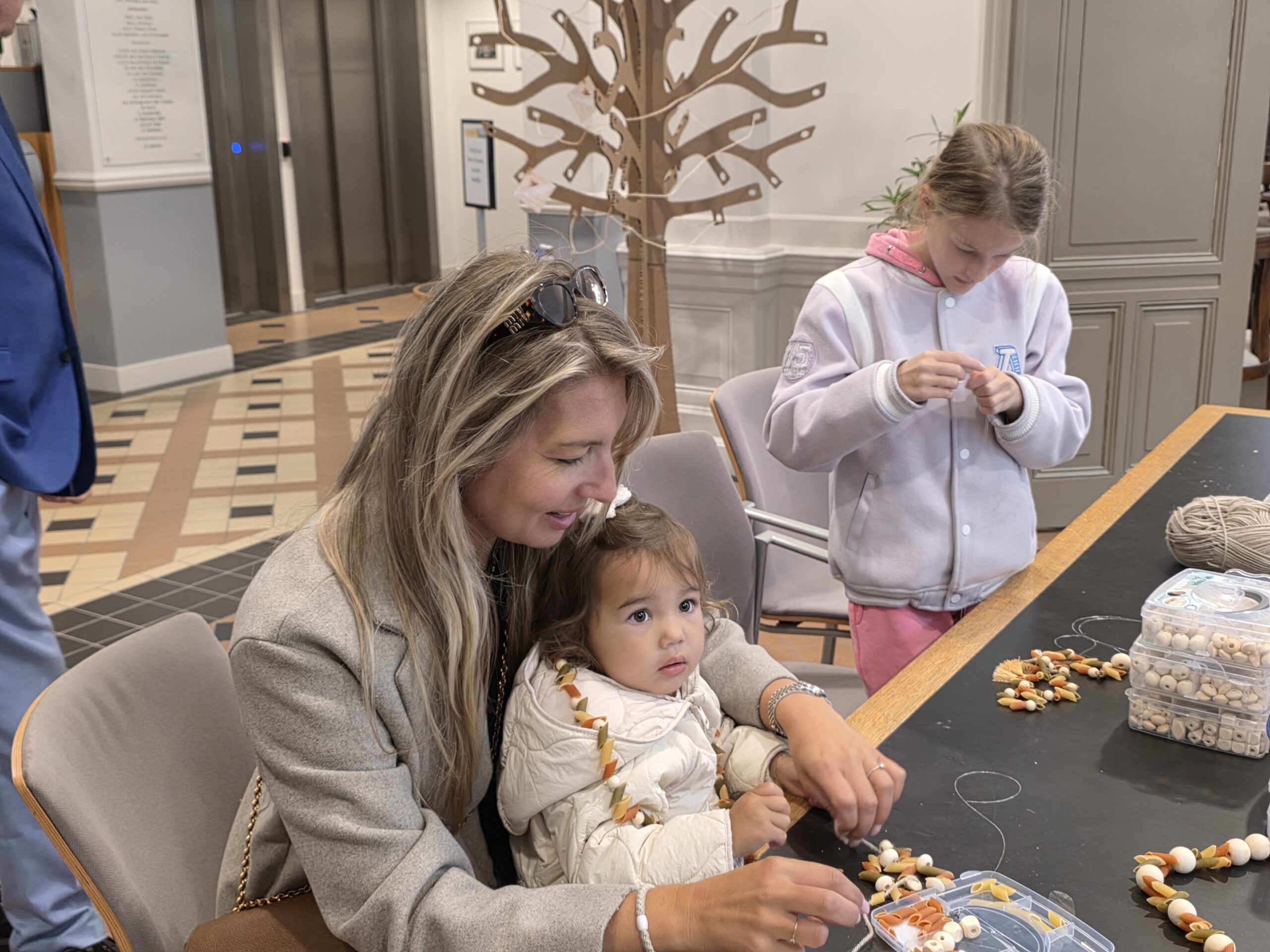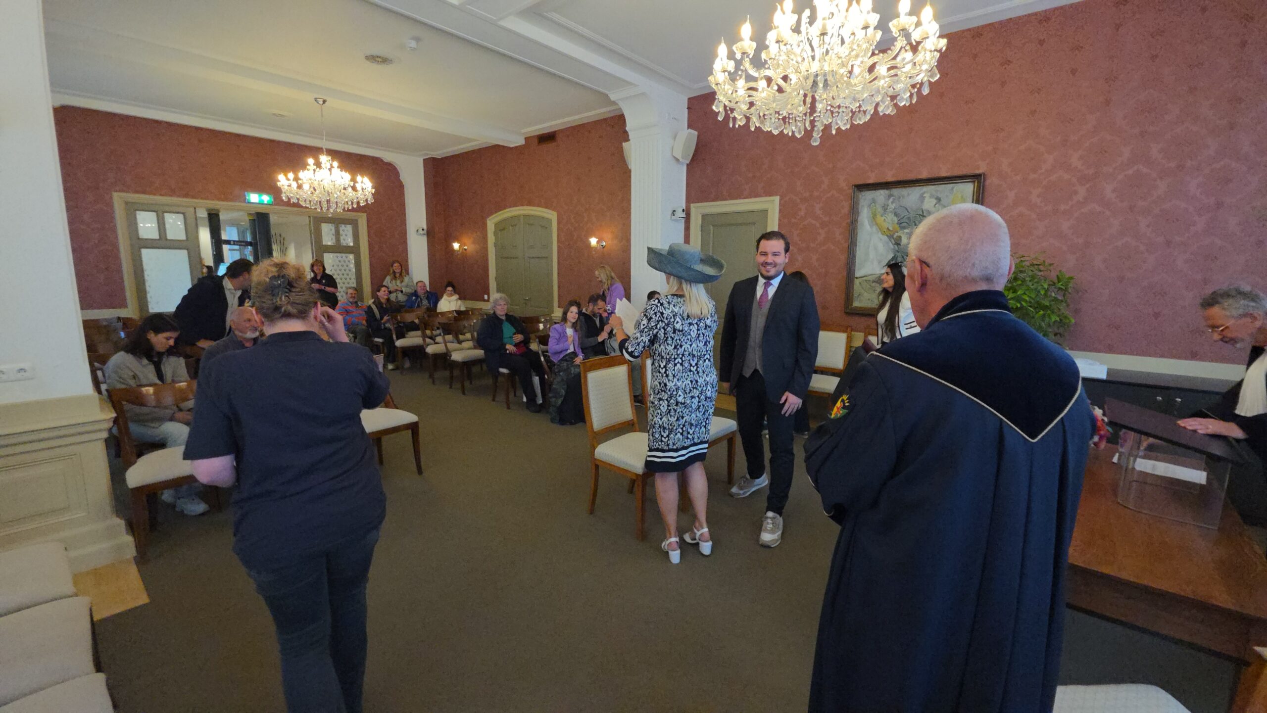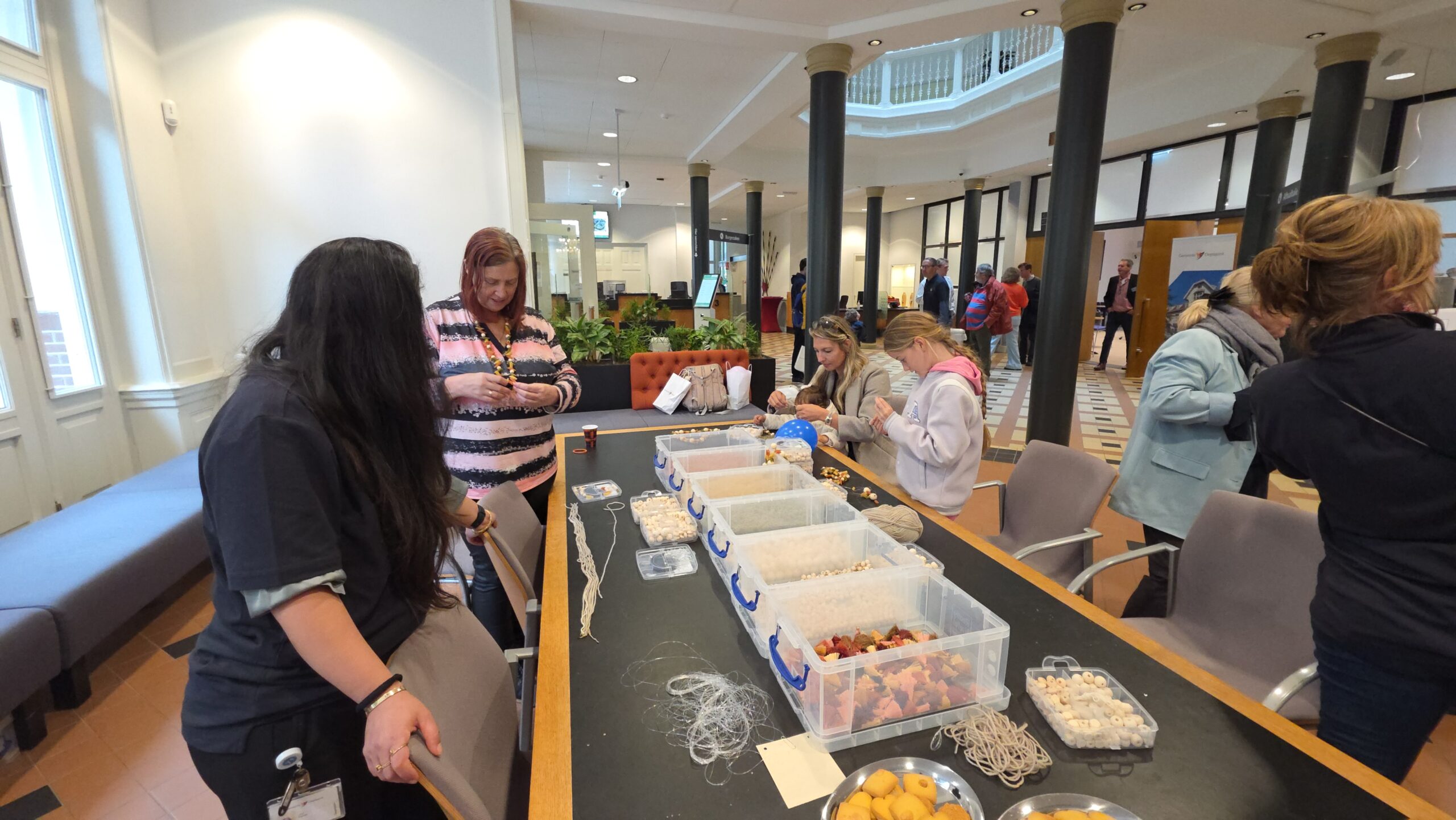 Terwijl buiten de paraplu’s hun werk ook deden in de rij voor de poffertjekraam en de andere standjes, vond binnen een proefhuwelijk plaats. Kinderen konden er aan de slag met kleurige pasta om daarmee een eigen ambtsketen te maken en in de raadzaal traden raadsleden op als quizmaster met vragen over Oegstgeest en de taken van het gemeentebestuur. “Wie is de hoogste baas? De gemeenteraad of de burgemeester?”