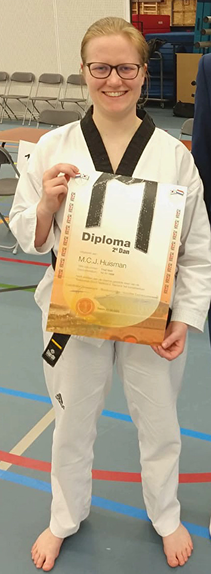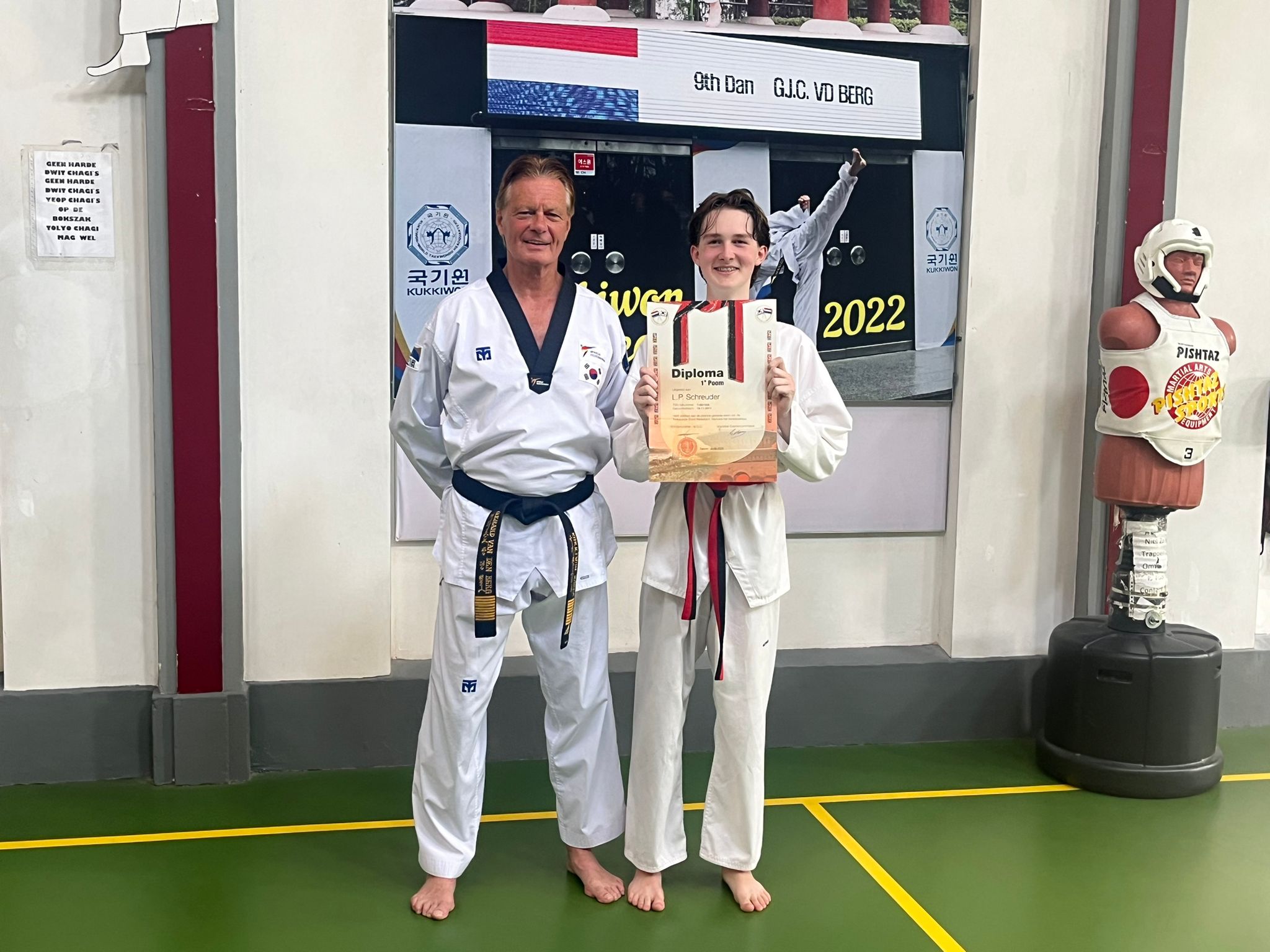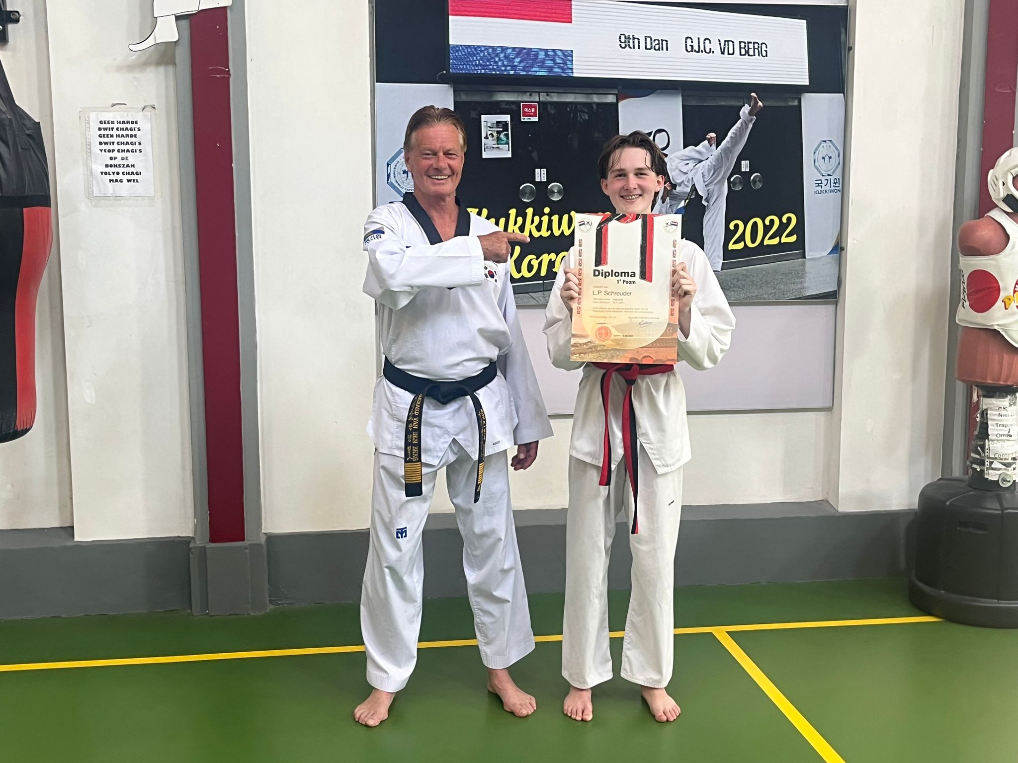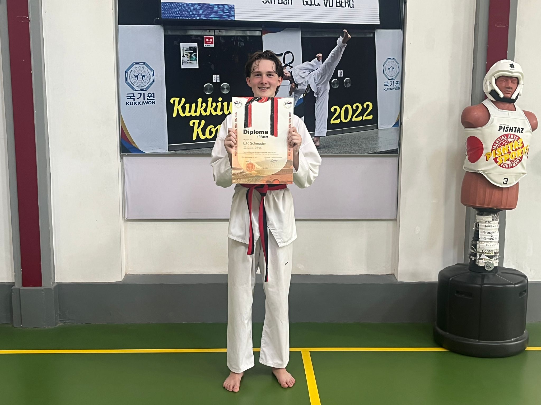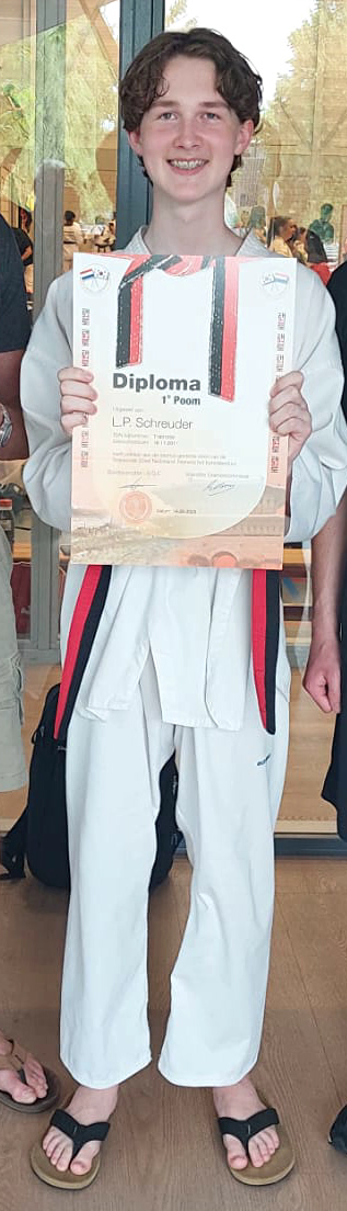 De pas 14-jarige Luke Schreuder behaalde de 1e Poom-graad, een zogenaamde jeugdzwarte band. Een speciale gradatie voor jonge taekwondoka’s onder de 15 jaar. Deze sporters hebben nog niet dezelfde fysieke en mentale vaardigheden als volwassenen, maar beheersen wel de technische vaardigheden. Een mooie prestatie van Schreuder met een mooi uitzicht voor de toekomst in de sport.