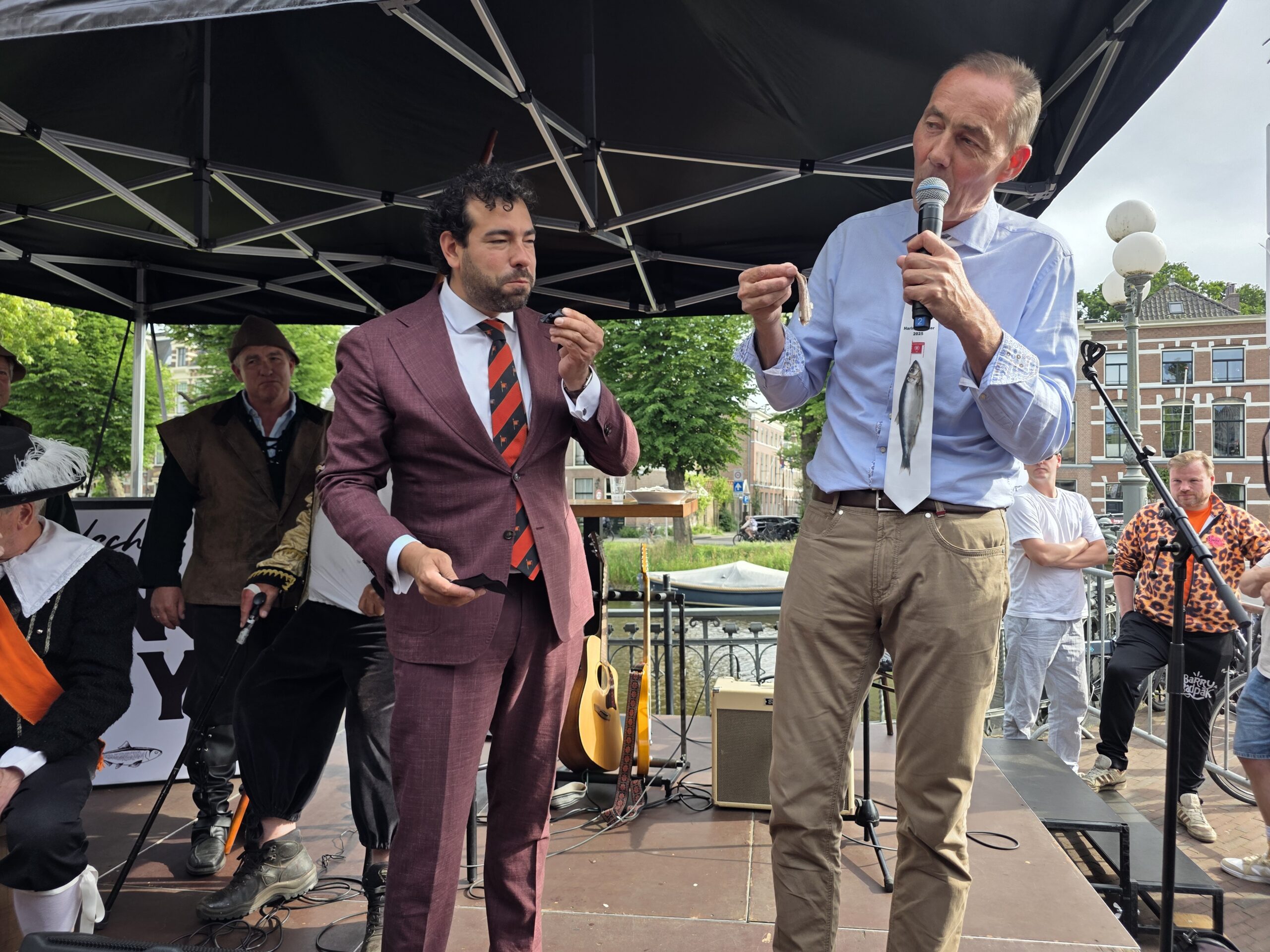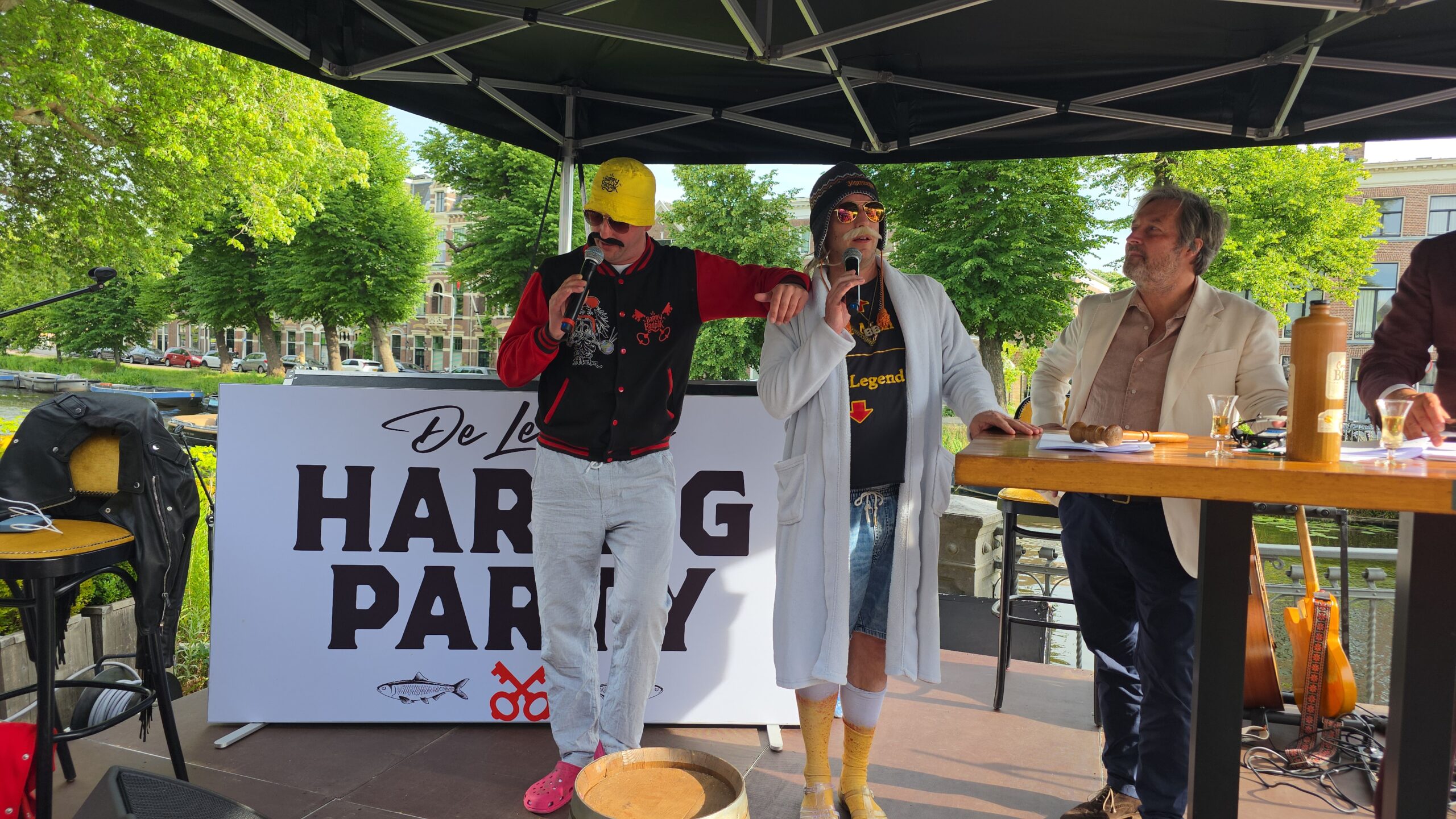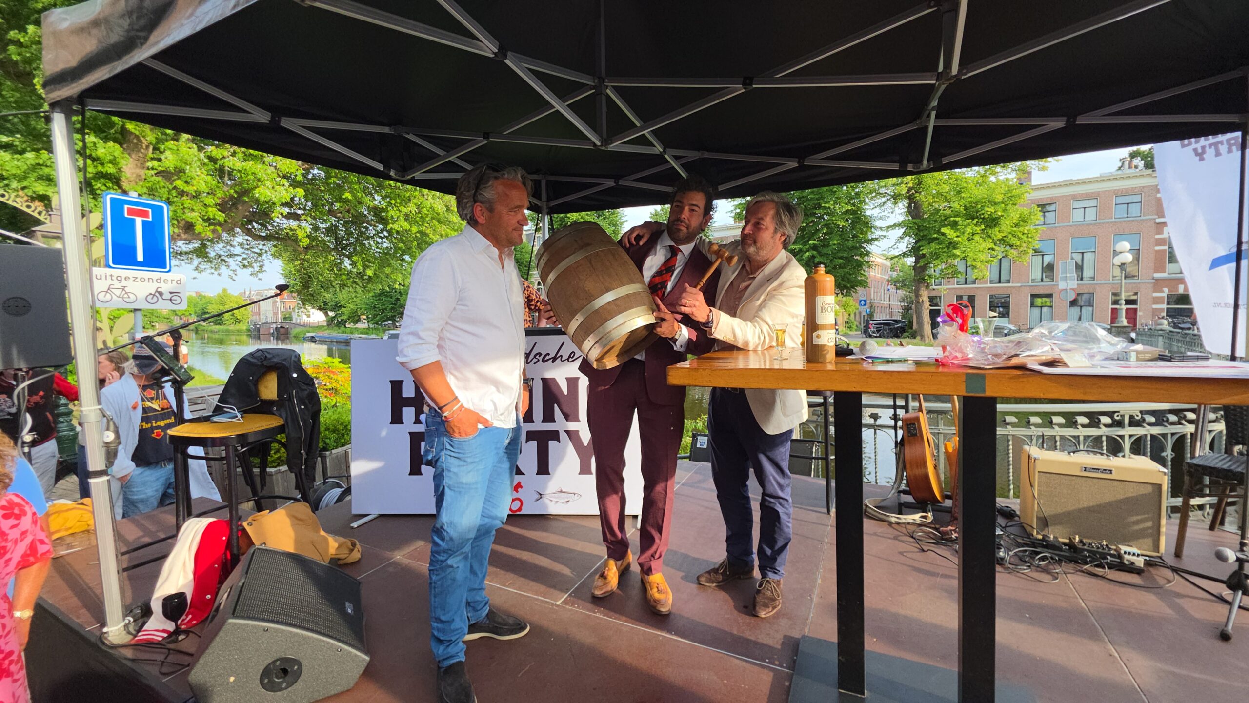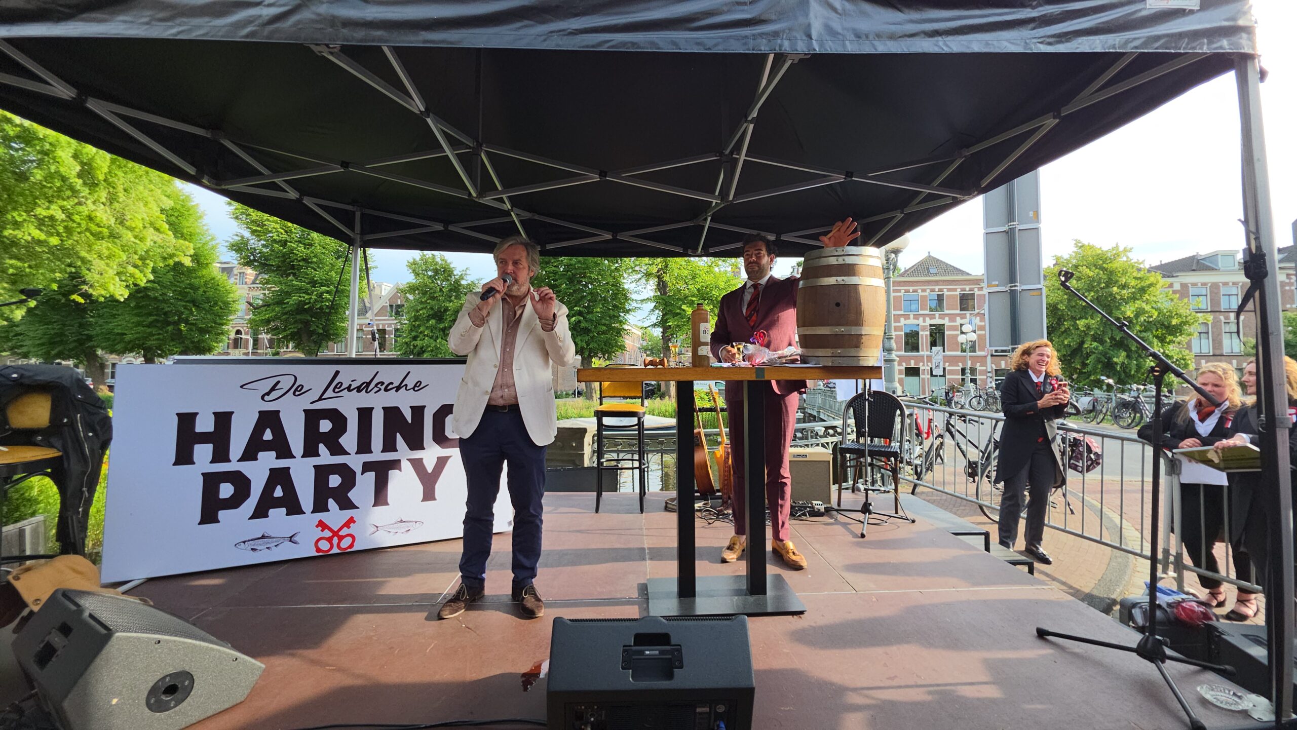 Centraal staat op de haringparty de veiling van het ‘eerste Leidse vaatje haring’. Veilingmeester Pieter-Gerrit Binkhorst van veilinghuis ‘Onder de Boompjes’ hanteerde ook dit jaar weer de hamer. Eerst voor een aantal items die dienden als opwarmertje voor het echte werk. Een avondje mee met Barry Badpak bleek heel populair. Daarnaast kwamen zaken onder de hamer als een taxatie voor een woning of een workshop bij papierkunstenares Astrid Vlasman. Al met al brengen die items 7.000 euro op.