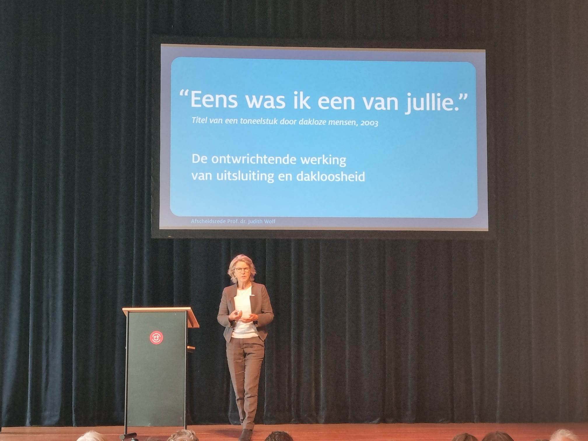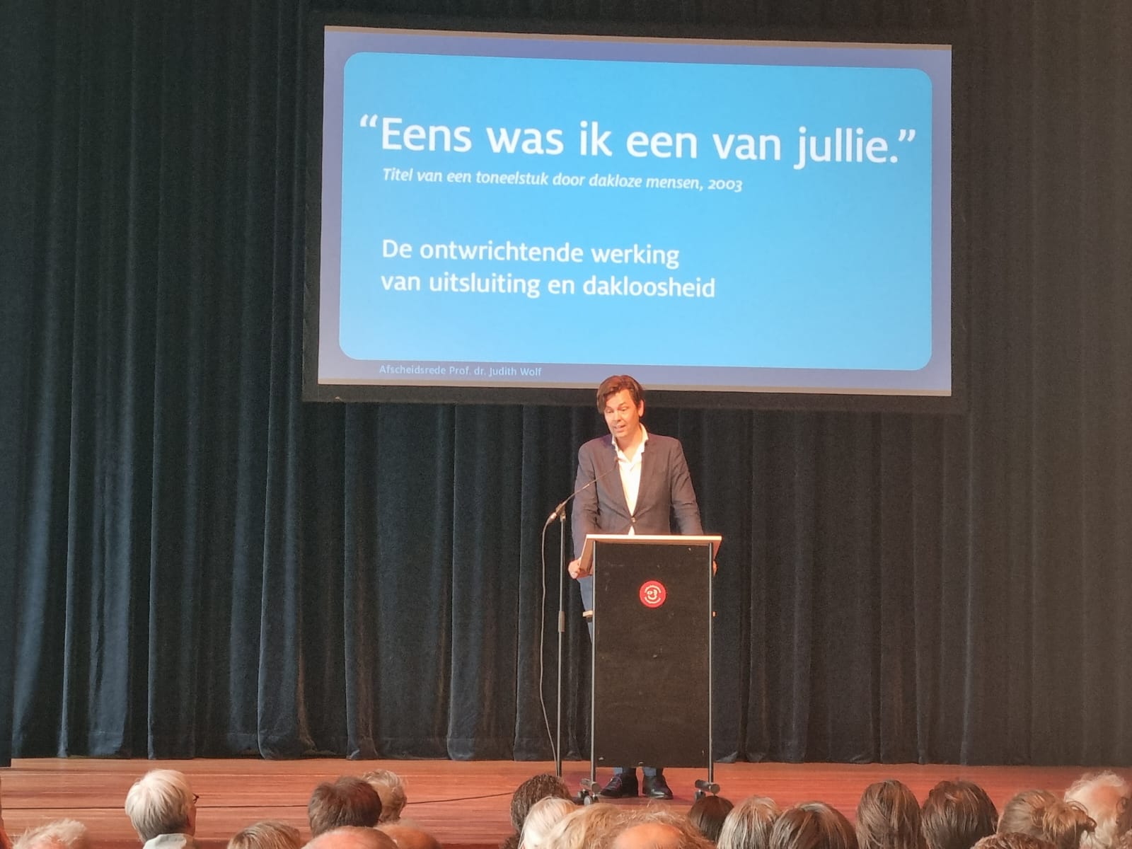 Het afscheid begon met een toespraak van de Leidse wethouder Julius Terpstra. “Normaal doe ik toespraken uit de losse pols, maar nu vind ik het belangrijk om alles te noemen. Dus ik heb het uitgeschreven”, begon hij. Daarna was het de beurt aan hoogleraar Judith Wolf van de Radboud Universiteit. Zij hield haar lezing ‘Eens was ik een van jullie’, over de ontwrichtende werking van uitsluiting en dakloosheid. De problematiek rondom dak-en thuisloosheid werd haarfijn uiteengezet en er werd naar oplossingen gezocht.