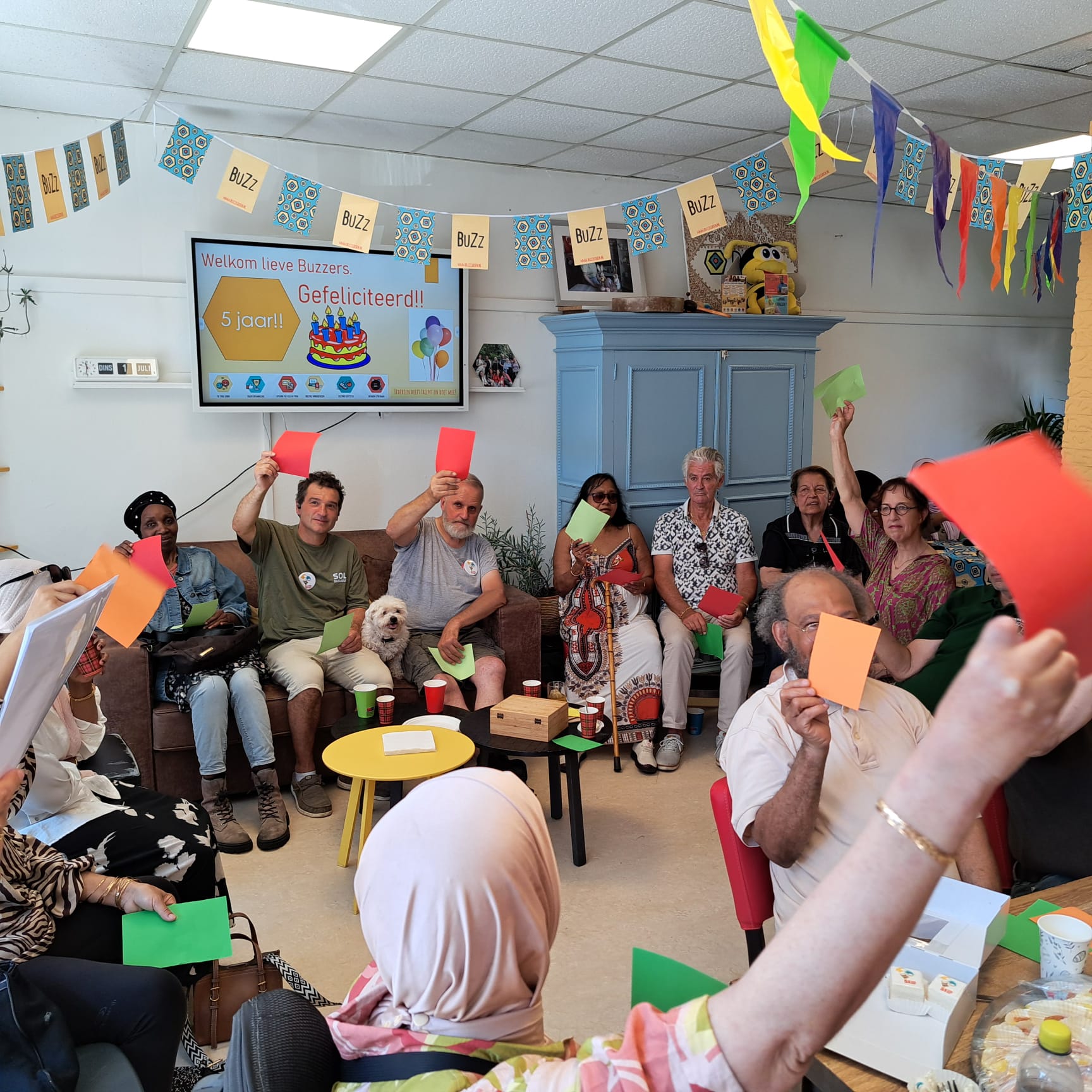 “Happy BuZz-day to you”, klonk het in de Buurtontmoetingsplek in Leiden-Zuidwest. De huiskamer van de buurt zat dinsdag 1 juli stampvol, ondanks de warmte. Vijf jaar geleden begonnen BuZz Leiden, SOL Leiden en Incluzio Leiden met hun gezamenlijke welzijnsopdracht in Leiden. Een sterke sociale basis voor iedereen.