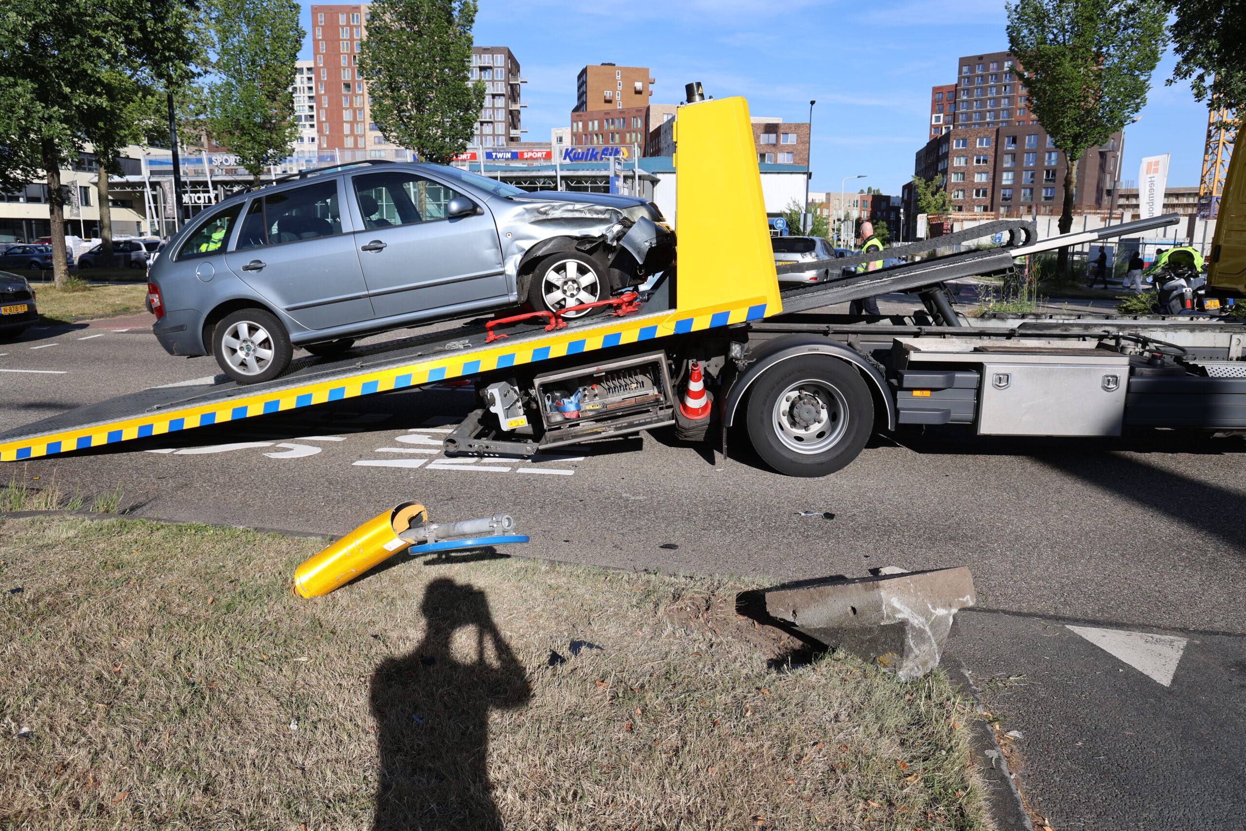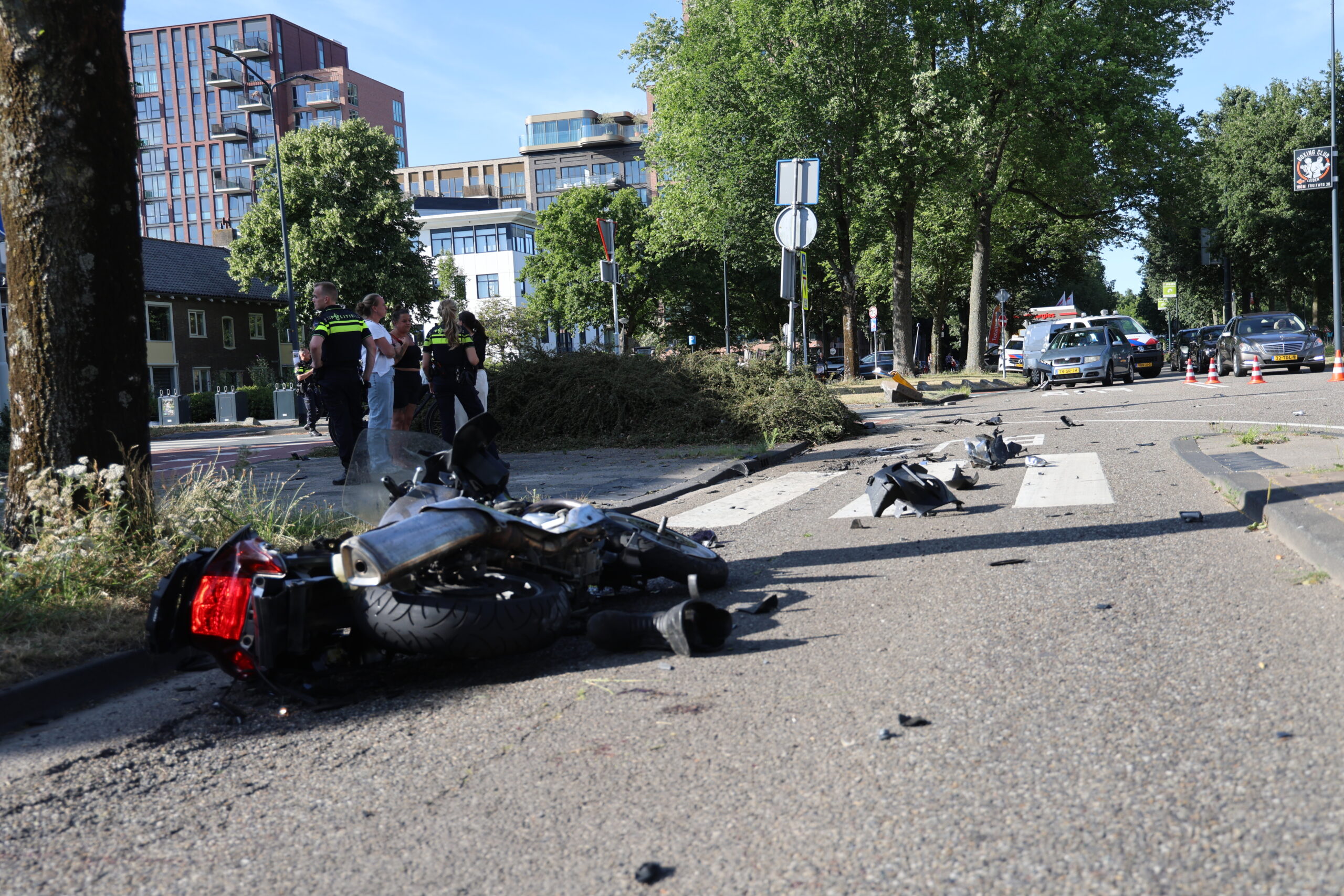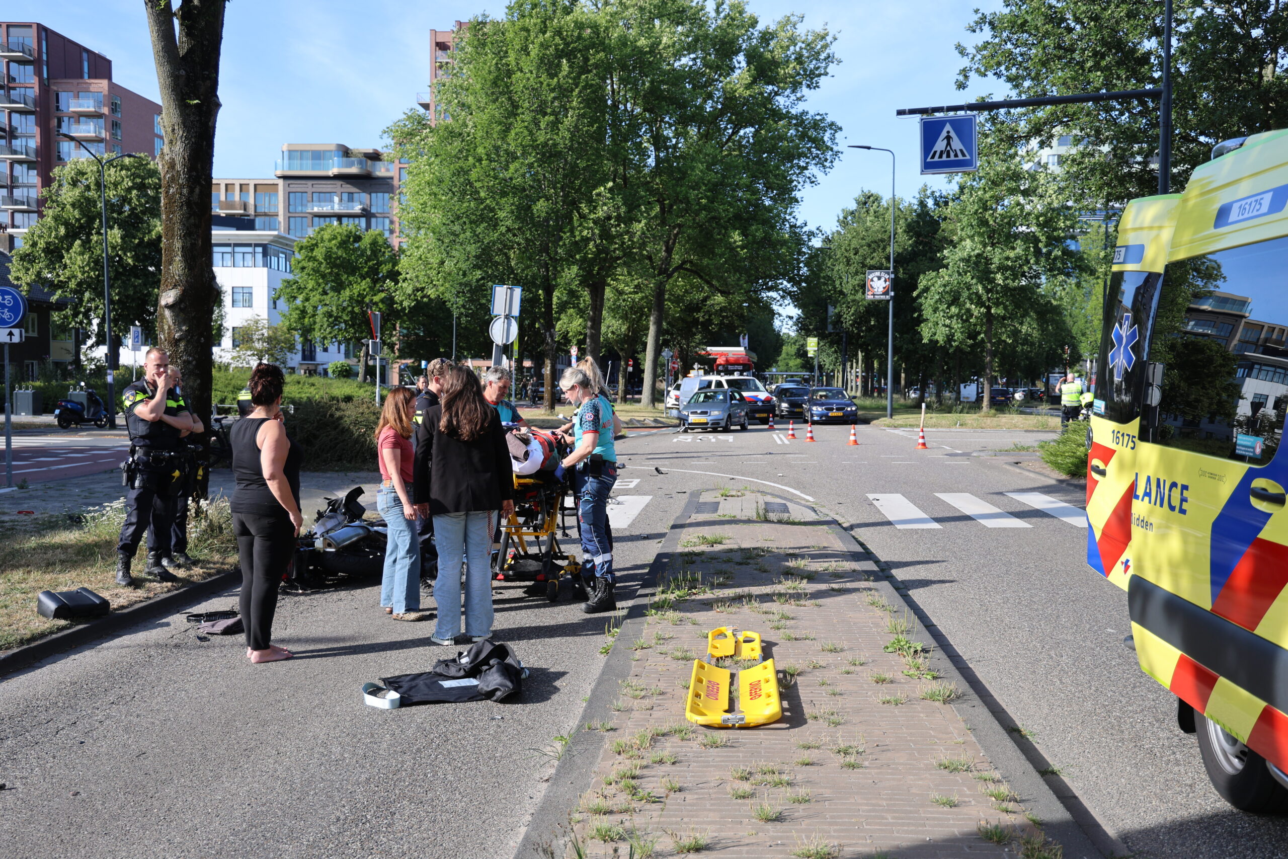 De aanrijding vond vrijdagavond rond 18.30 uur plaats op de kruising van de Lammenschansweg met de Tomatenstraat. De motor raakte daarbij zeer zwaar beschadigd. Ook de auto moest worden weggesleept. Volgens omstanders die getuige waren van de botsing reed de motorrijder veel te hard. De politie doet daar onderzoek naar.