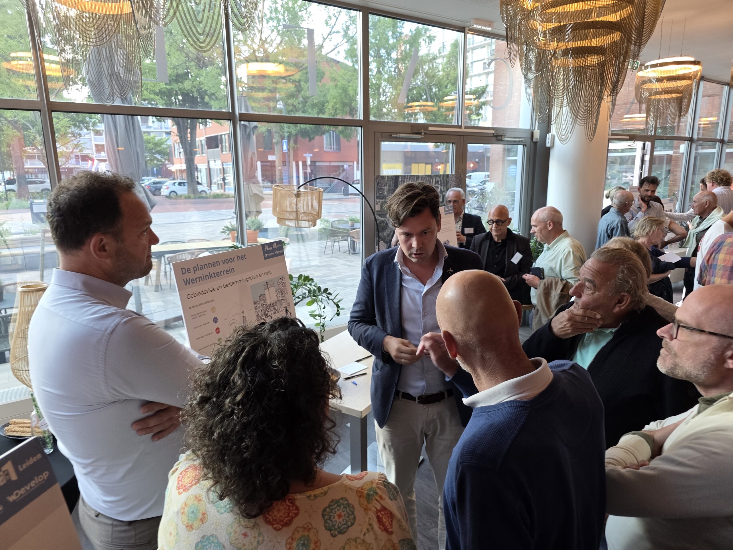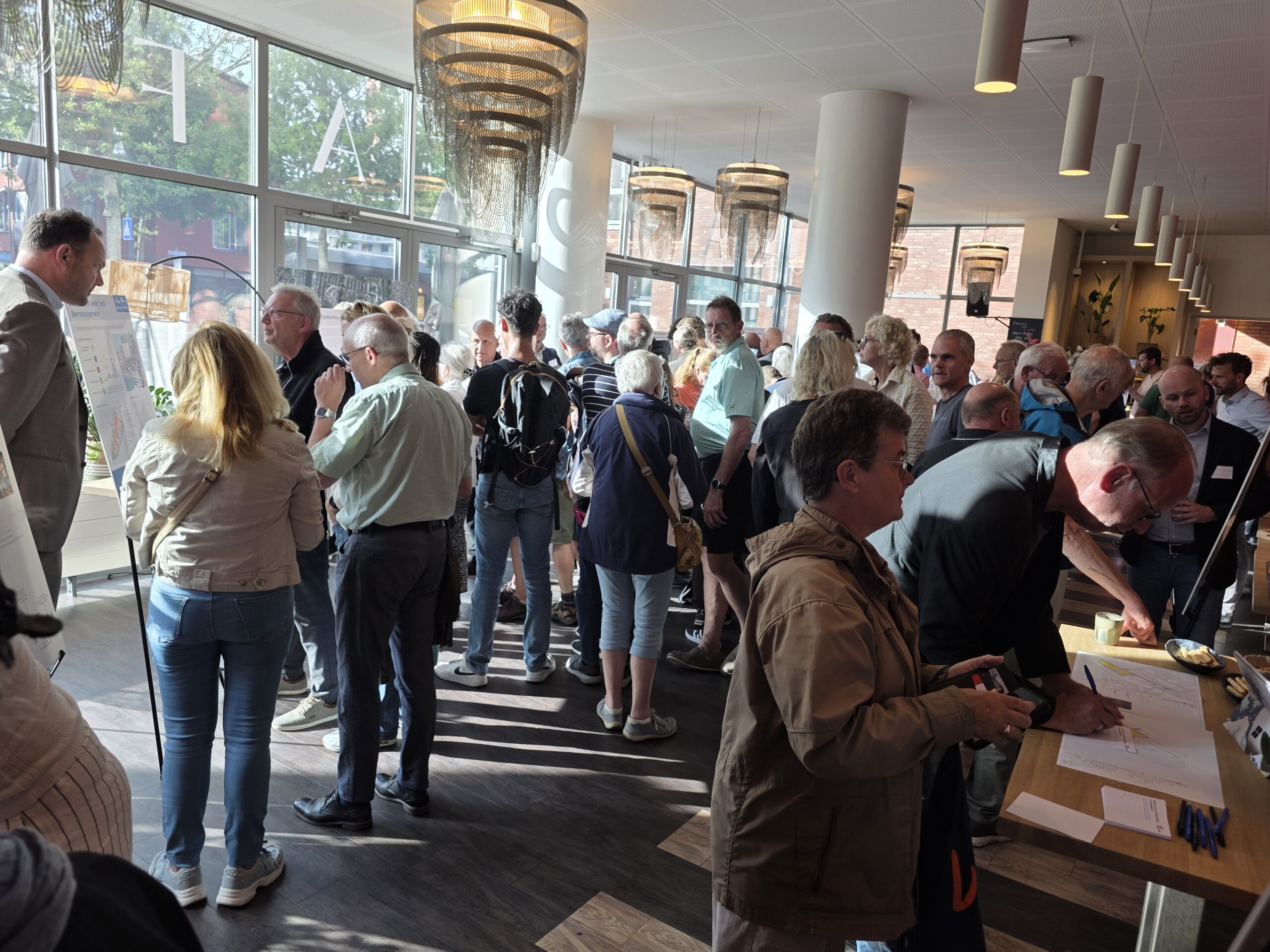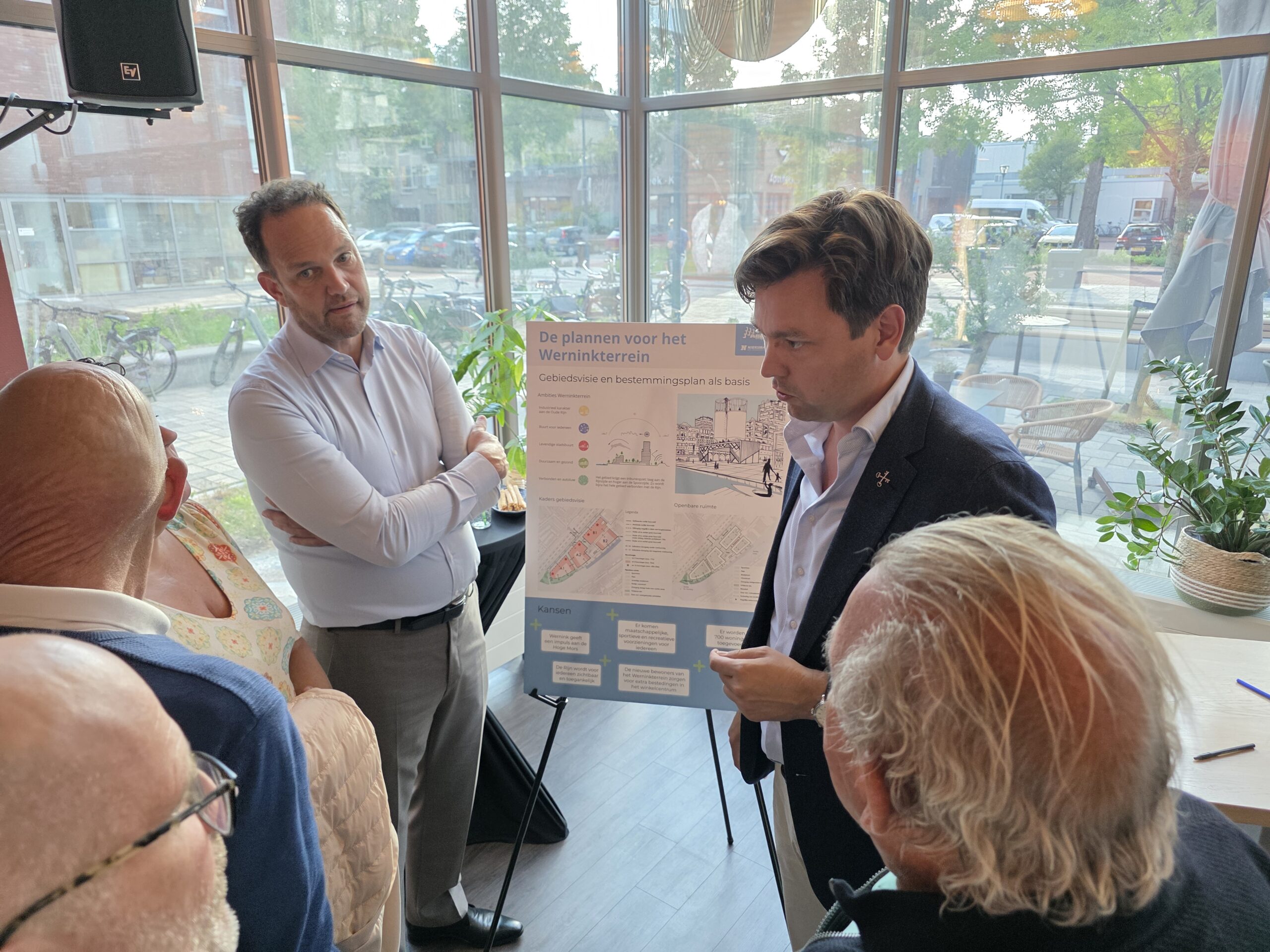 Wethouder Julius Terpstra geeft een toelichting op de nieuwste variant van de plannen. Ook sprake Sleutelstad met een aantal belangstellenden die naar de inloopavond bij Grand Café Deksels aan het Granaatplein waren gekomen.