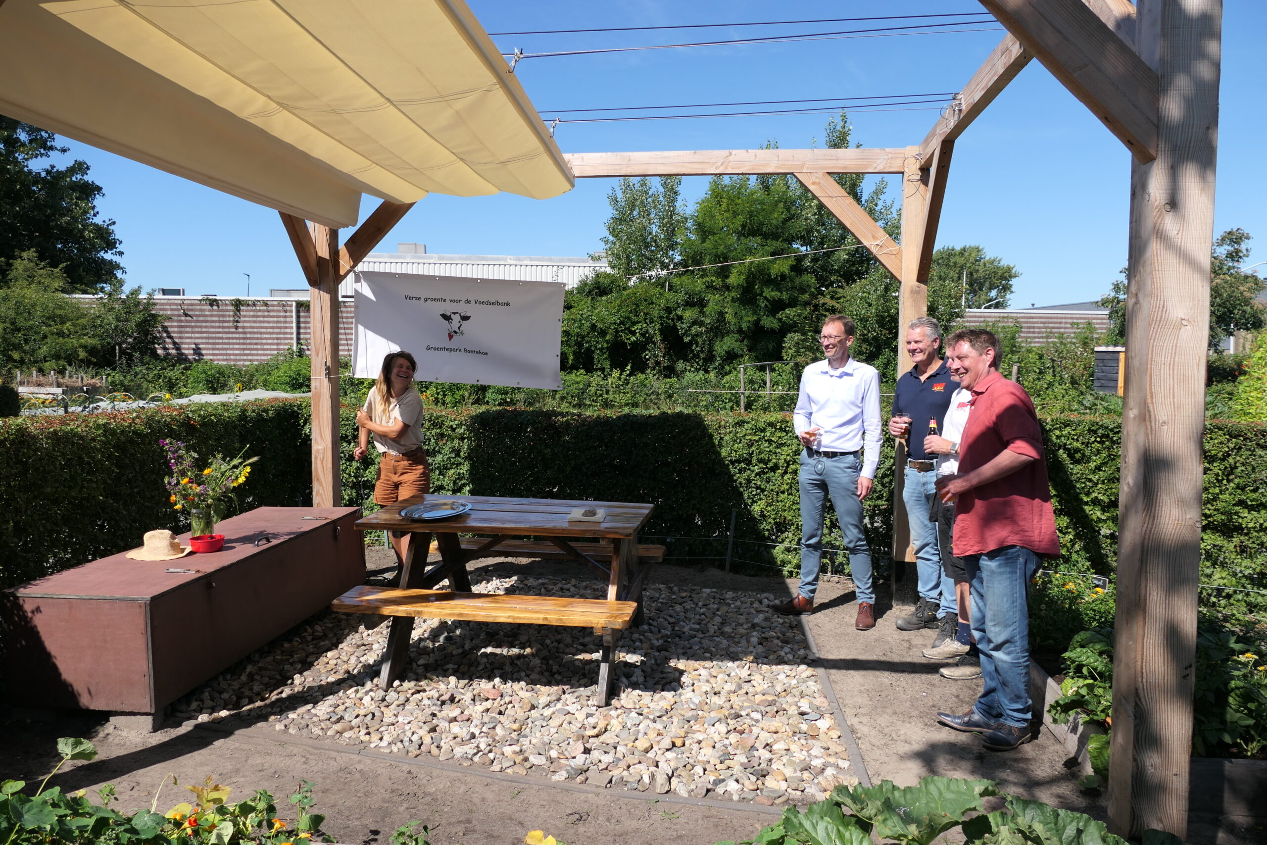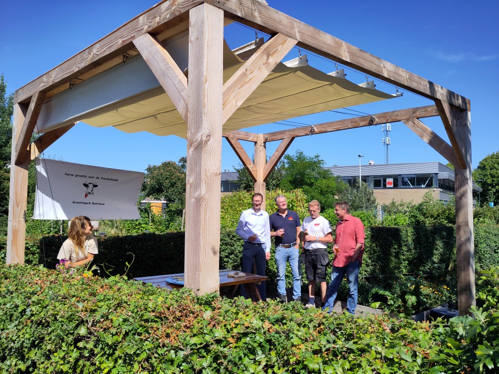 Bijna-buren Jobo de Bouwers en Houthandel Jongeneel van Groentepark Bontekoe hebben de vrijwilligers van de moestuin voor de Voedselbank Leiden e.o. verrast met een pergola met in- en uitschuifbaar doek.