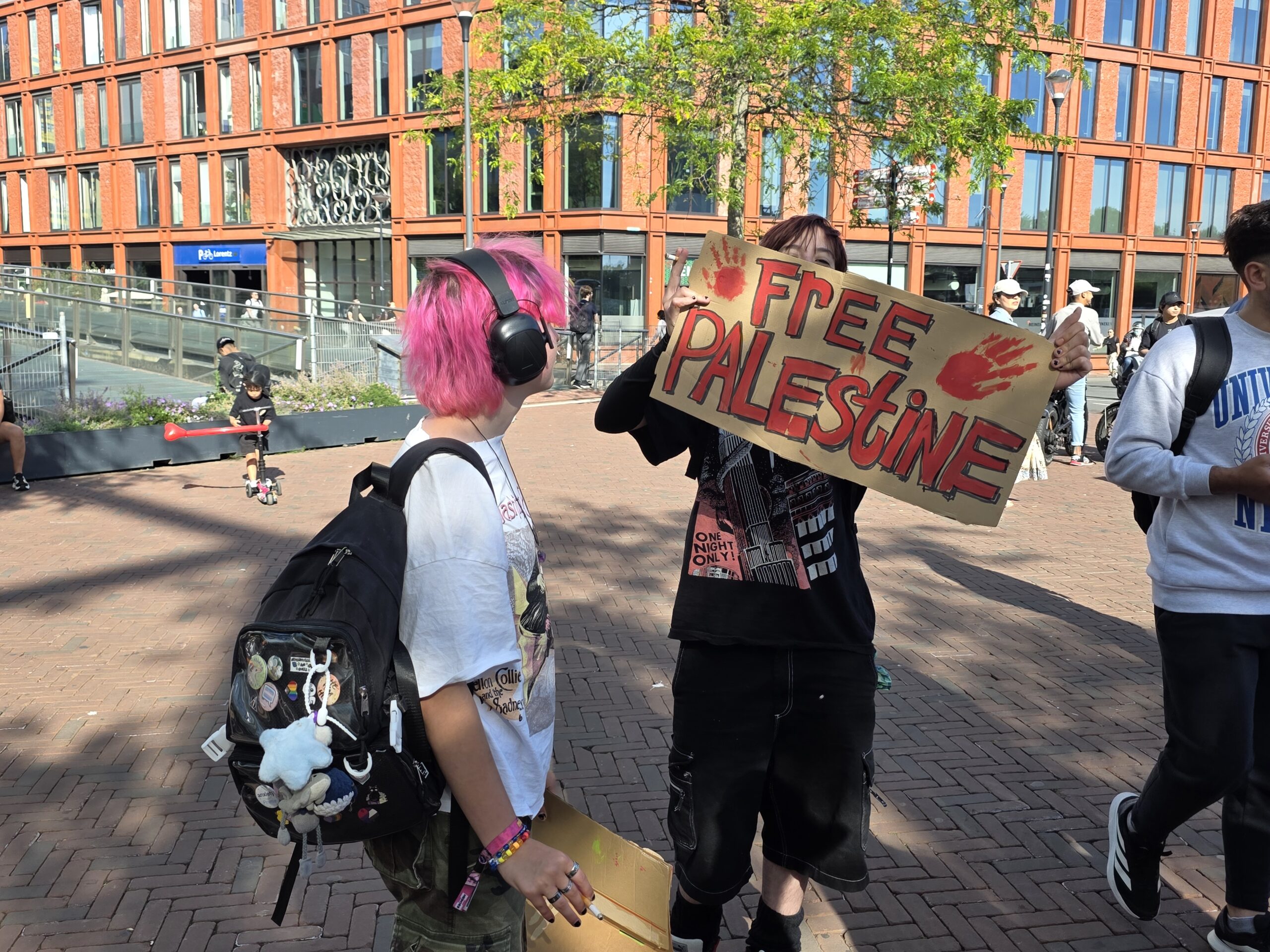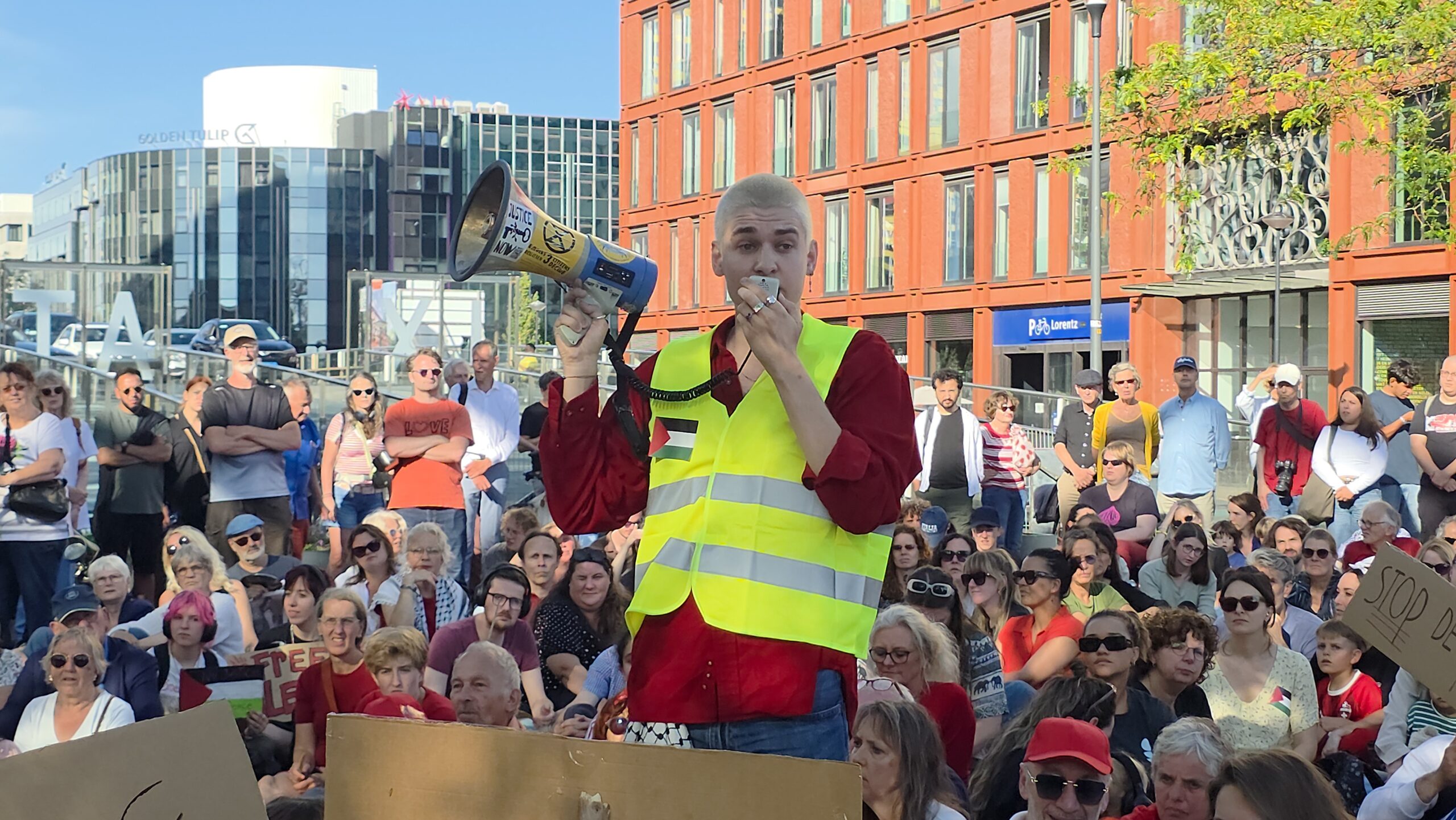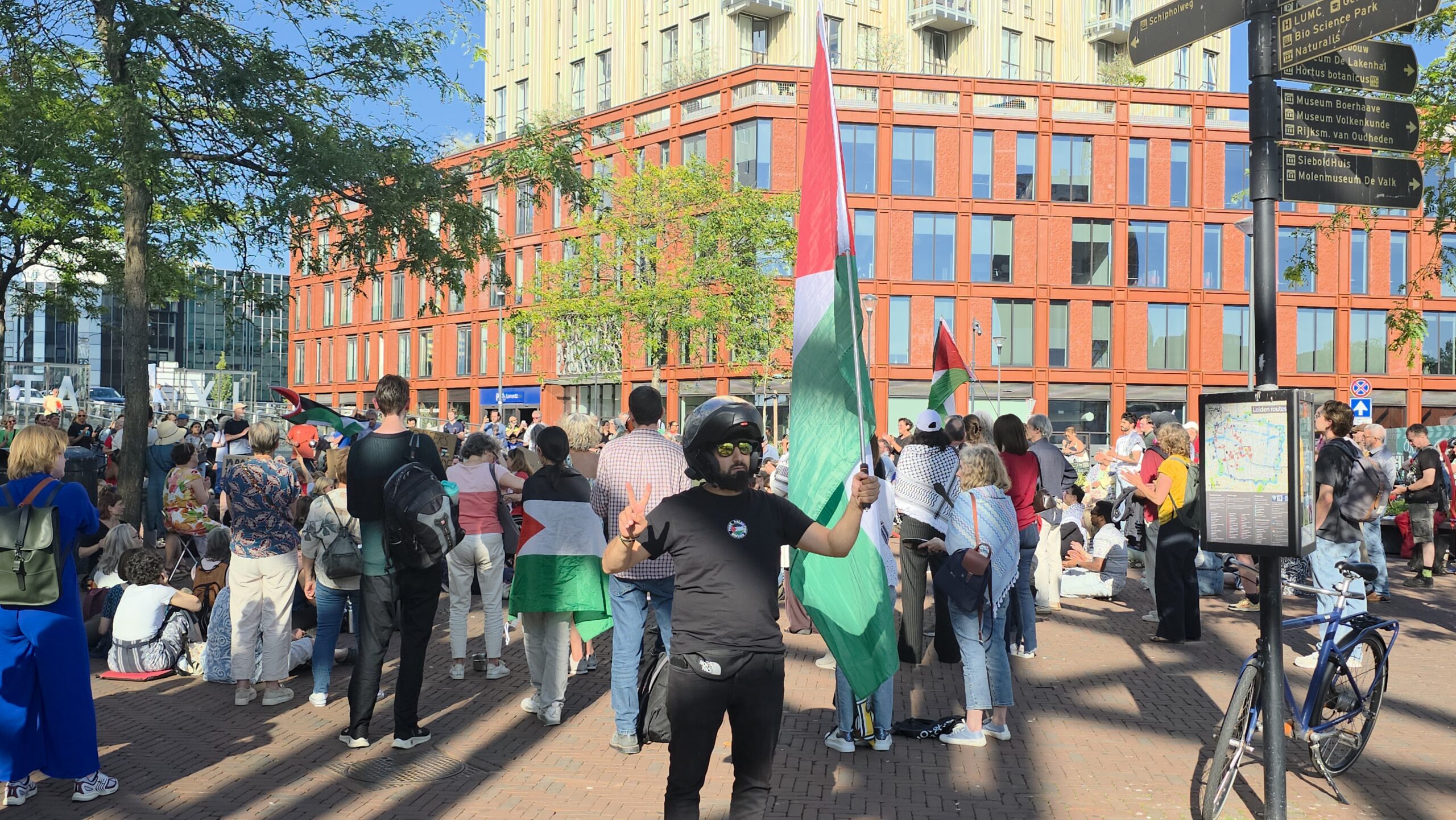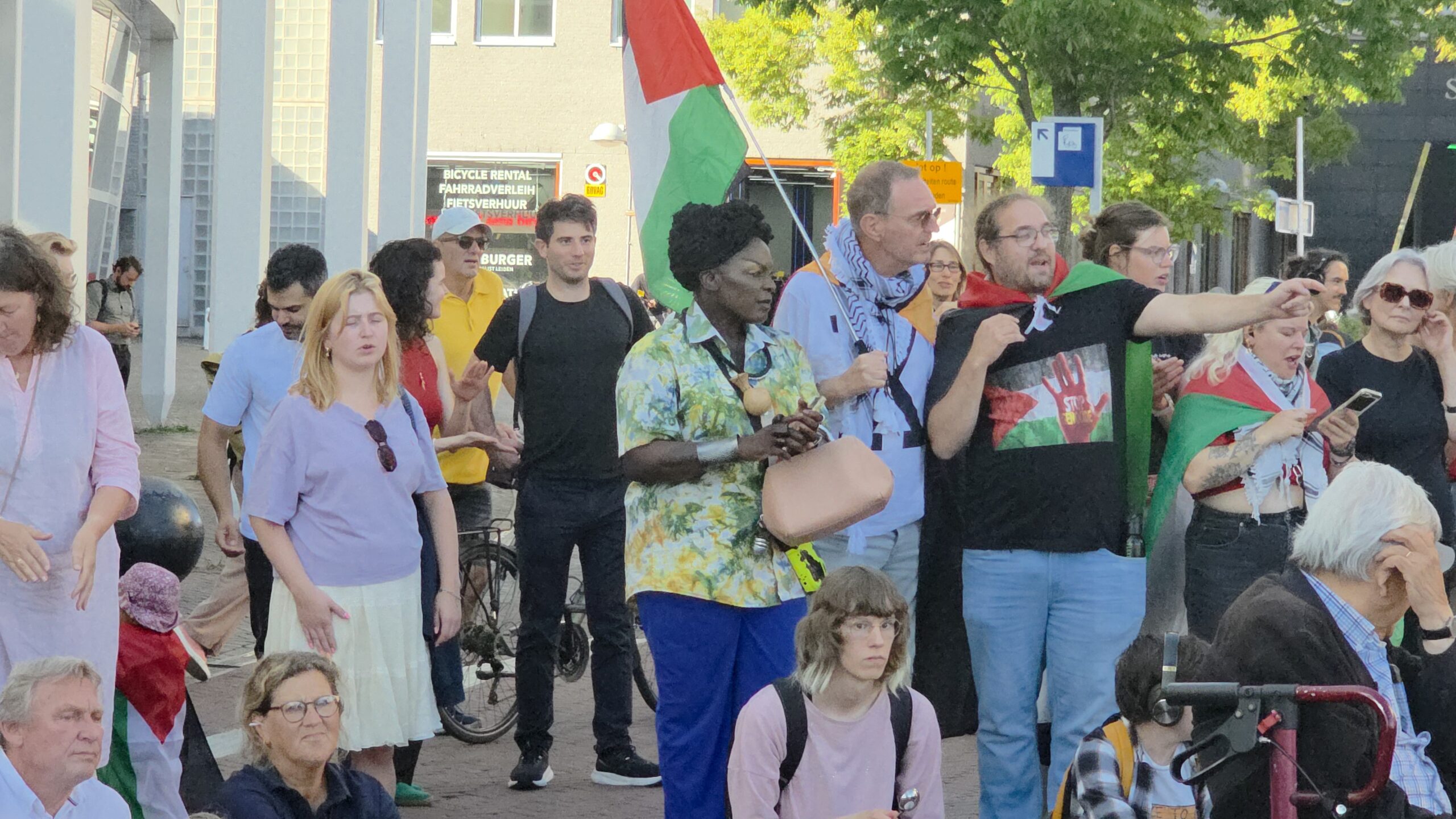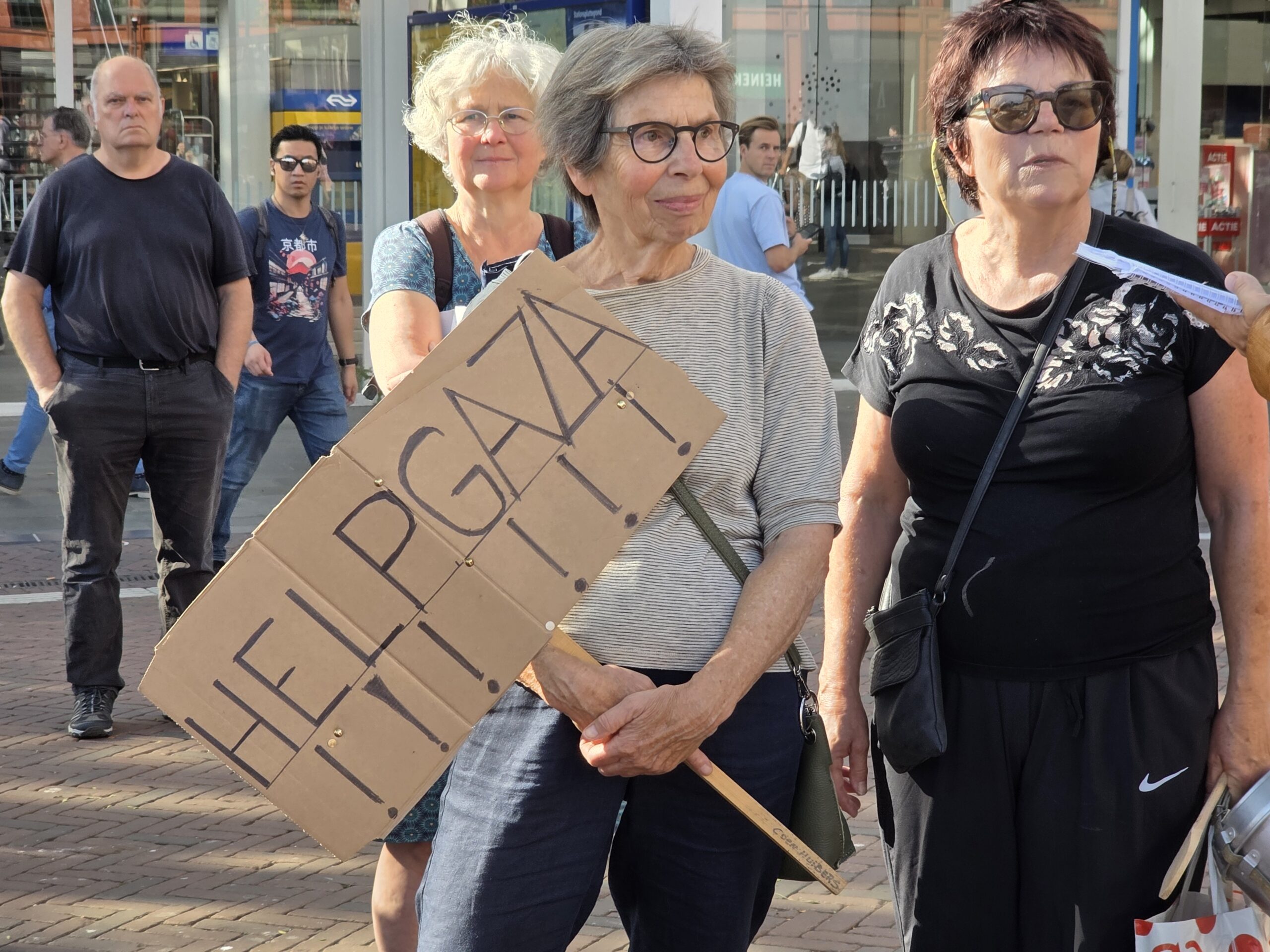 Aan de grens staan al maanden vrachtwagen met voedsel, maar Israël laat nauwelijks hulp tot het gebied toe. “De mensen in Gaza zitten in de laatste catastrofale fase van honger. Ledematen sterven van binnenuit af en kinderen gaan dood van de honger”, zegt Pieter Matthias van der Veen door de megafoon. De jeugdige voorzitter van DWARS Leiden-Haaglanden is een van de organisatoren van het protest in Leiden.