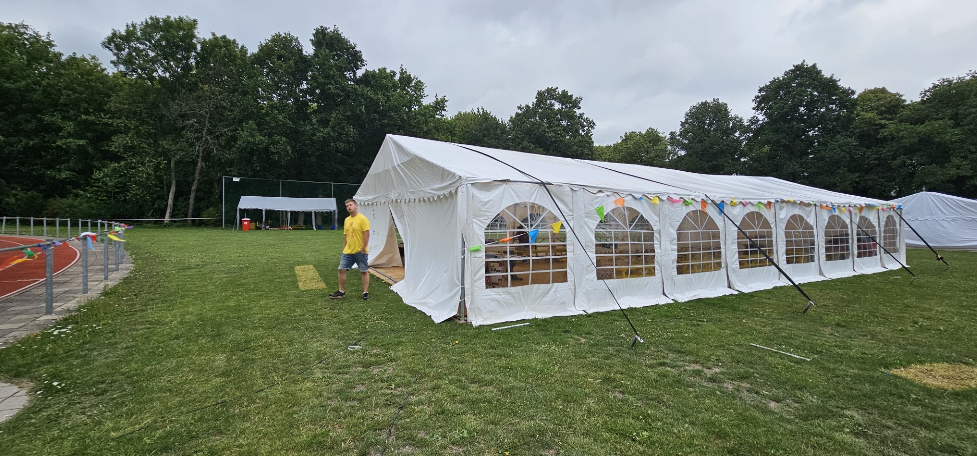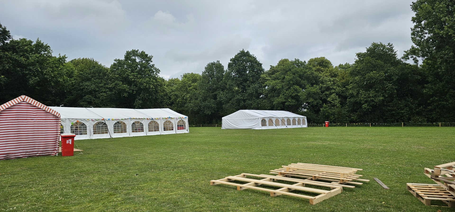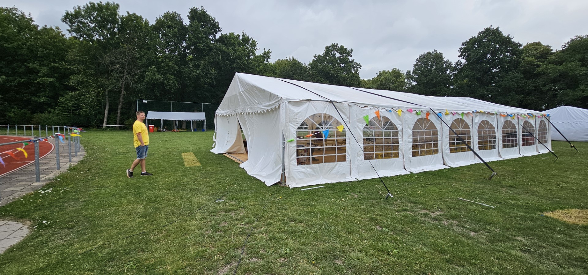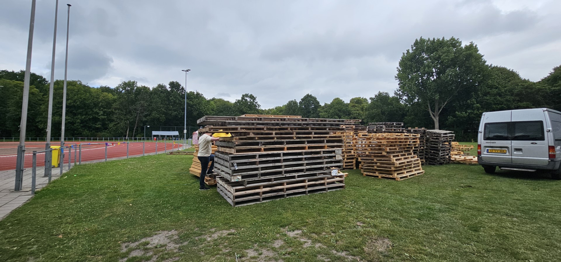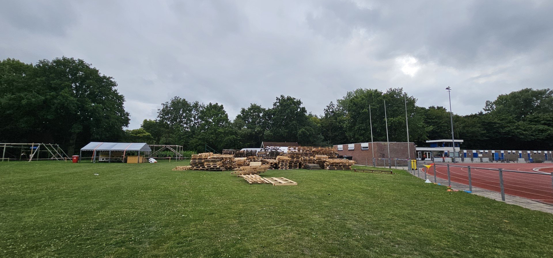 Donderdag lag er in elk geval al een enorme stapel pallets klaar voor de huttenbouw. “Aan de Vliet hadden we beschikking over een paar kleine gebouwtjes, die missen we hier. We hebben dat op kunnen lossen met twee reusachtige evenementententen.”
