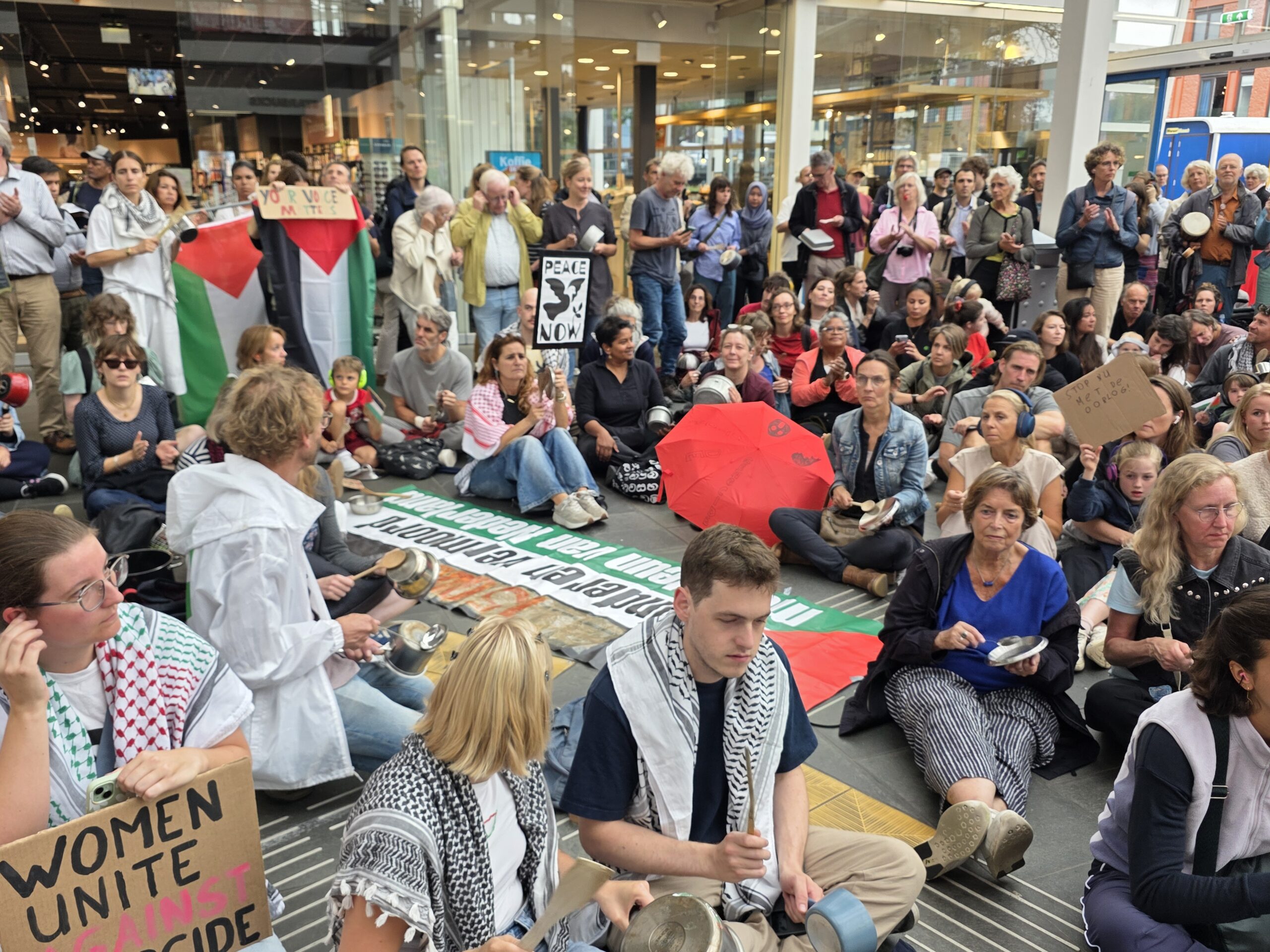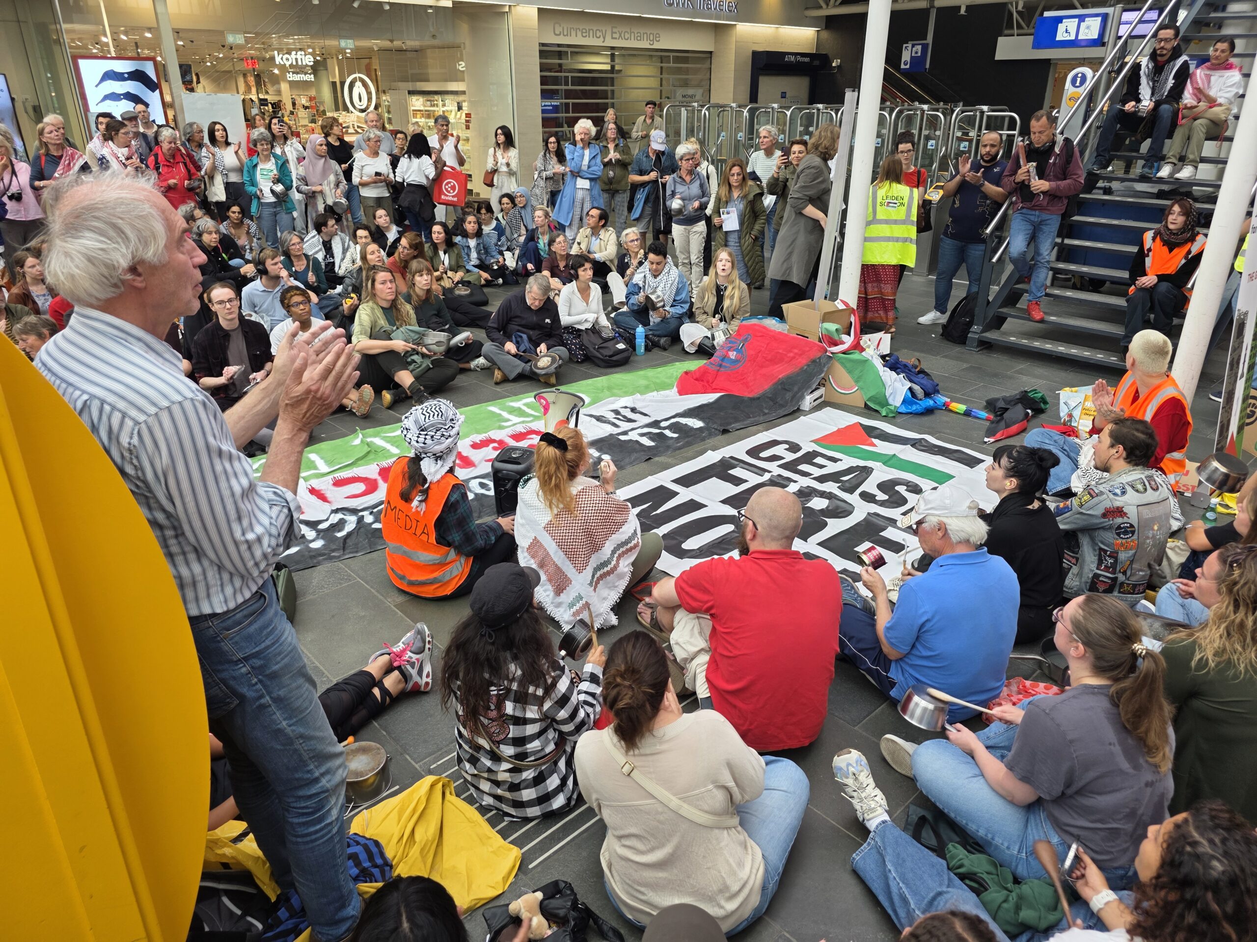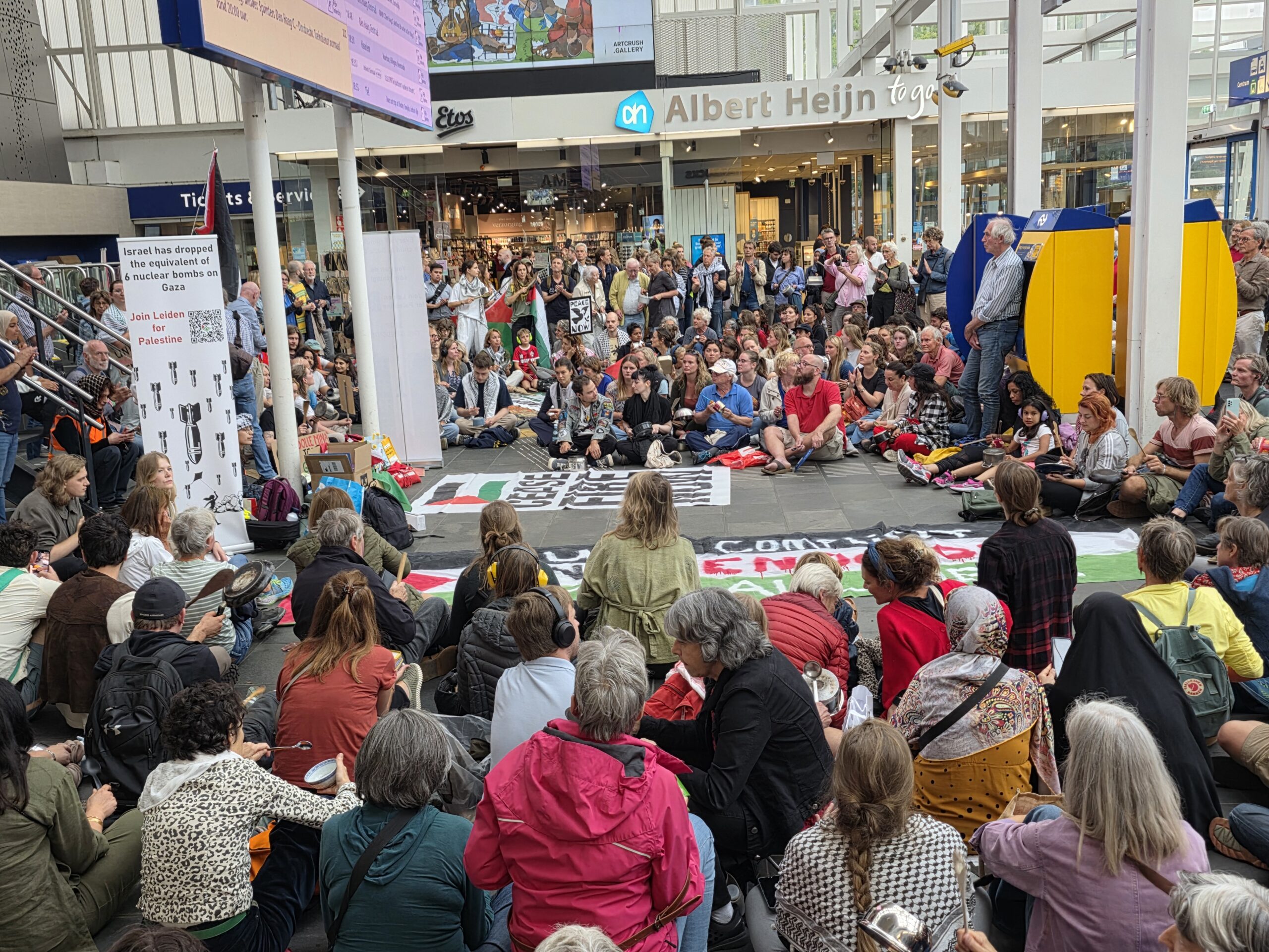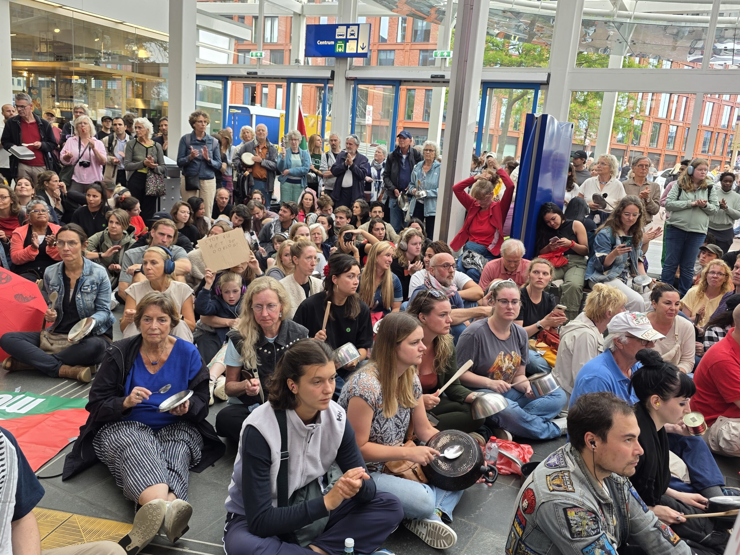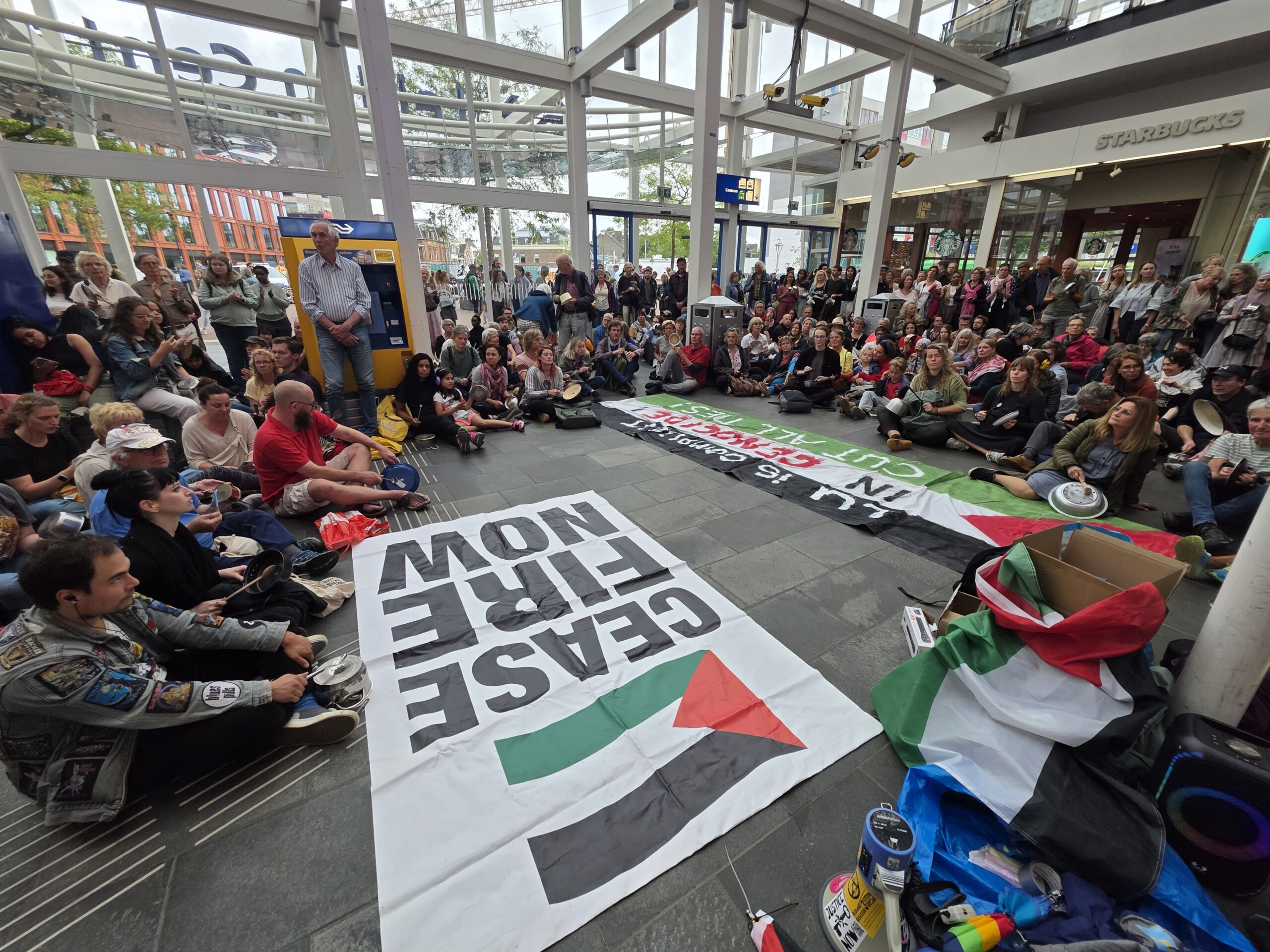 Vorige week werd op het Stationsplein geprotesteerd, maar dit keer werd de lawaaidemonstratie in de centrale hal van het station gehouden. Ook nu luidt de oproep: stop de oorlog en laat voedsel het gebied binnen.