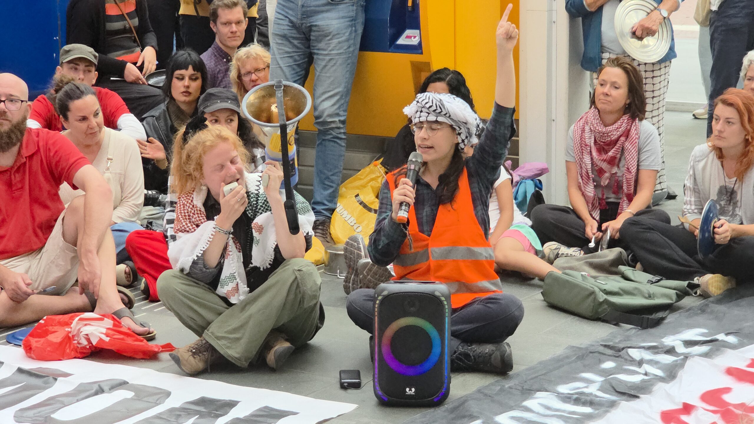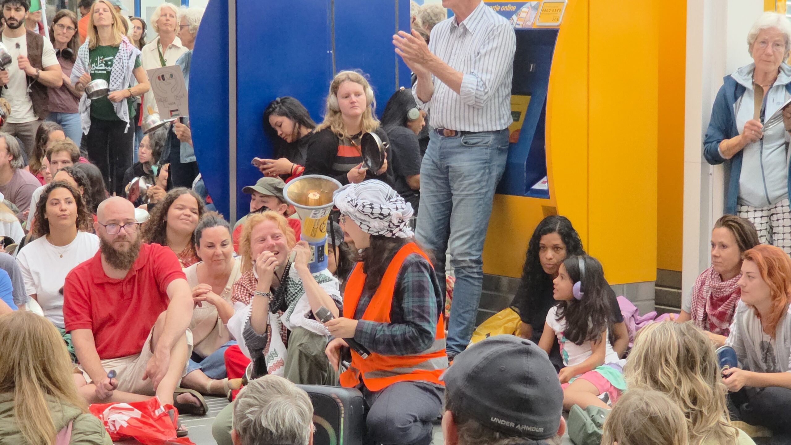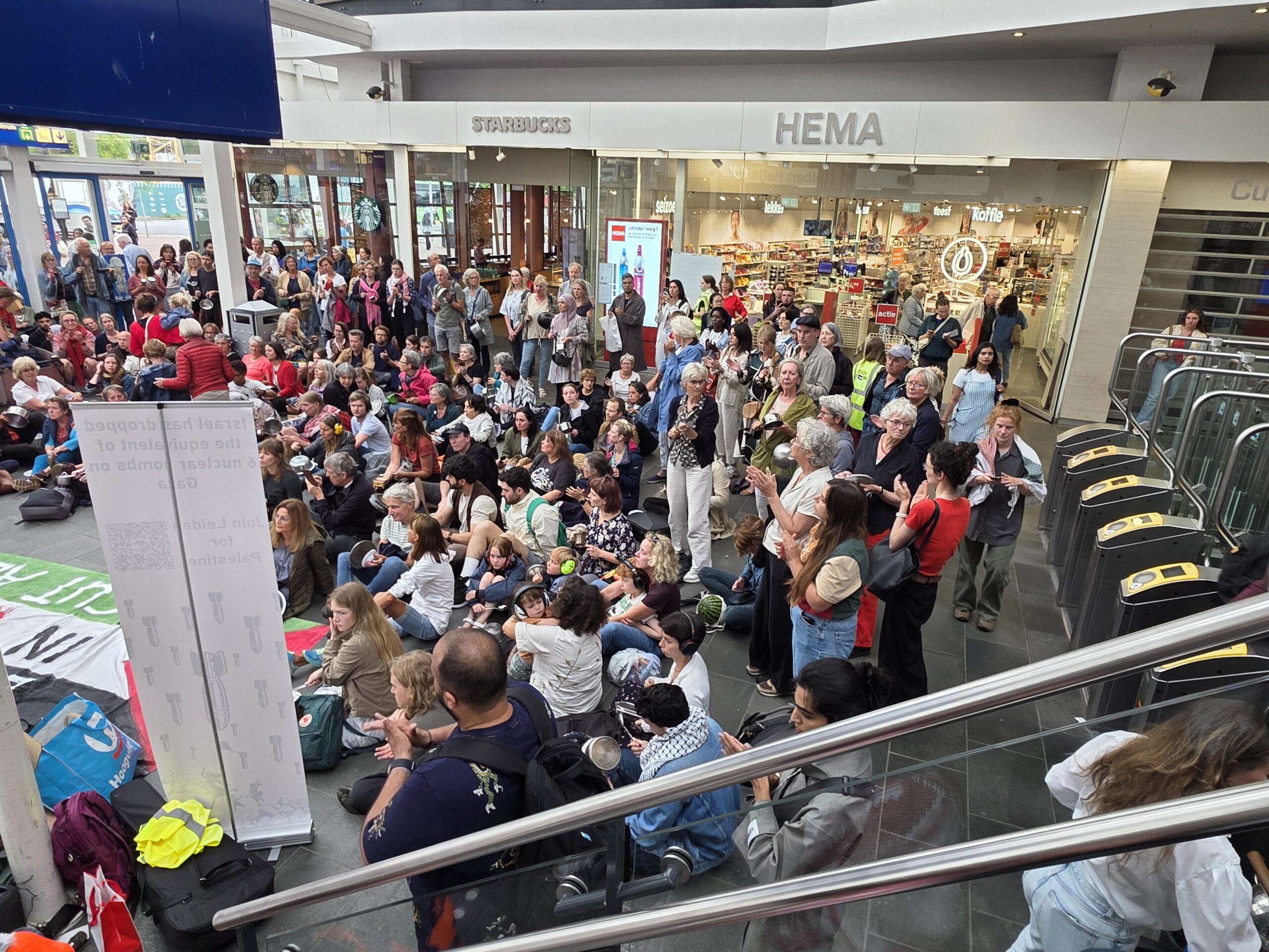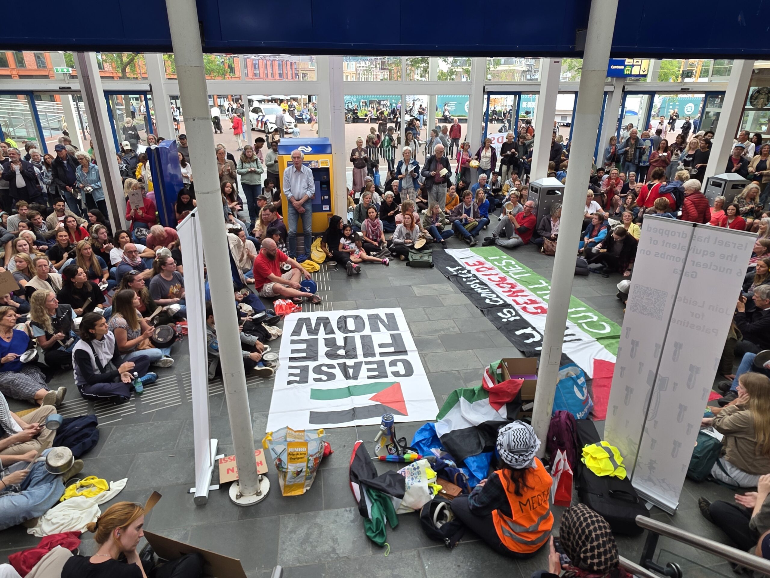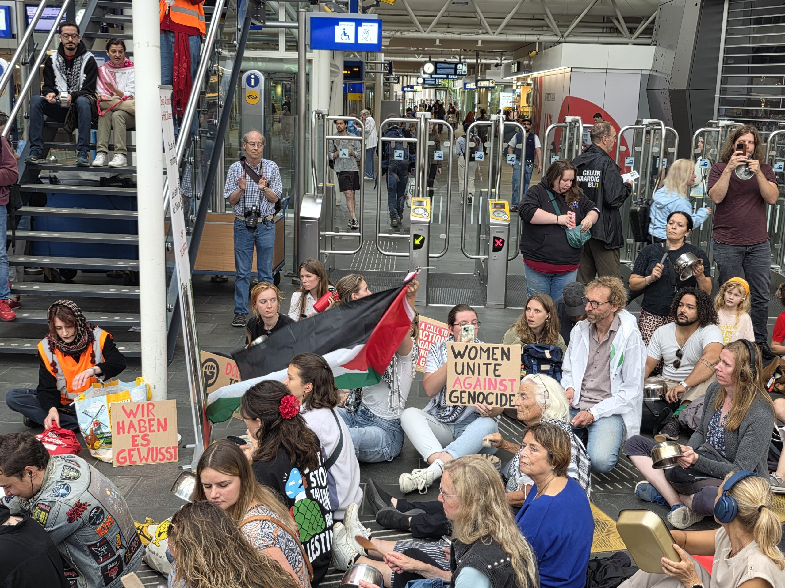 Vorige week werd op het Stationsplein geprotesteerd, maar dit keer werd de lawaaidemonstratie in de centrale hal van het station gehouden. Ook nu luidt de oproep: stop de oorlog en laat voedsel het gebied binnen.