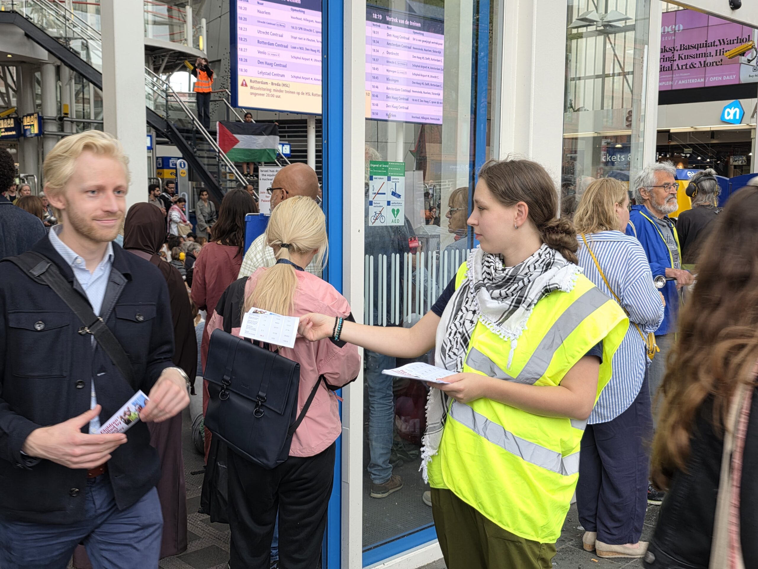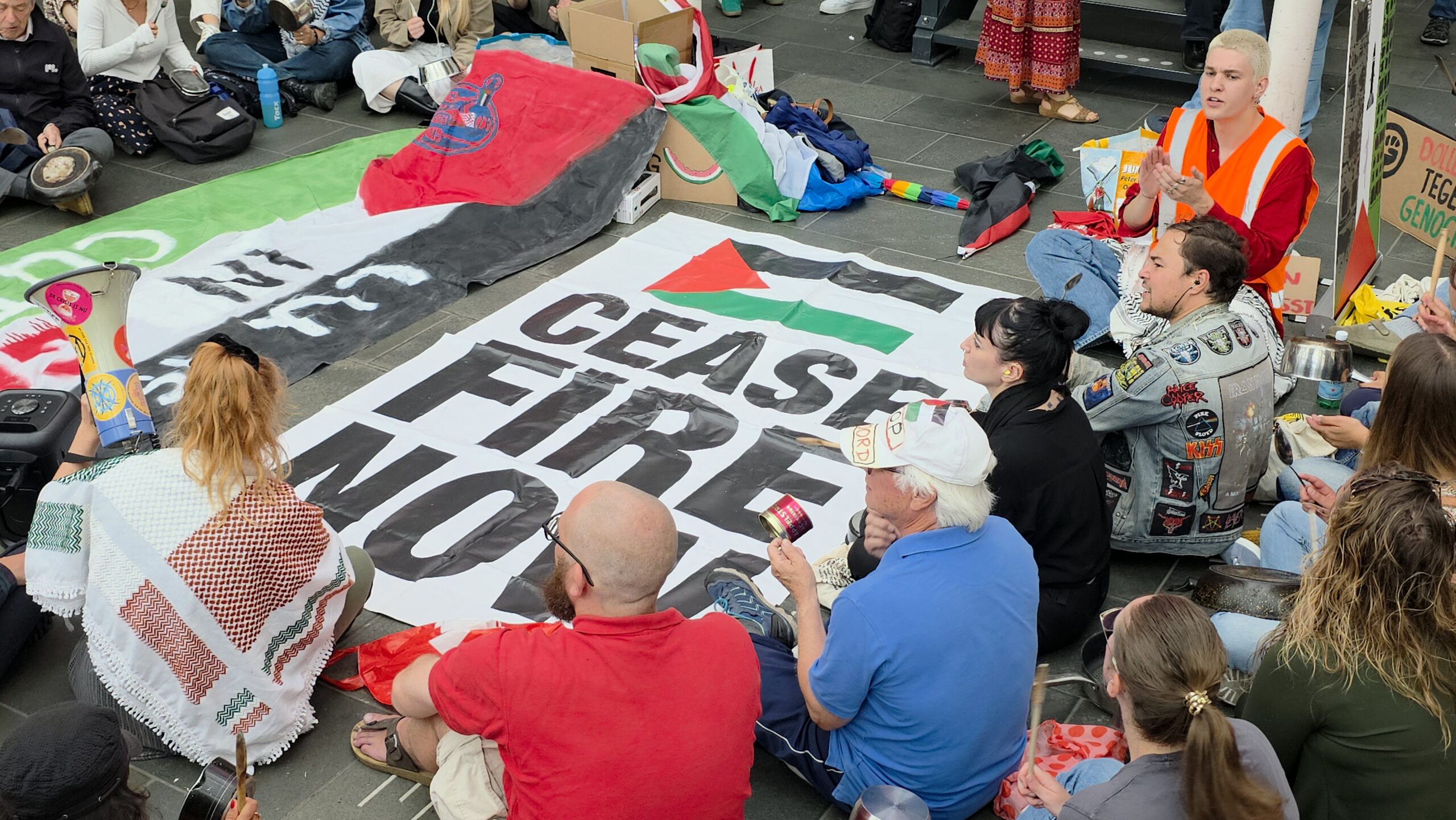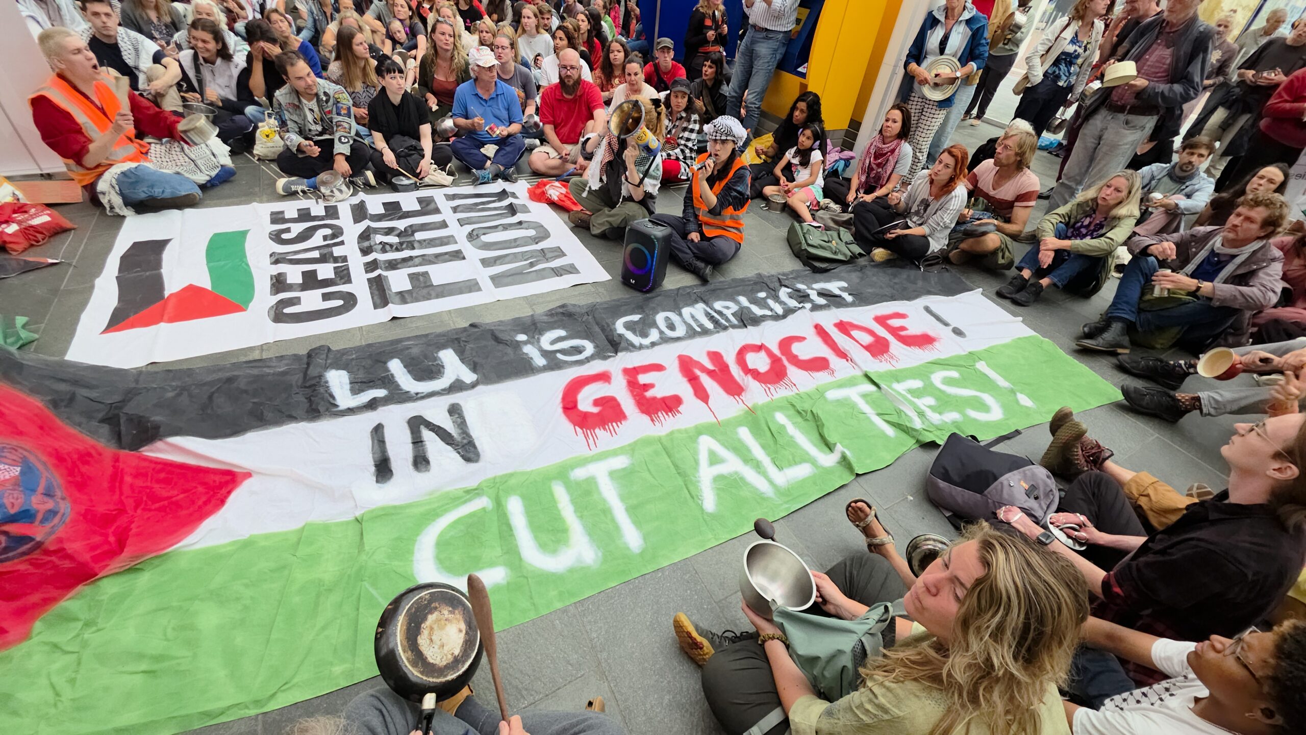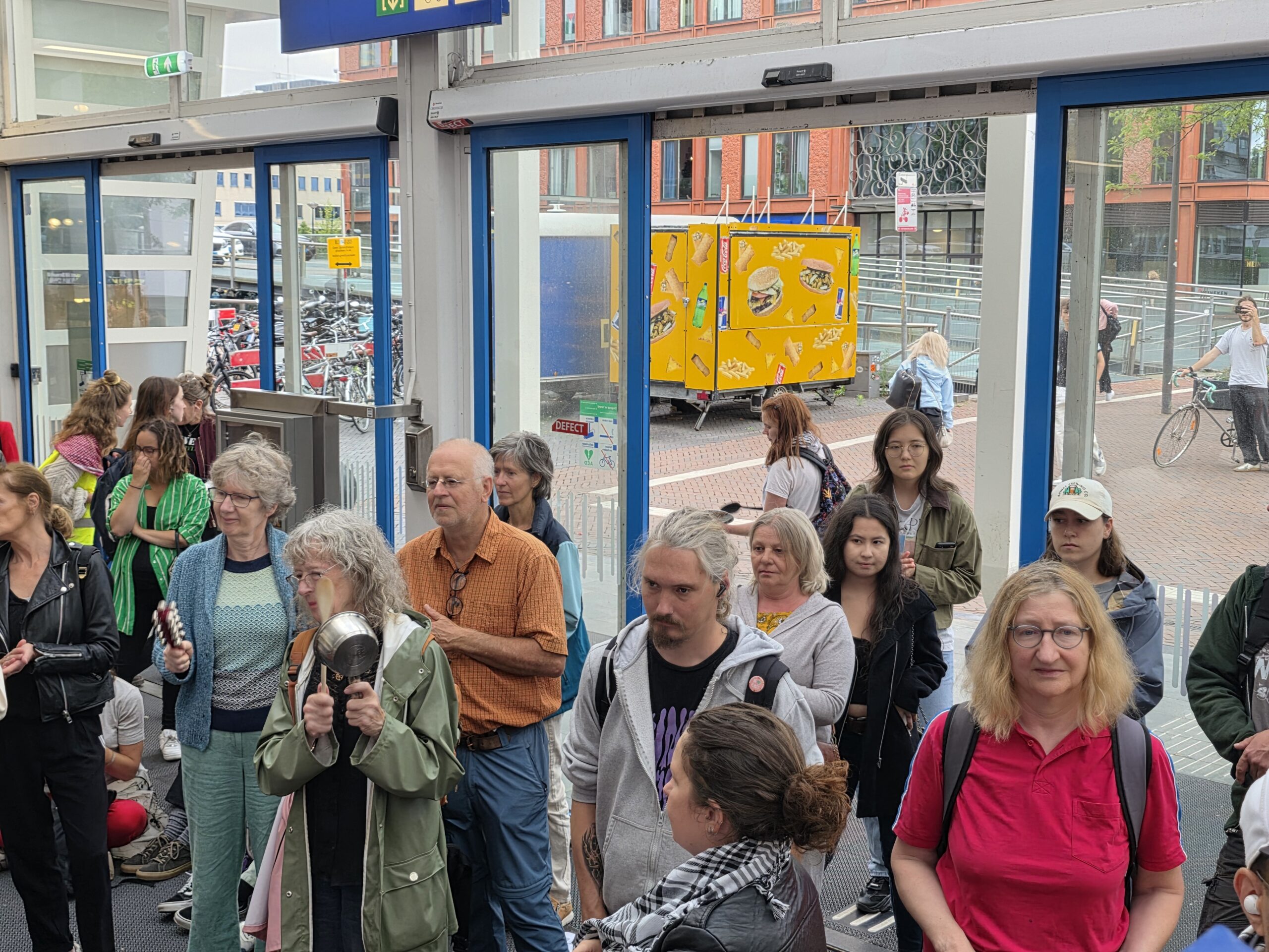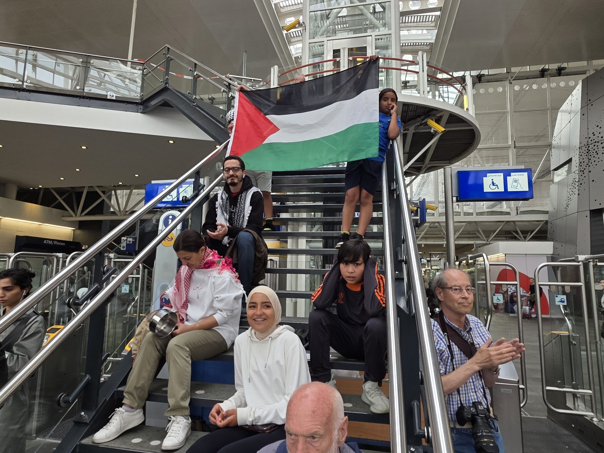 Vorige week werd op het Stationsplein geprotesteerd, maar dit keer werd de lawaaidemonstratie in de centrale hal van het station gehouden. Ook nu luidt de oproep: stop de oorlog en laat voedsel het gebied binnen.