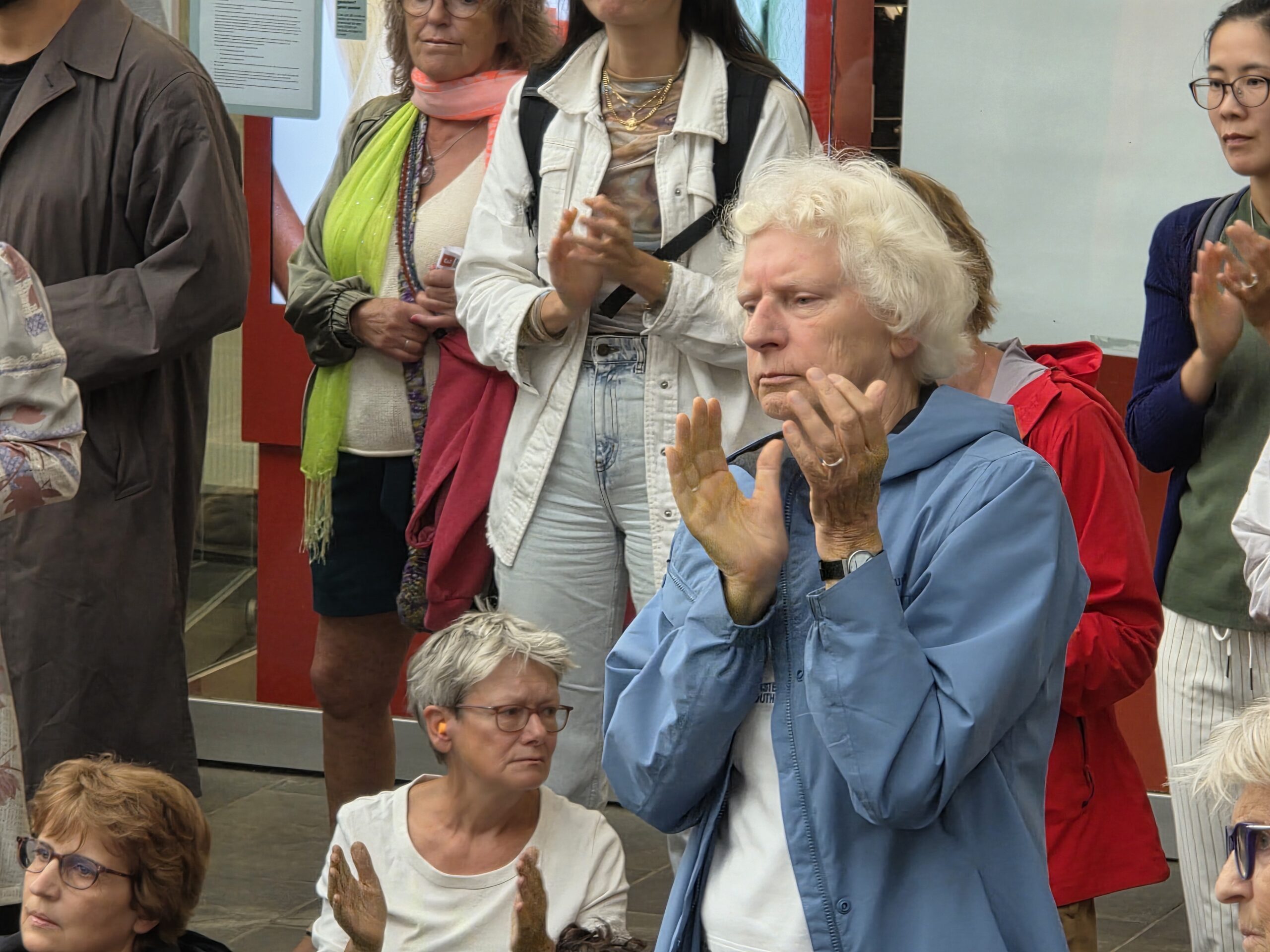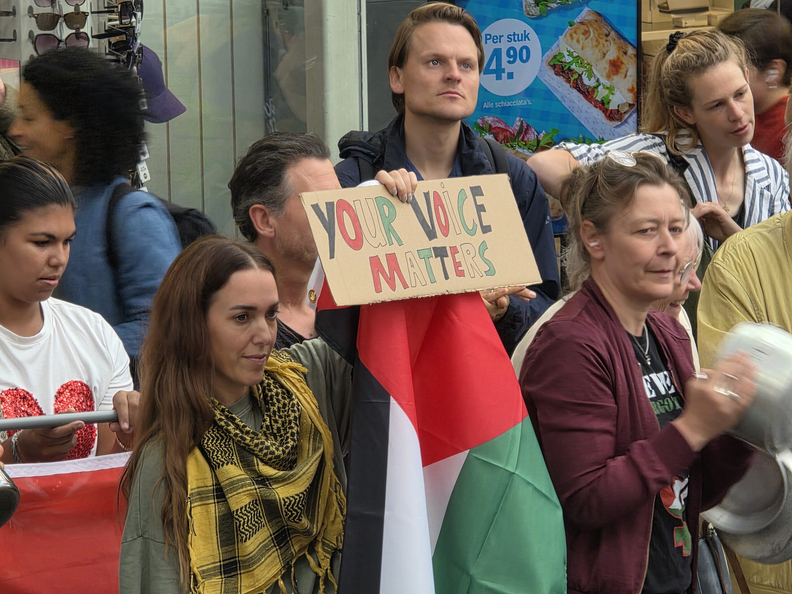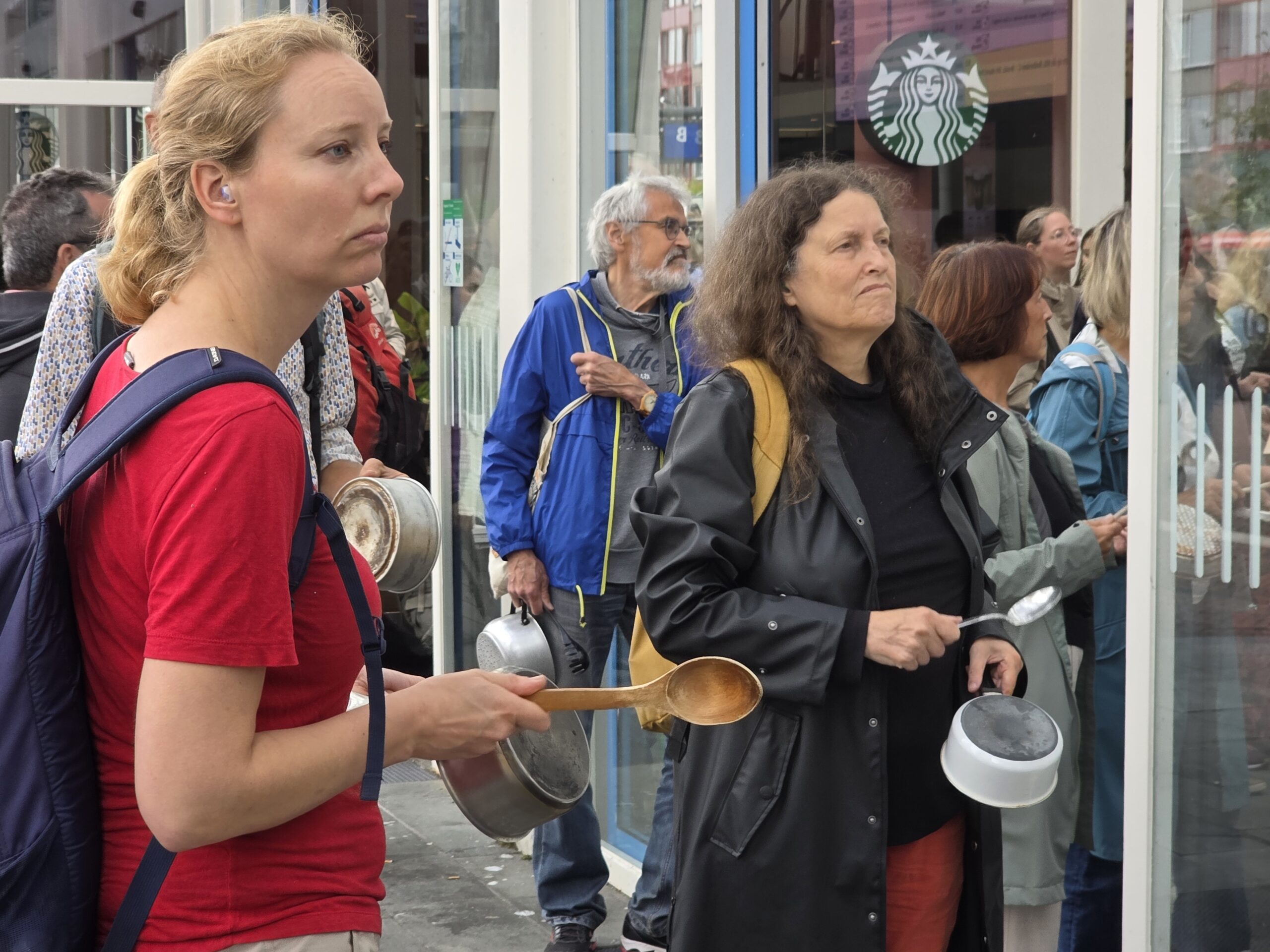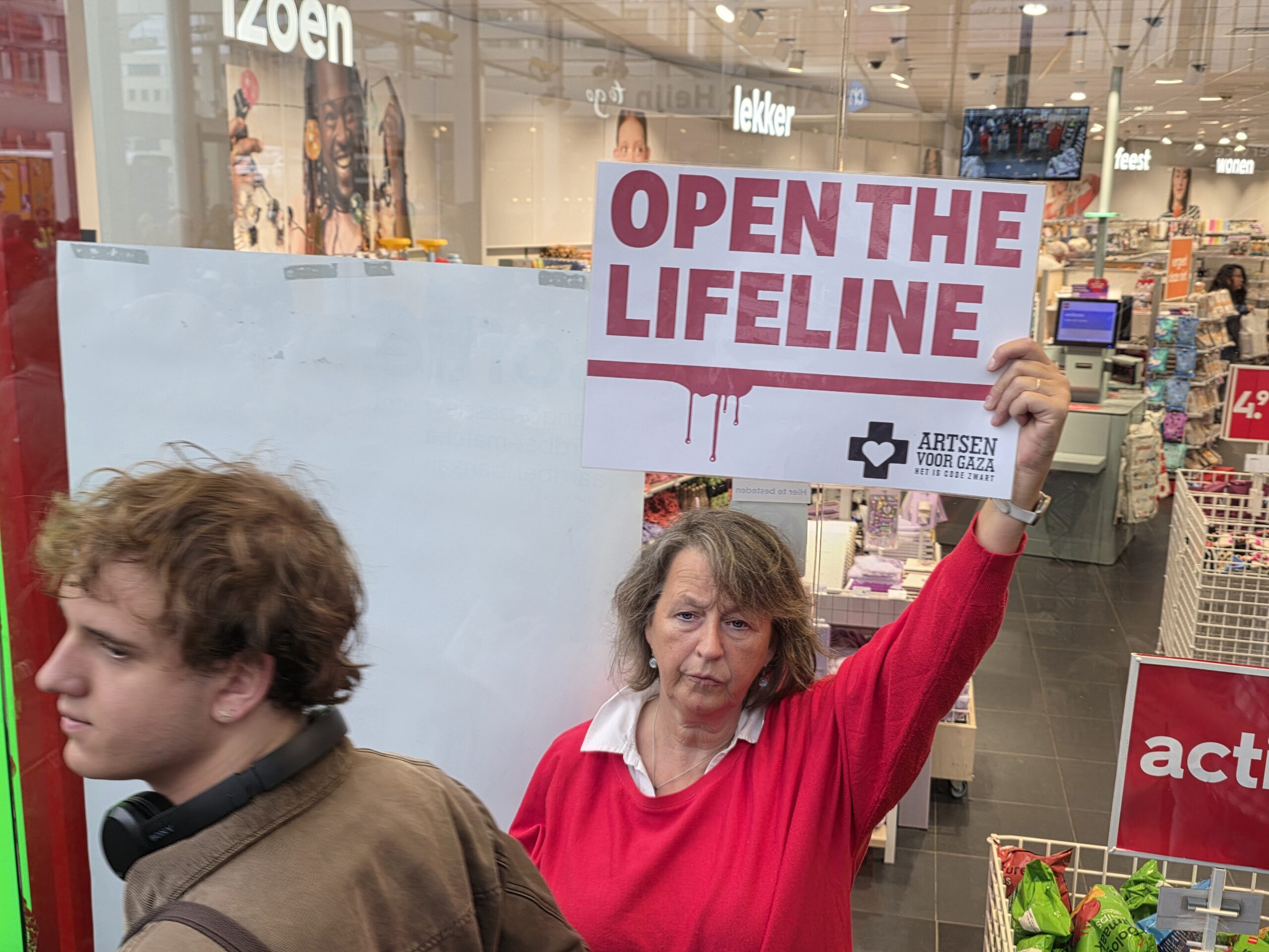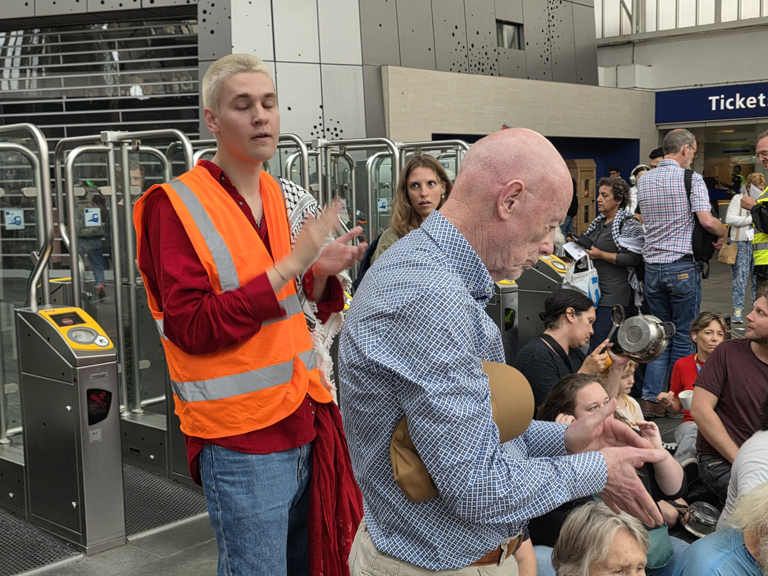 Vorige week werd op het Stationsplein geprotesteerd, maar dit keer werd de lawaaidemonstratie in de centrale hal van het station gehouden. Ook nu luidt de oproep: stop de oorlog en laat voedsel het gebied binnen.