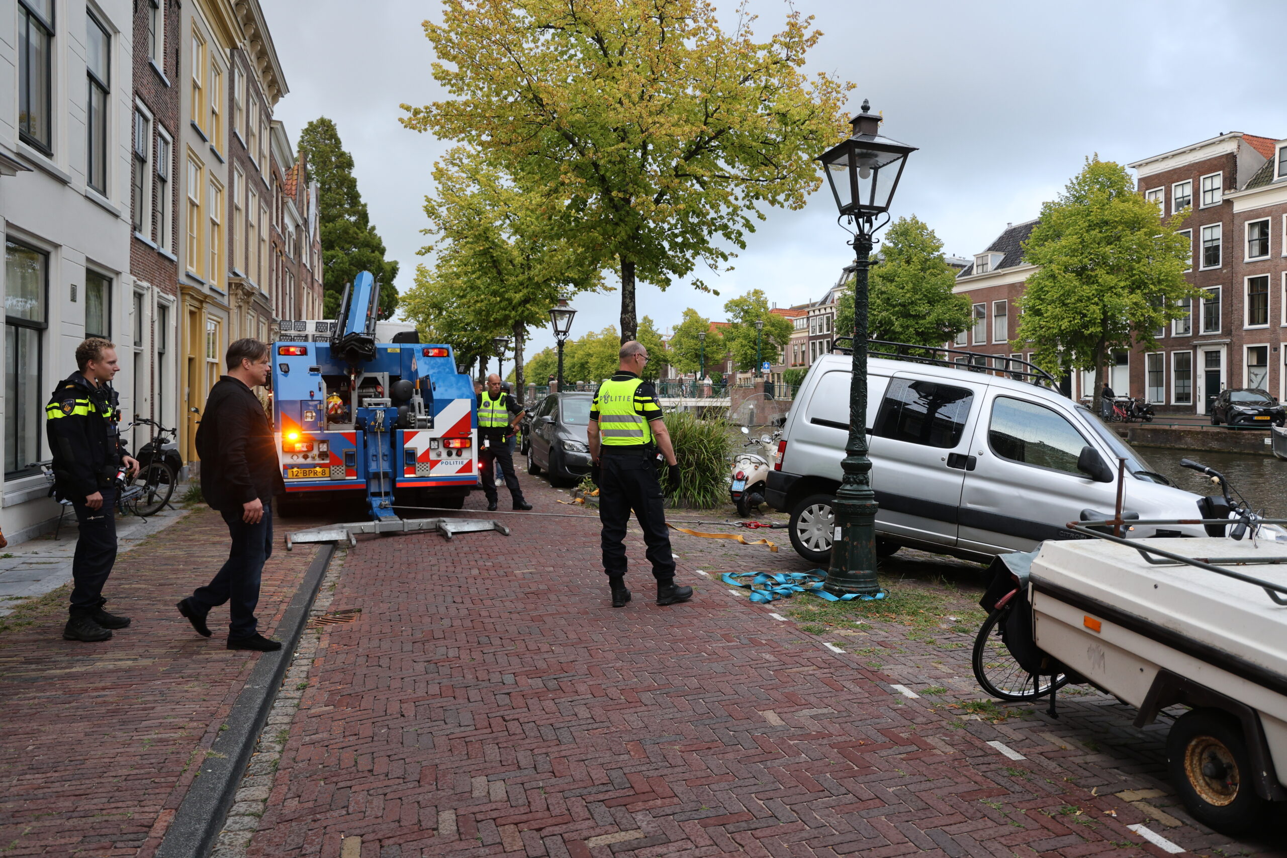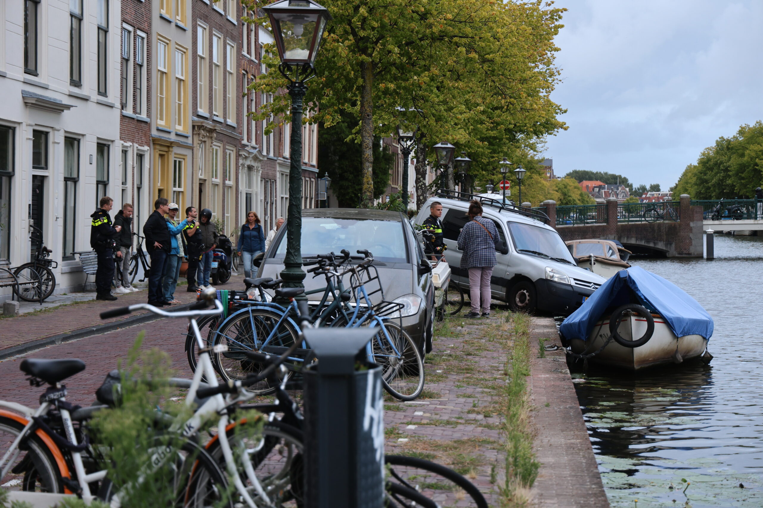 Een aangemeerde boot heeft vrijdagavond een auto behoedt voor een duik in het water van de Oude Singel in Leiden. Het voertuig was door een vergeten handrem half van de kade gerold, maar bleef hangen op het zeilbootje.