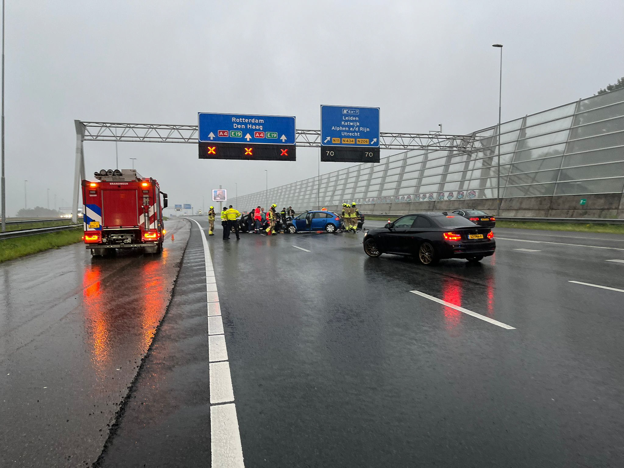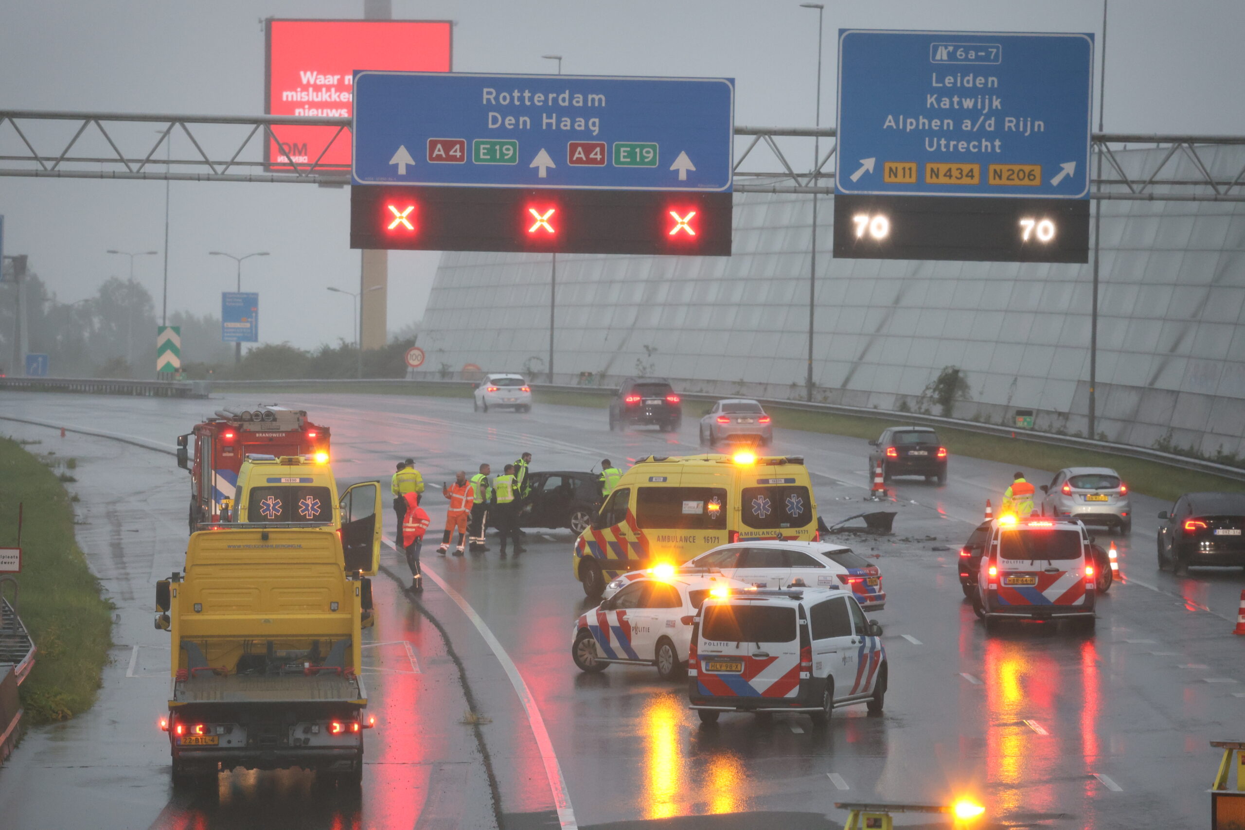 Een auto die met pech midden op de hoofdrijbaan van de A4 stilstond is zondagavond met hoge snelheid aangereden door een andere auto. De achterop komende automobilist heeft de auto met pech vermoedelijk over het hoofd gezien. Na het ongeval werd de A4 richting Den Haag volledig afgesloten.