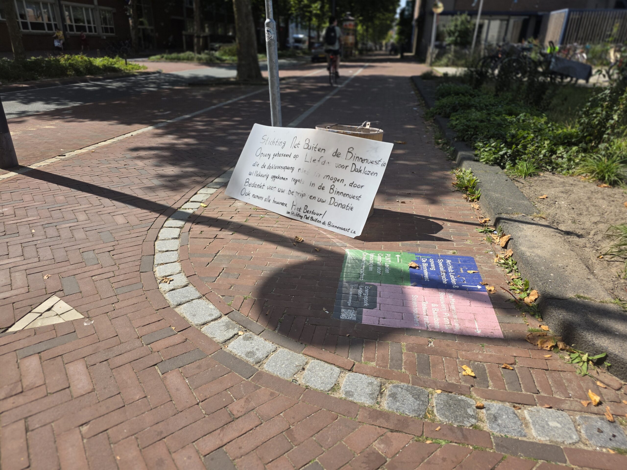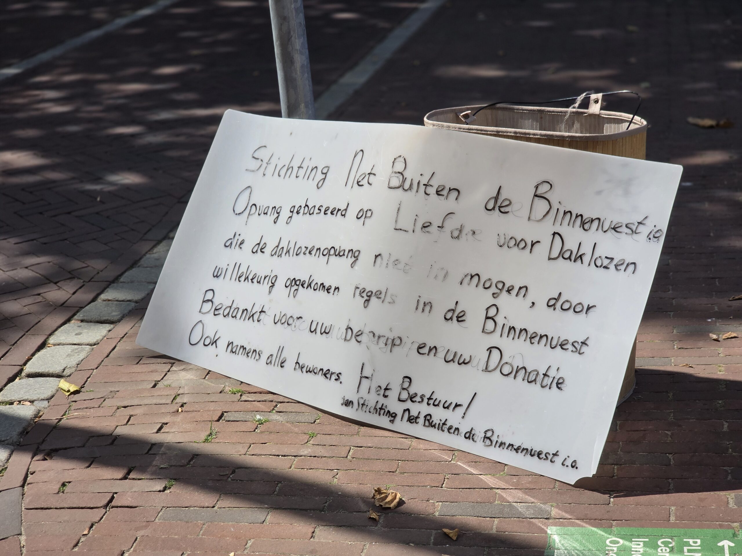 De groep dakloze bewoners van het tentenkampje heeft een ludiek bord neergezet om blikjes en flesjes in te zamelen voor het statiegeld.