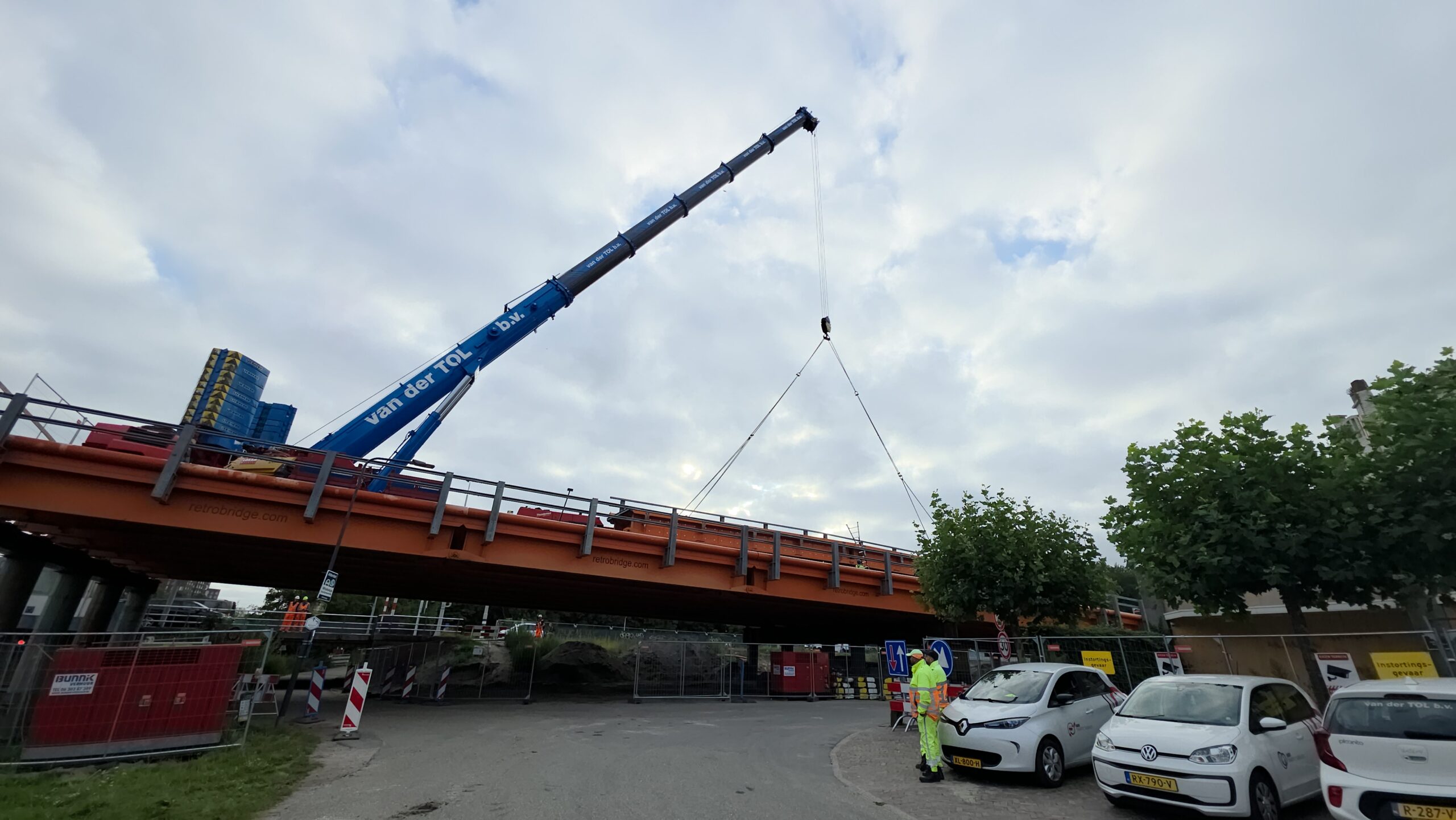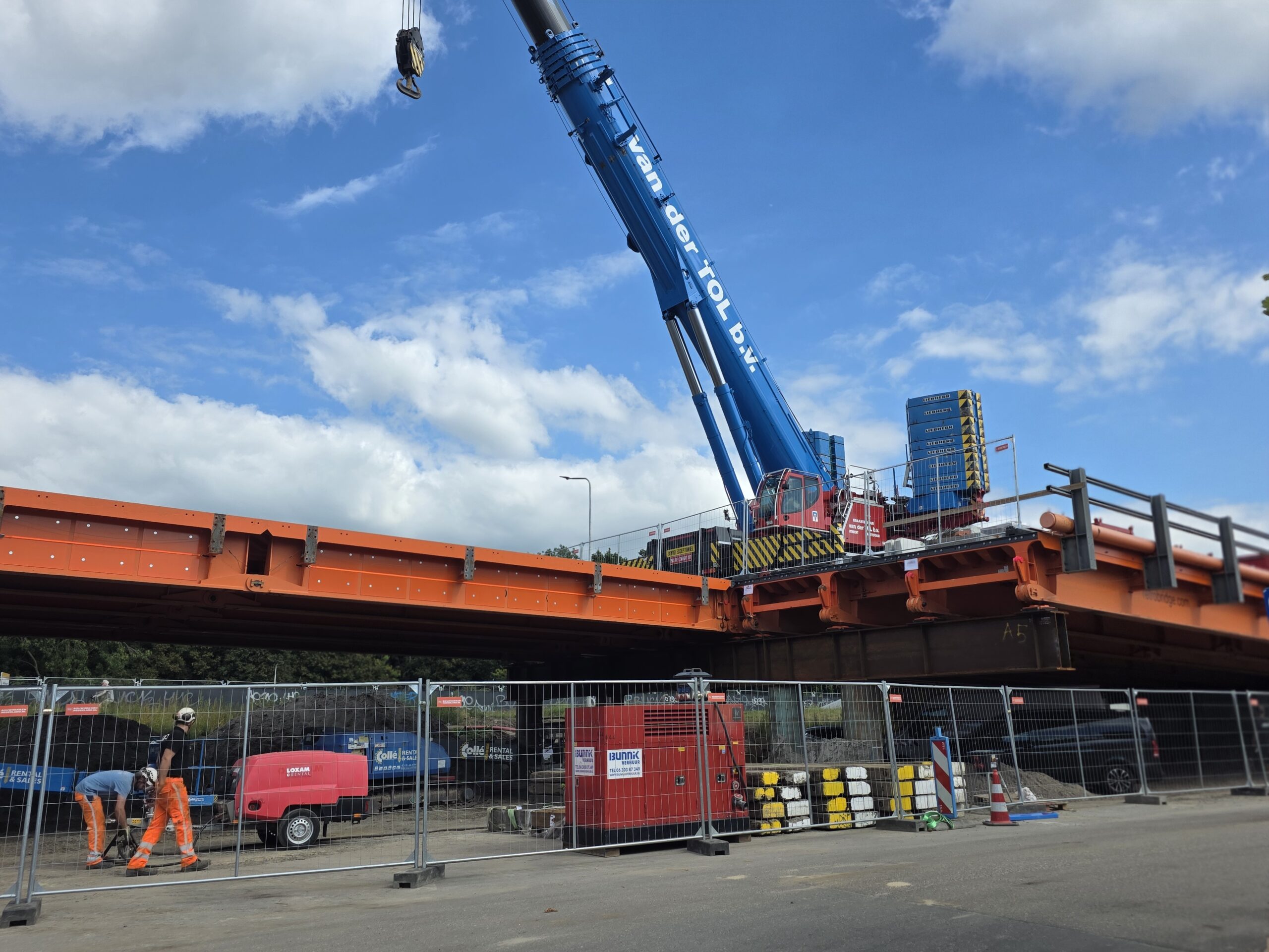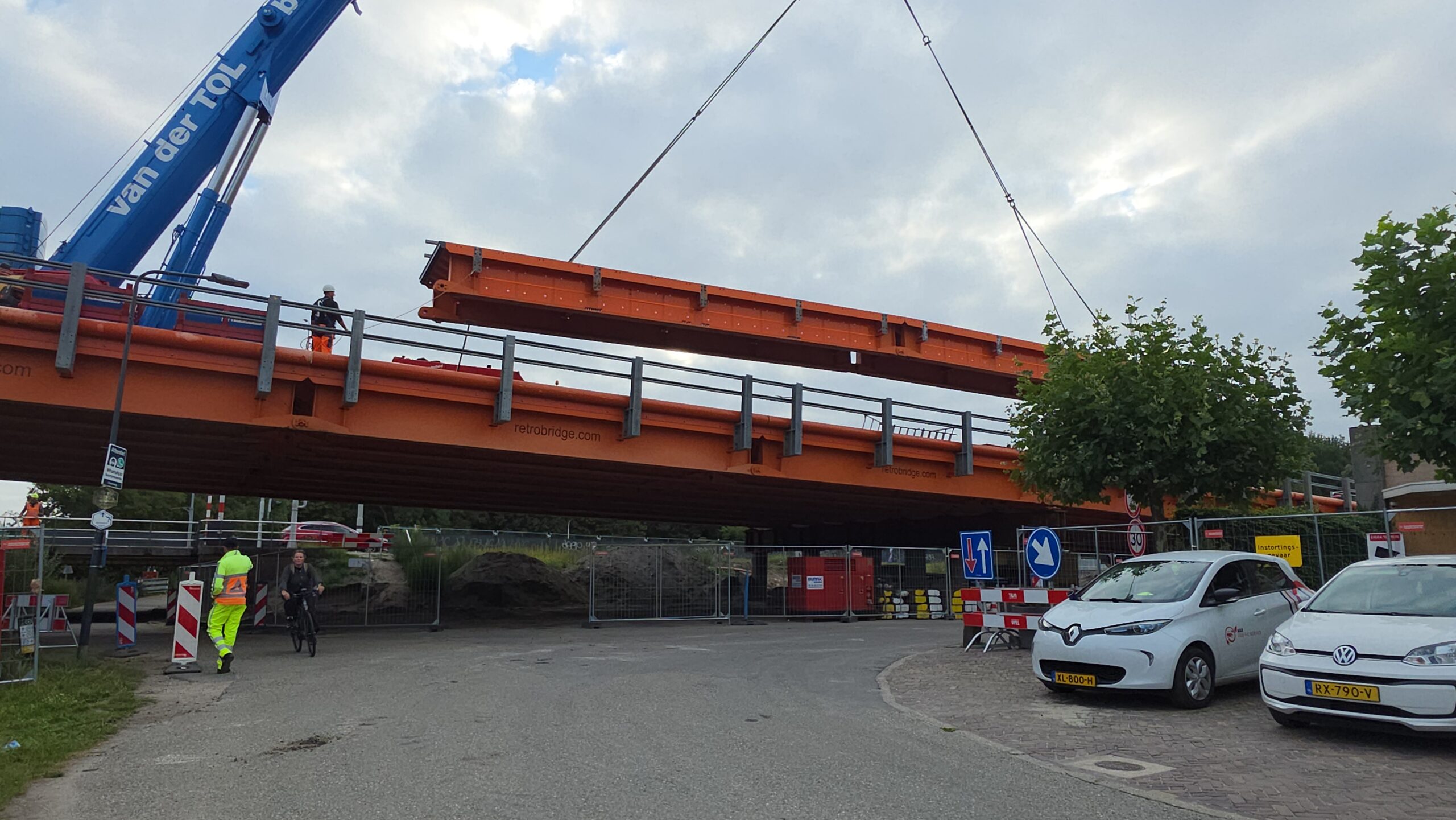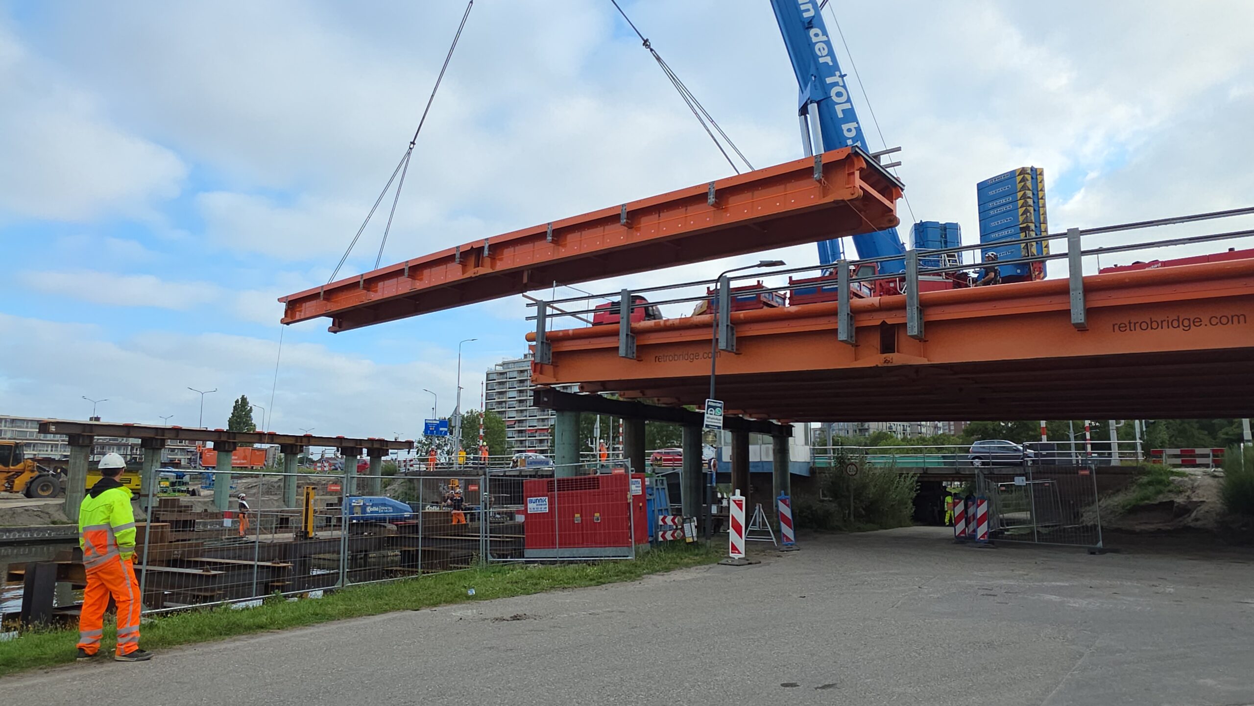 Vanaf 8.30 uur werd de ene na de andere stalen strook op z’n plek gelegd, waarna ze boven het water aan elkaar worden geklonken. Gezamenlijk vormen ze de tijdelijke brug die het verkeer de komende jaren gaat afwikkelen.