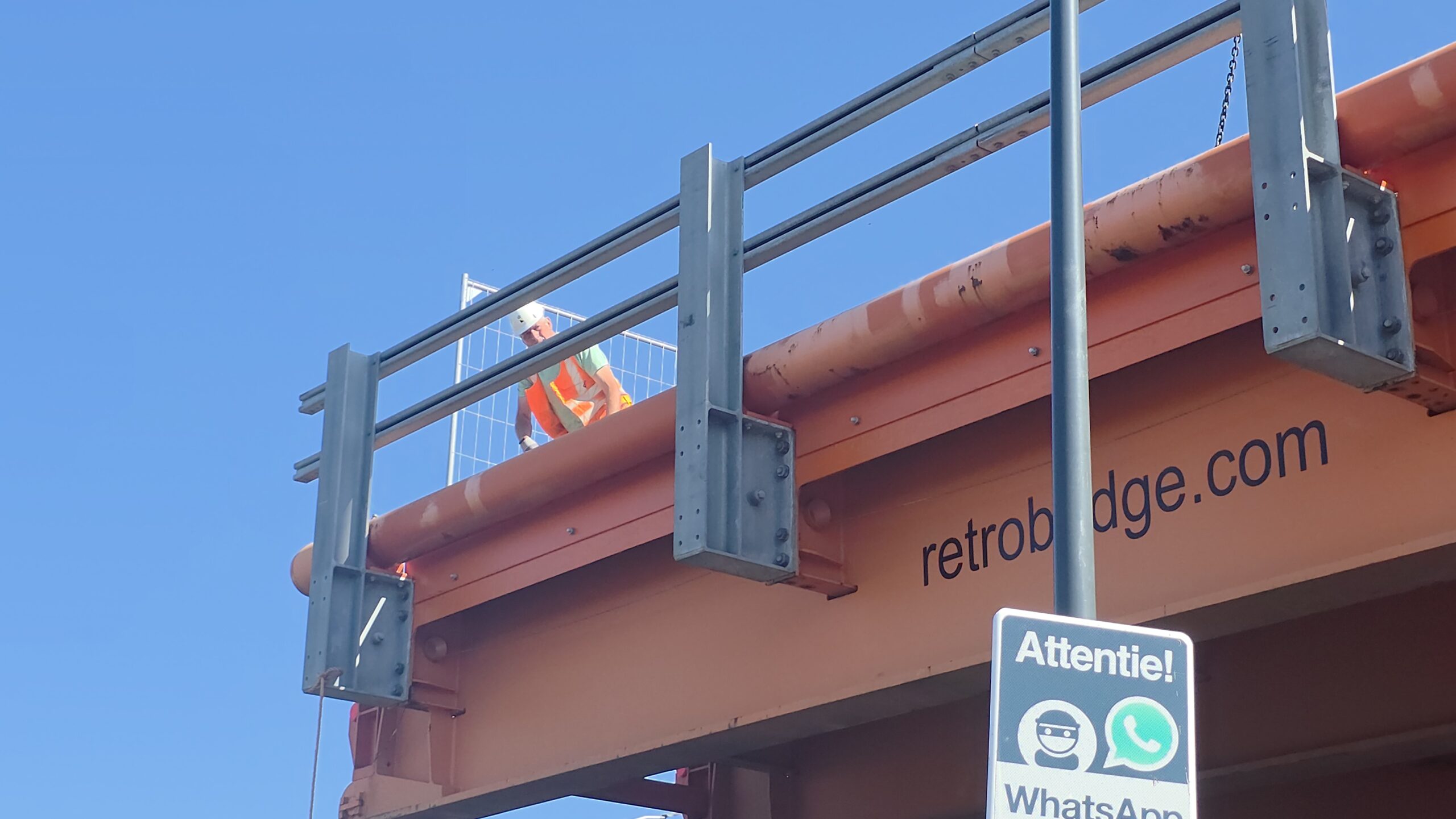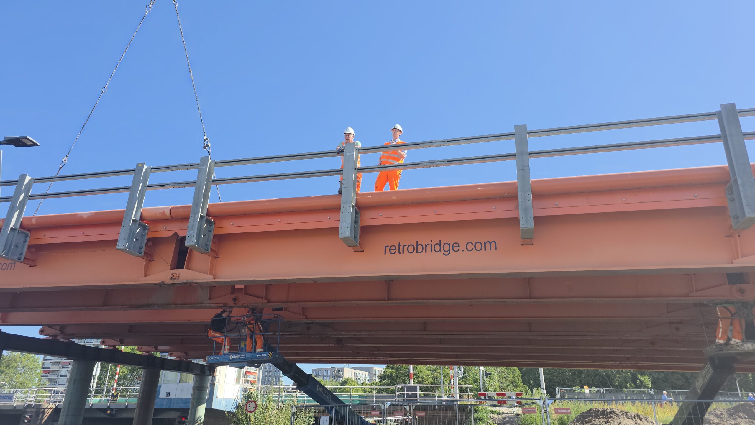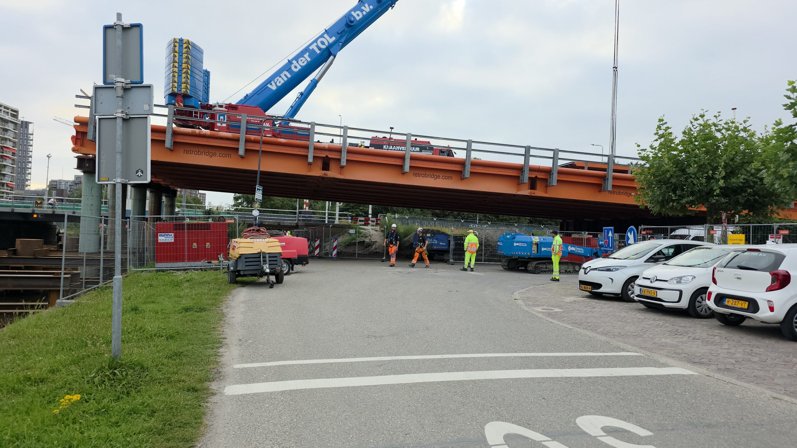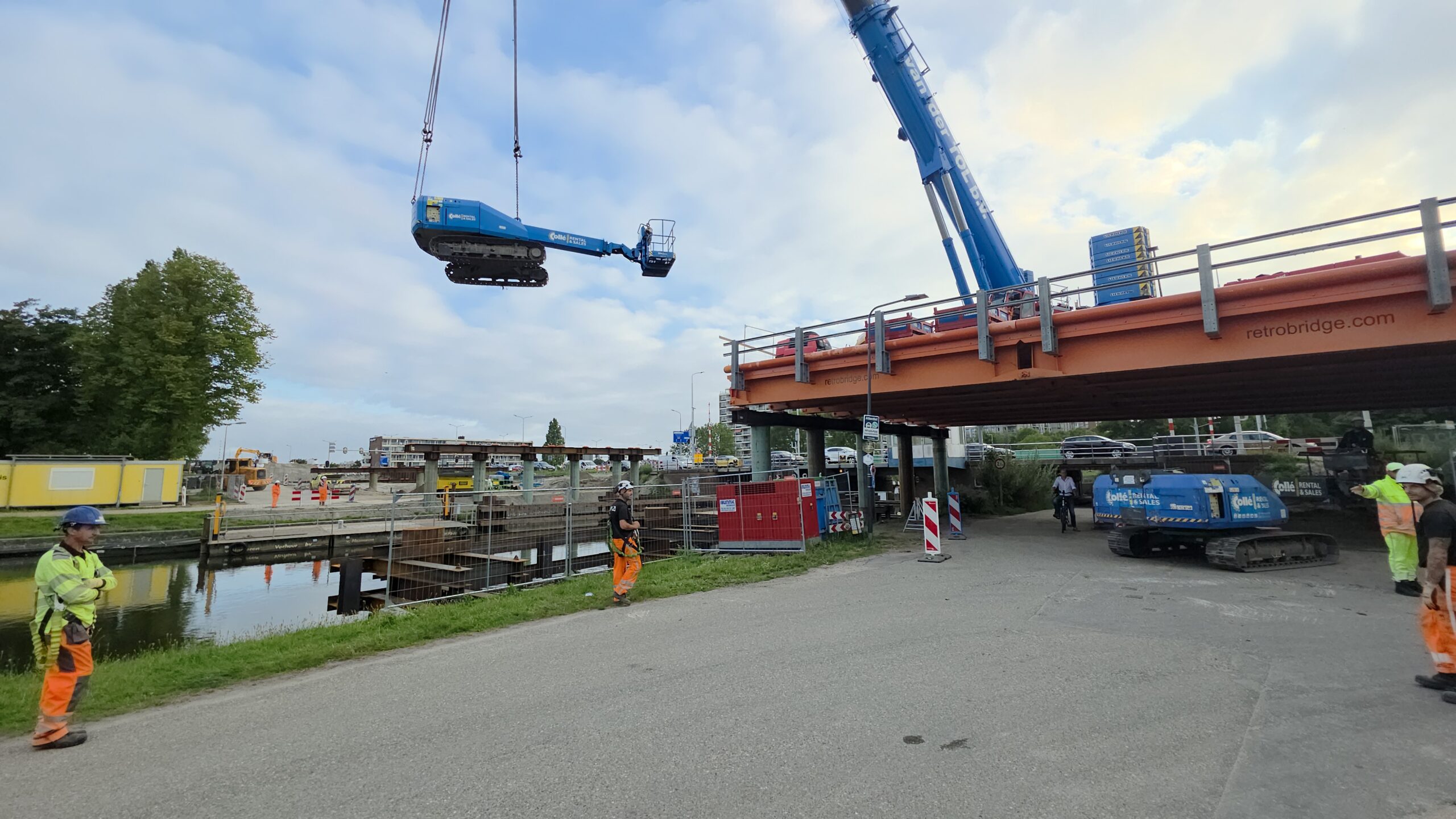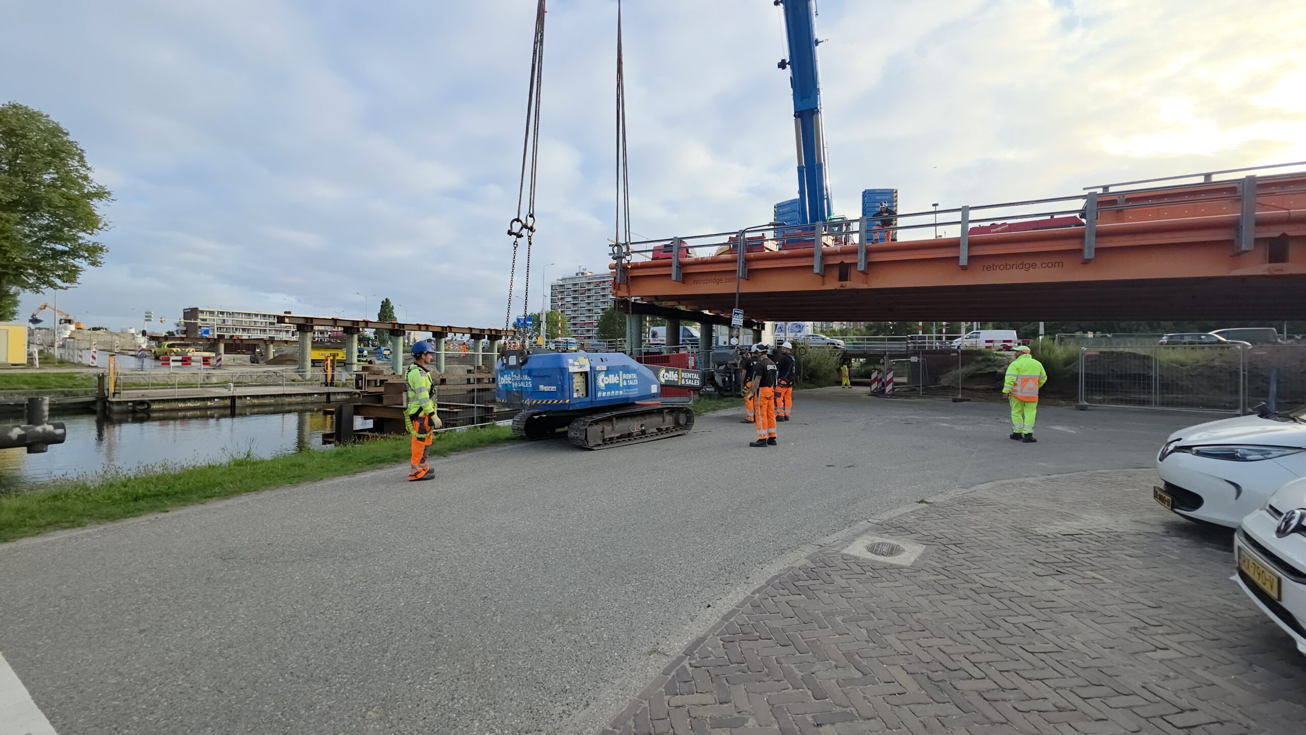 Vanaf 8.30 uur werd de ene na de andere stalen strook op z’n plek gelegd, waarna ze boven het water aan elkaar worden geklonken. Gezamenlijk vormen ze de tijdelijke brug die het verkeer de komende jaren gaat afwikkelen.