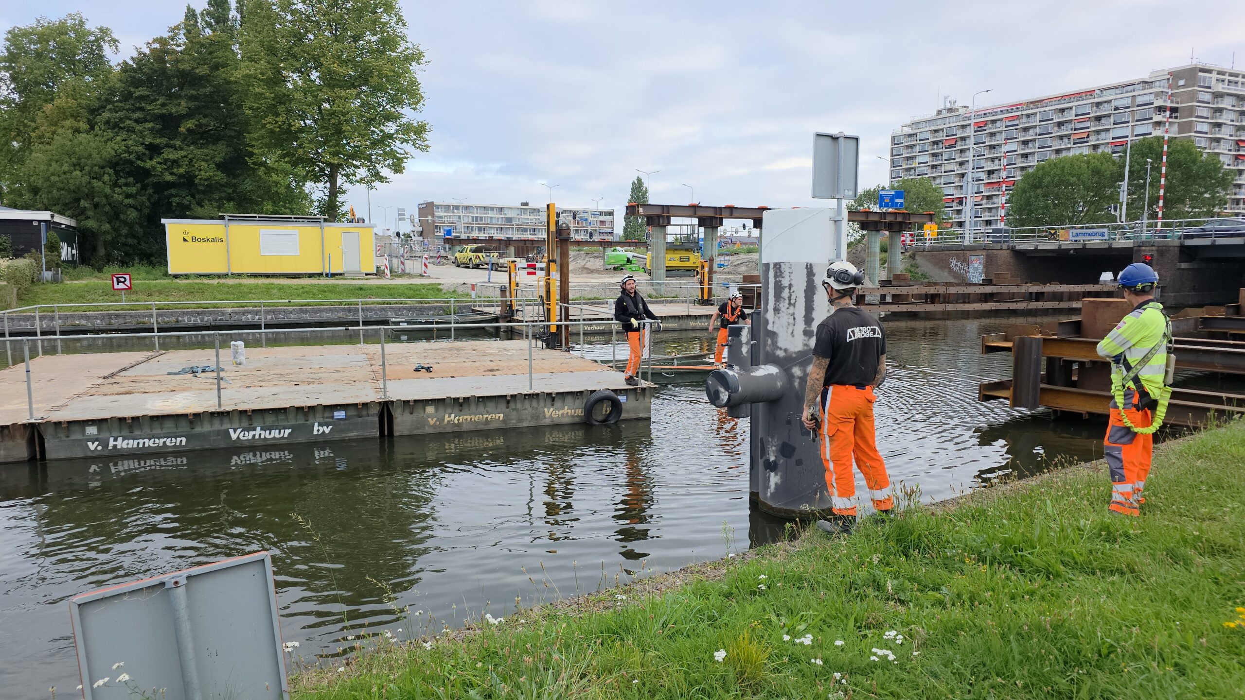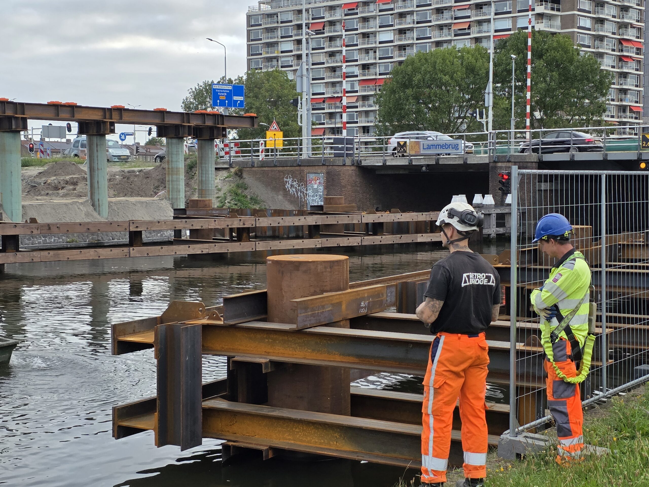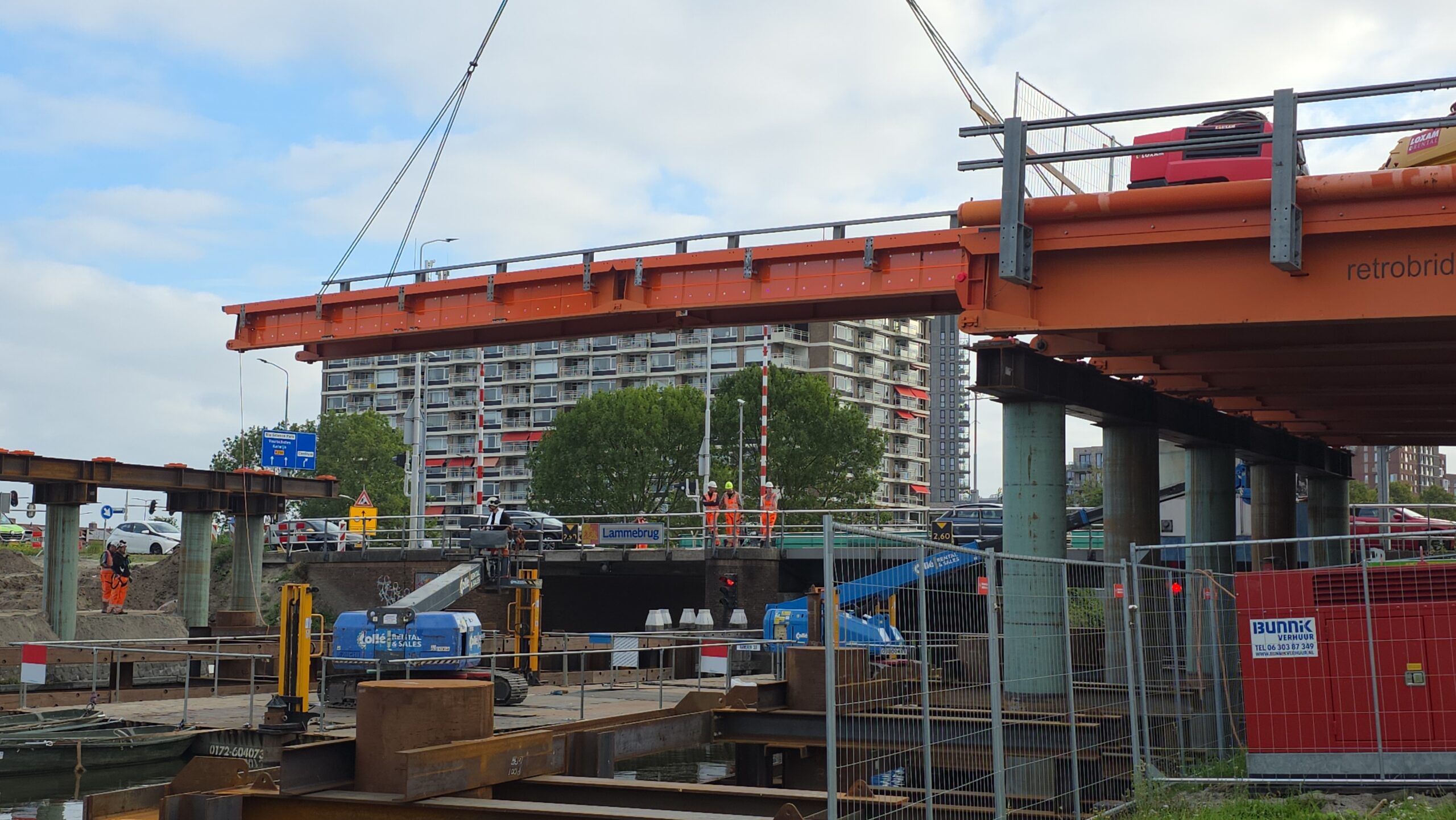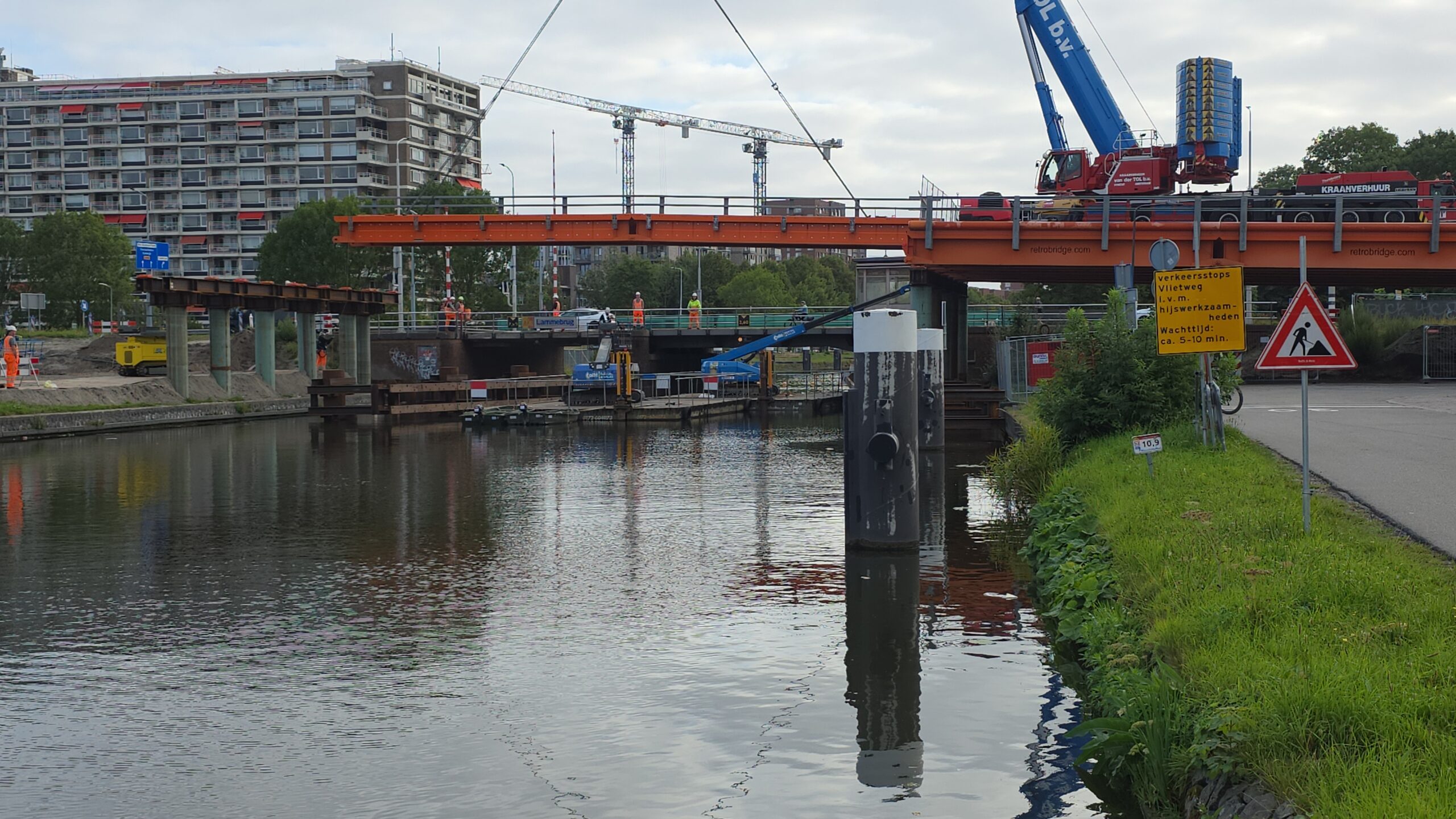 Nadat de afgelopen dagen al werd gewerkt aan het bruggenhoofd aan de kant van de Europaweg van de tijdelijke Lammebrug, is woensdag het water overgestoken met de enorme stalen elementen die samen de noodbrug vormen die het verkeer gaat afwikkelen als de oude Lammebrug wordt gesloopt.
