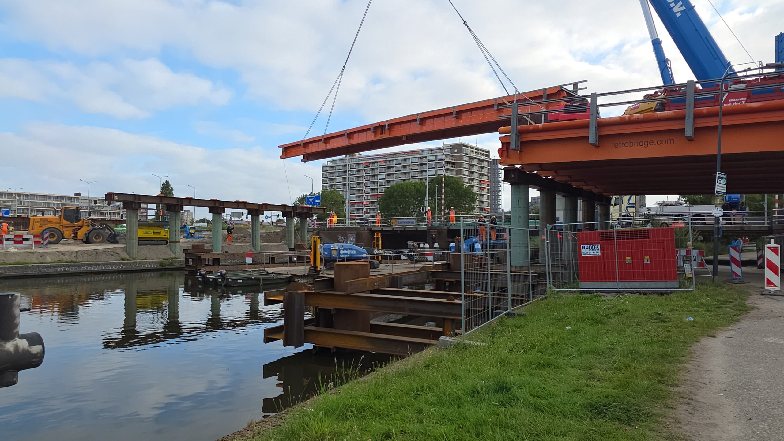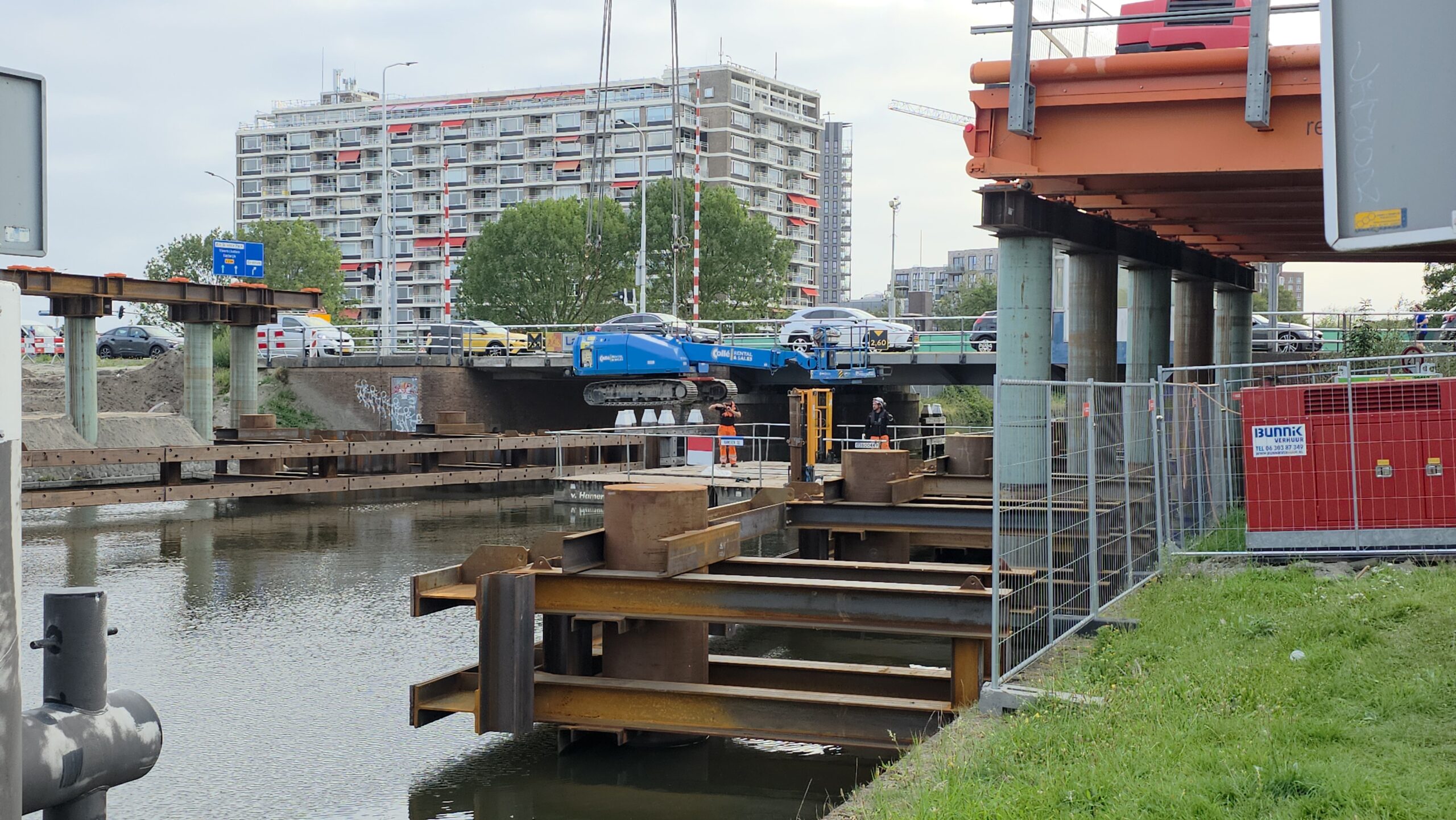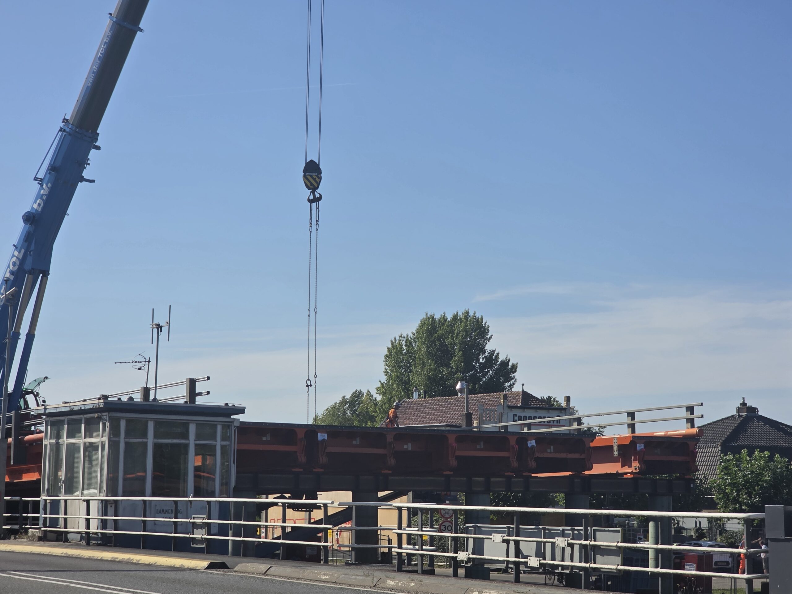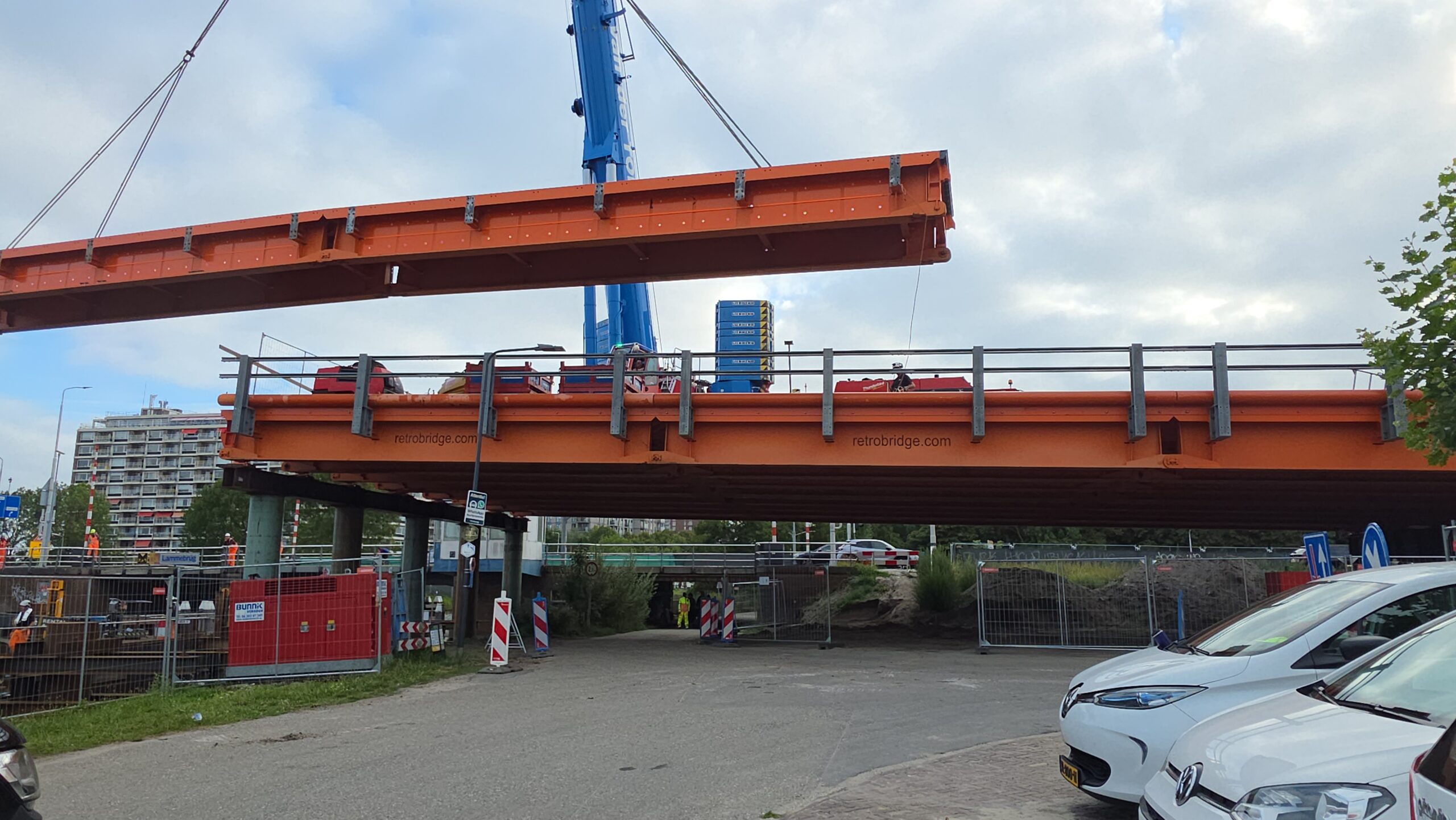 Nadat de afgelopen dagen al werd gewerkt aan het bruggenhoofd aan de kant van de Europaweg van de tijdelijke Lammebrug, is woensdag het water overgestoken met de enorme stalen elementen die samen de noodbrug vormen die het verkeer gaat afwikkelen als de oude Lammebrug wordt gesloopt.
