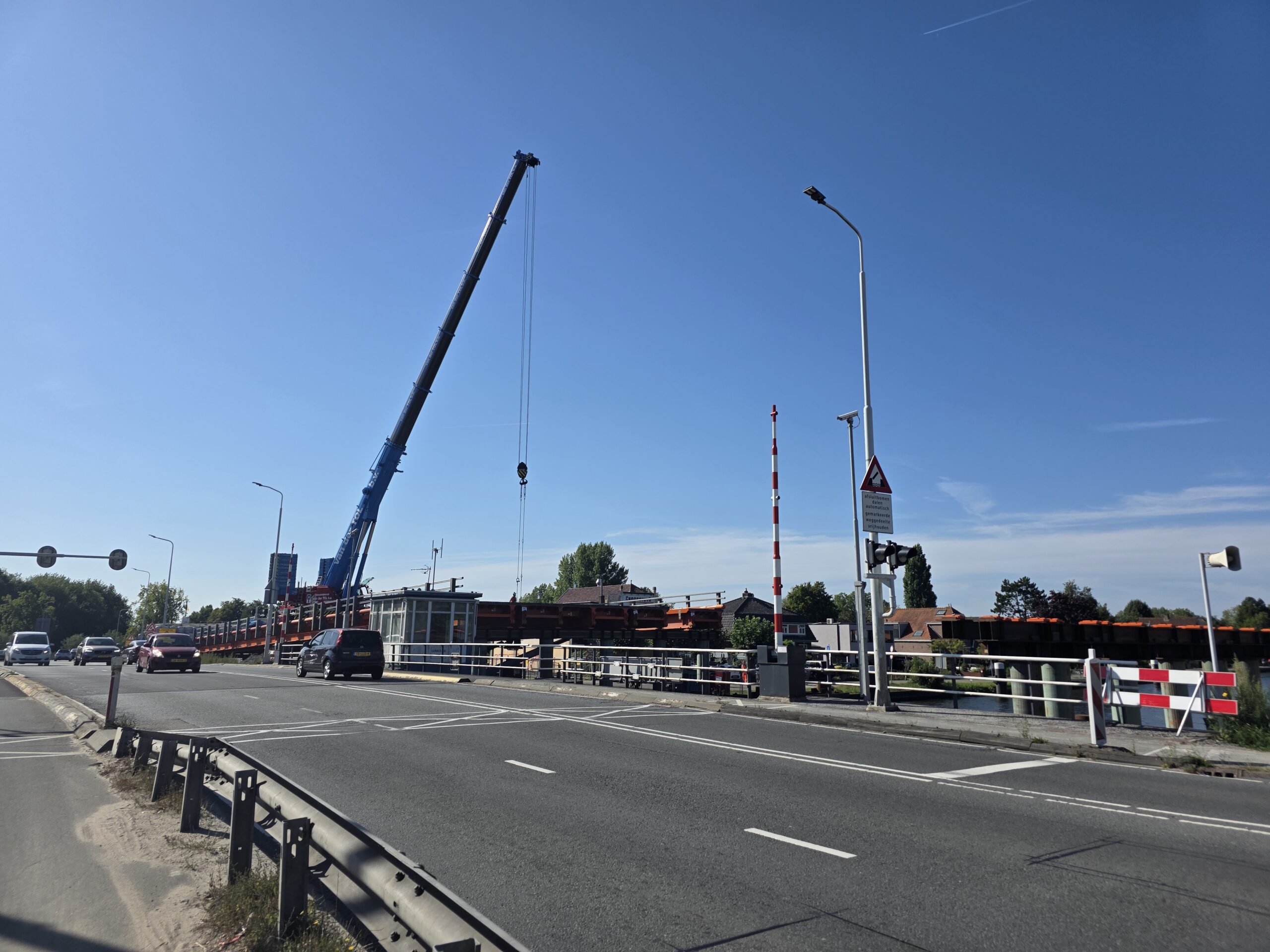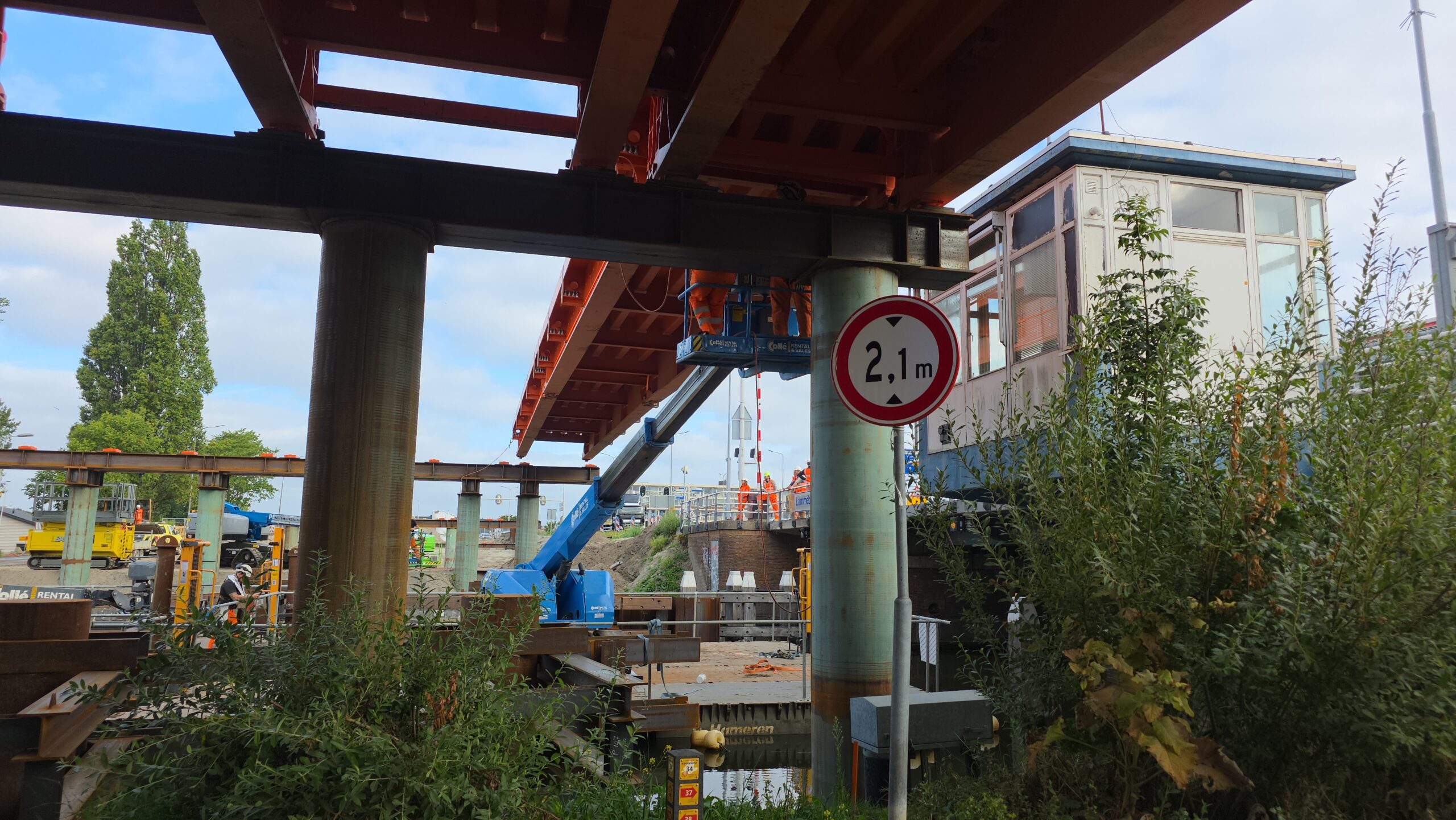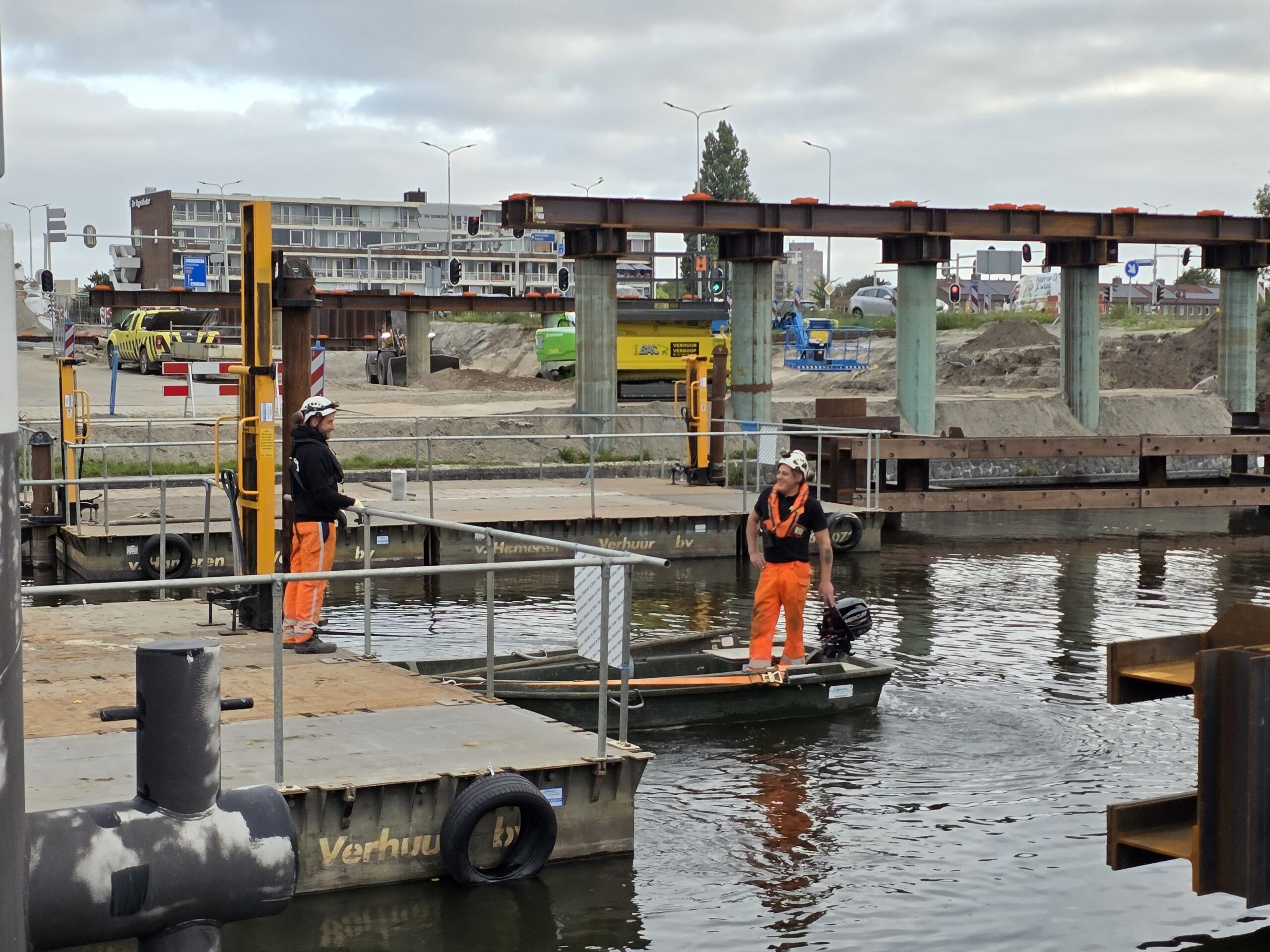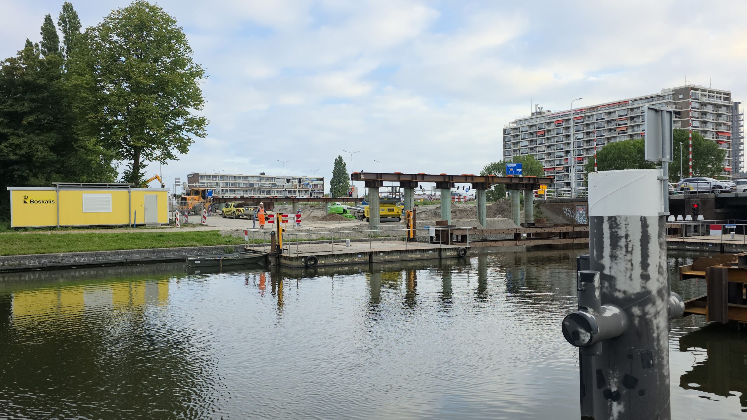 Nadat de afgelopen dagen al werd gewerkt aan het bruggenhoofd aan de kant van de Europaweg van de tijdelijke Lammebrug, is woensdag het water overgestoken met de enorme stalen elementen die samen de noodbrug vormen die het verkeer gaat afwikkelen als de oude Lammebrug wordt gesloopt.