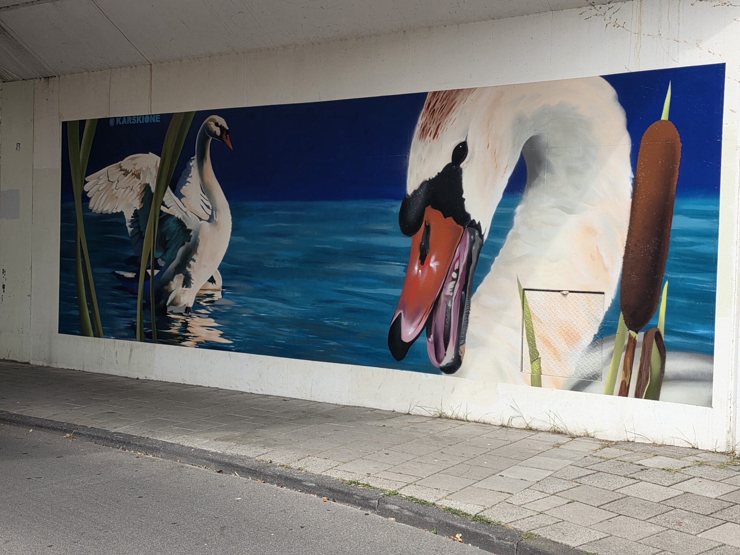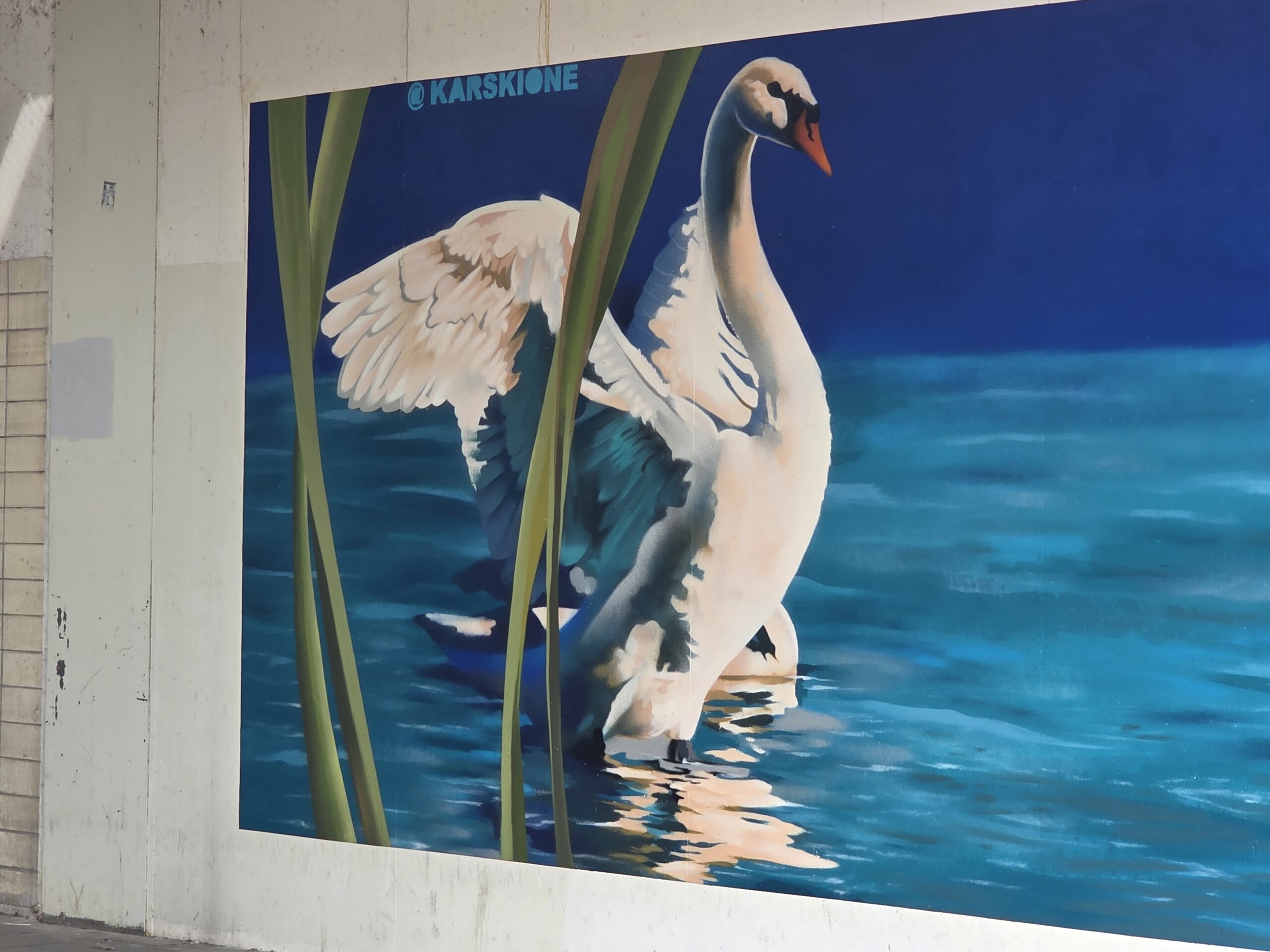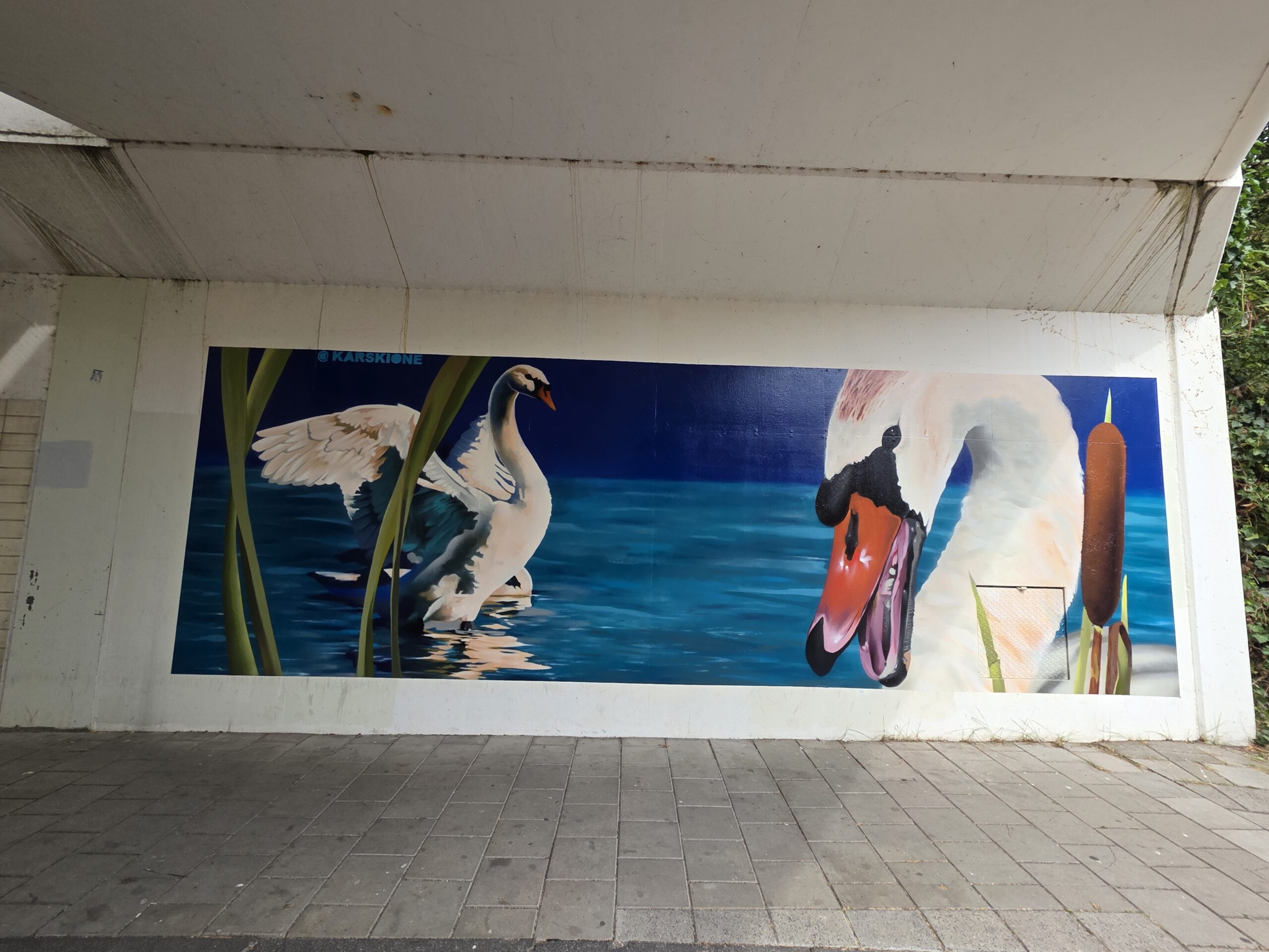 Karski, de ‘artiestennaam’ van straatkunstenaar Roy Valk, heeft onder het treinviaduct bij de Lage Morsweg een muurschildering aangebracht van twee zwanen.