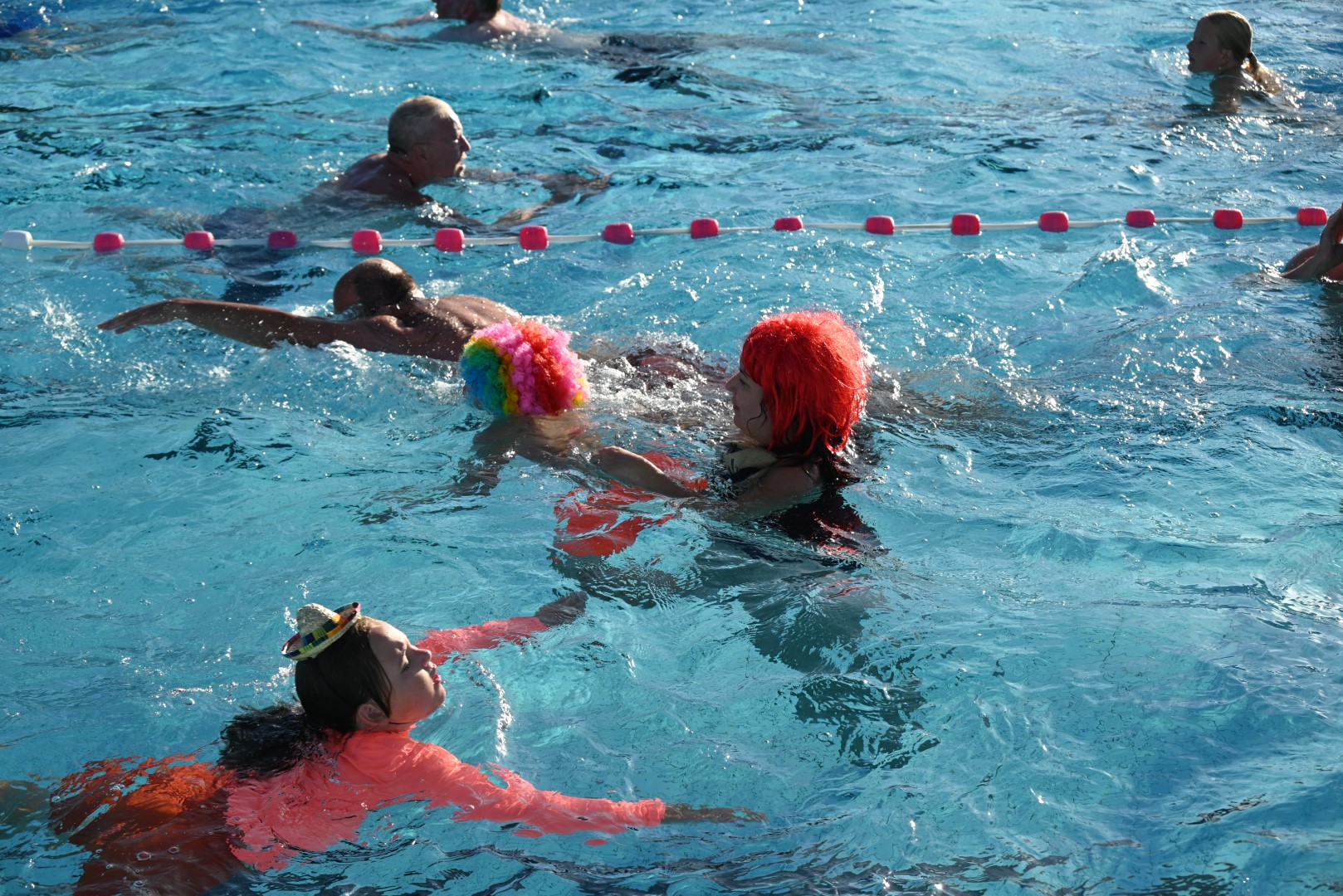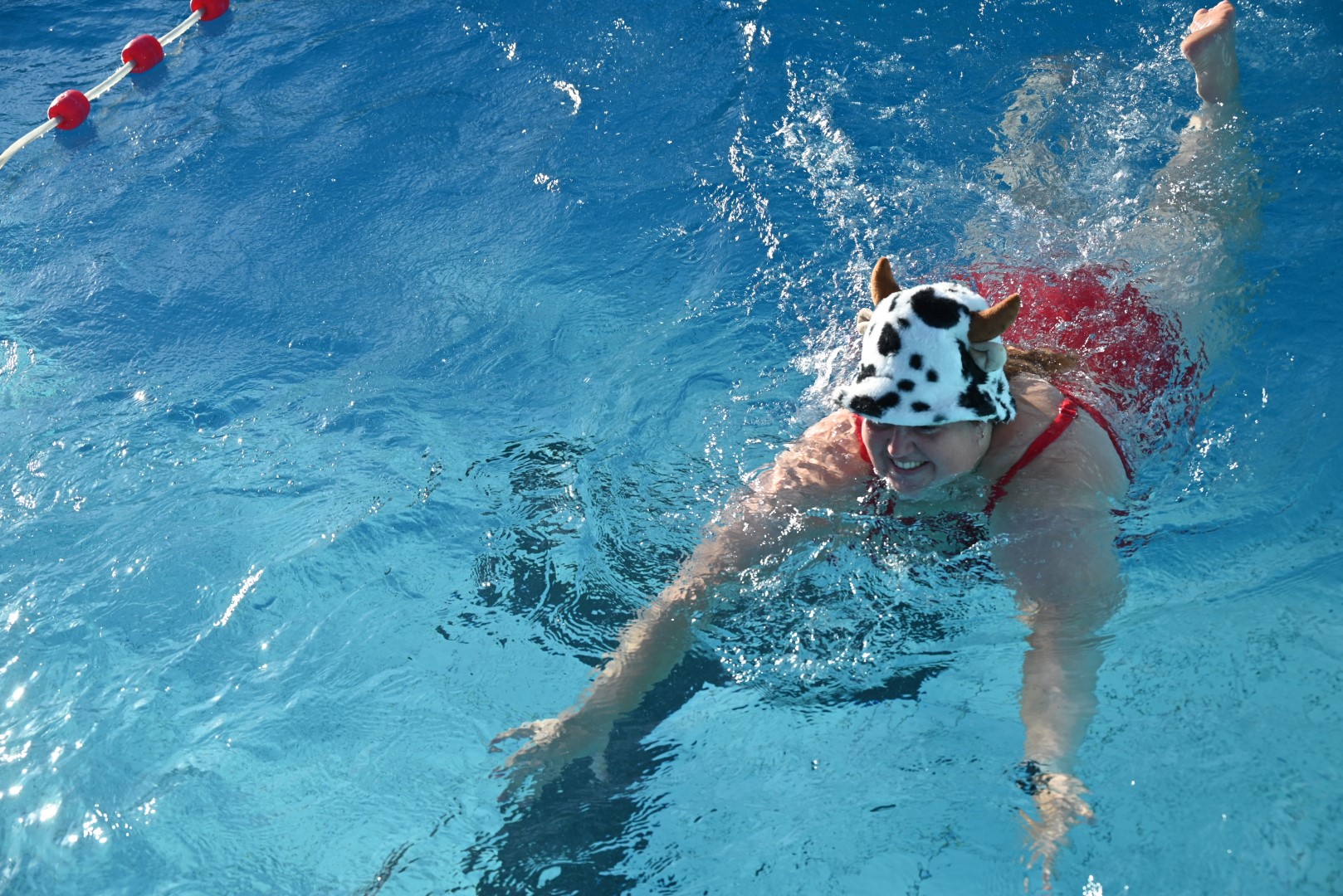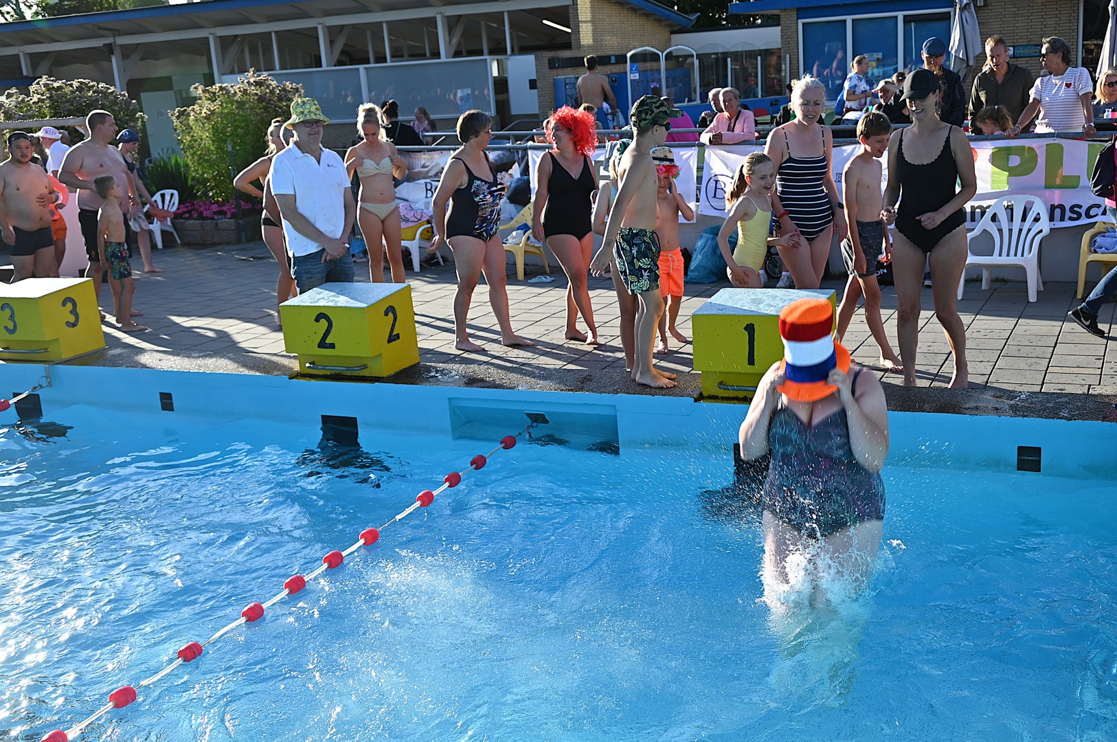 Namens de Stichting Sport in Beeld is Carola de Vogel verantwoordelijk voor de Zwemvierdaagse. Eerder deze week was ze al erg blij met het aantal deelnemers. Door omstandigheden kon ze er donderdagavond niet bij zijn, maar toen ze hoorde hoeveel deelnemers er te gekke mutsen, pruiken en petten op hadden gezet kon haar week niet meer kapot.