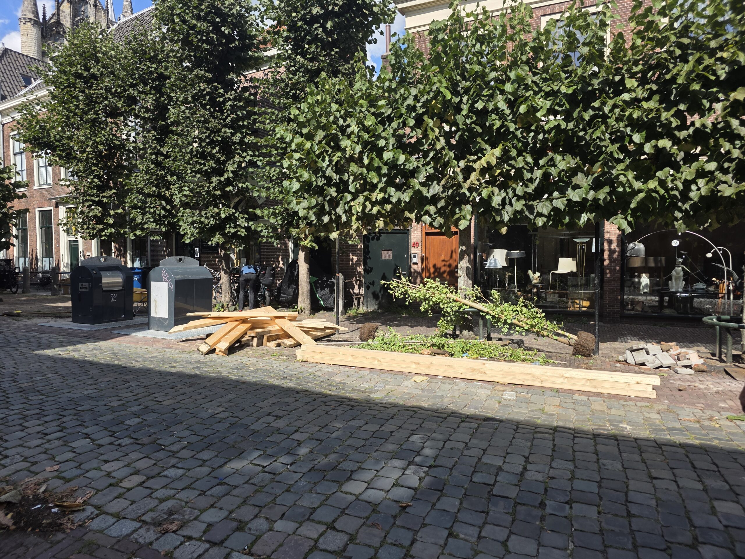 Hoewel de astronomische zomer nog twintig dagen duurt, is deze in de Leidse Nieuwstraat weer voorbij. Het project ‘Ruimte voor de zomer’ waar de gemeente Leiden een week of zes geleden 80.000 euro in stak is afgerond.