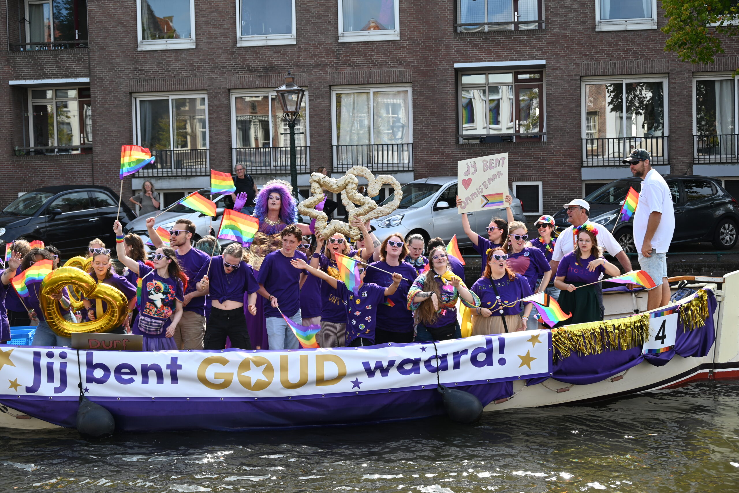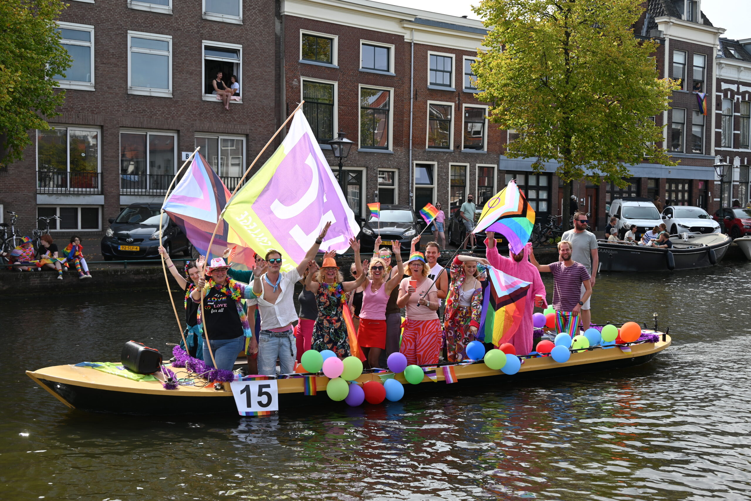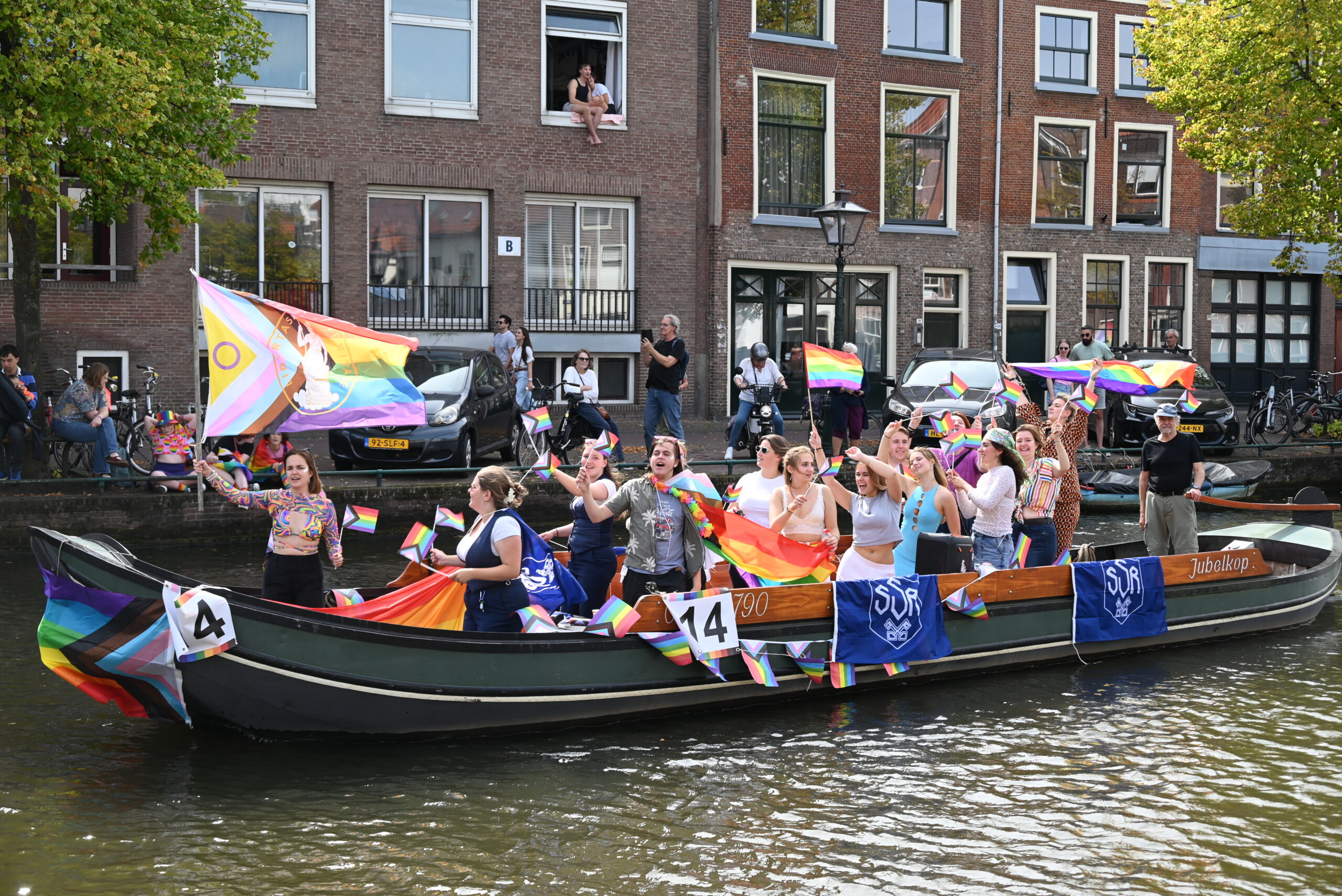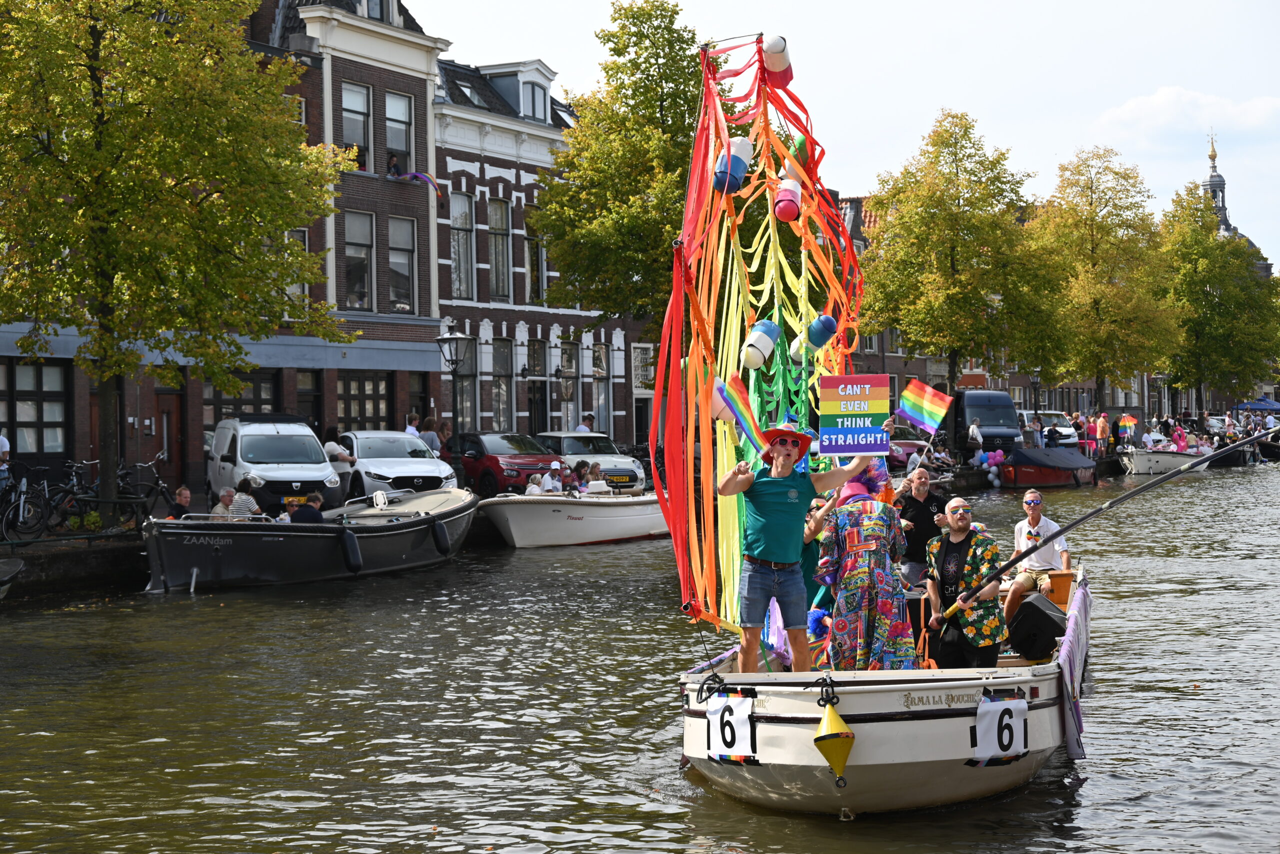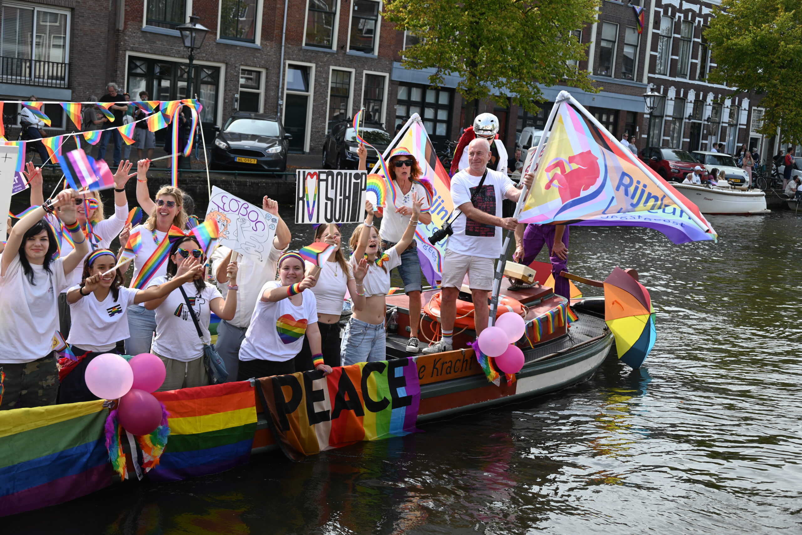 Dit keer voeren zo’n vijftig deelnemers mee in de kleurige vaartstoet door de Leidse grachten. Net als vorig jaar werkte het weer goed mee en vierden deelnemers en publiek het feest van gelijkheid uitbundig mee.