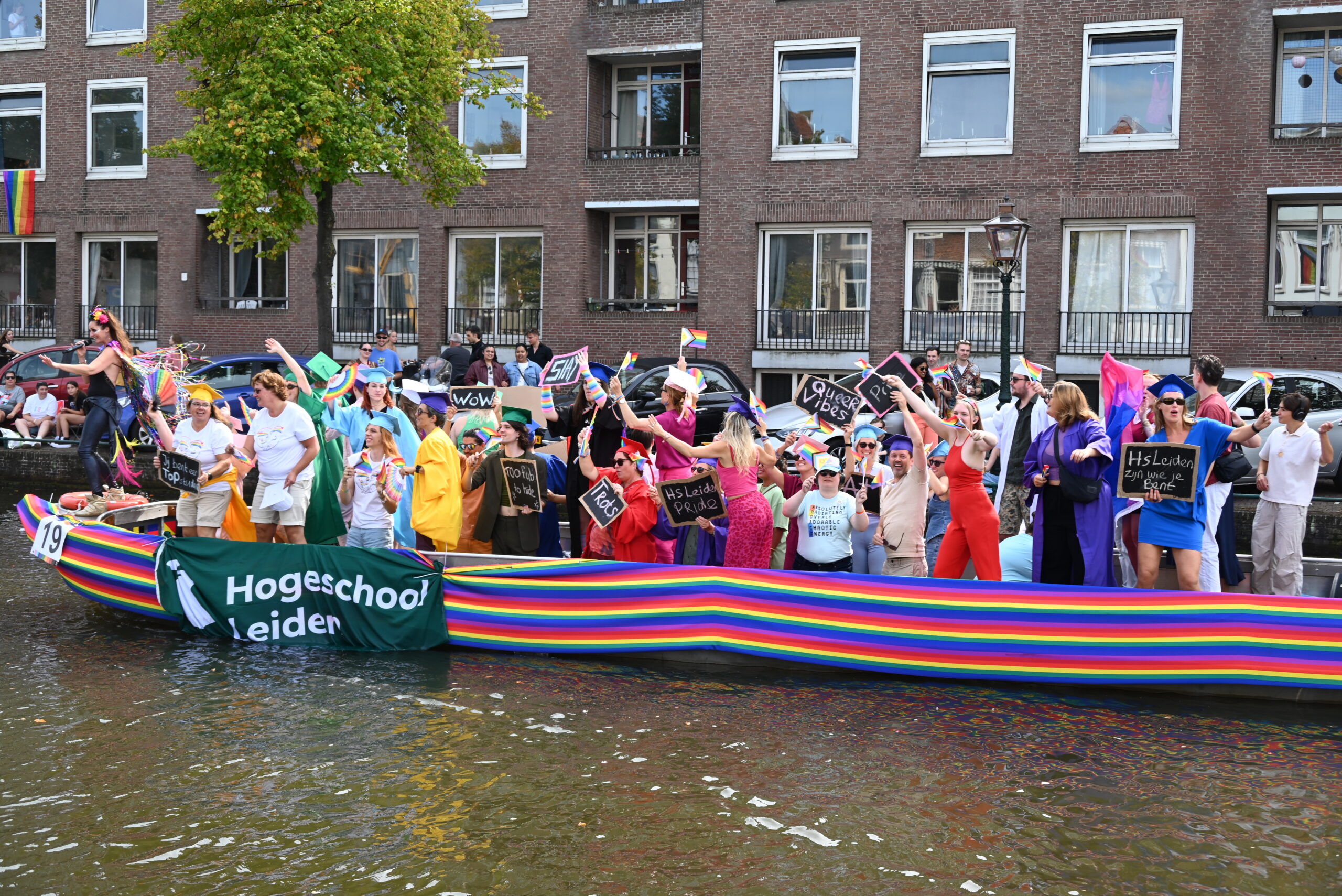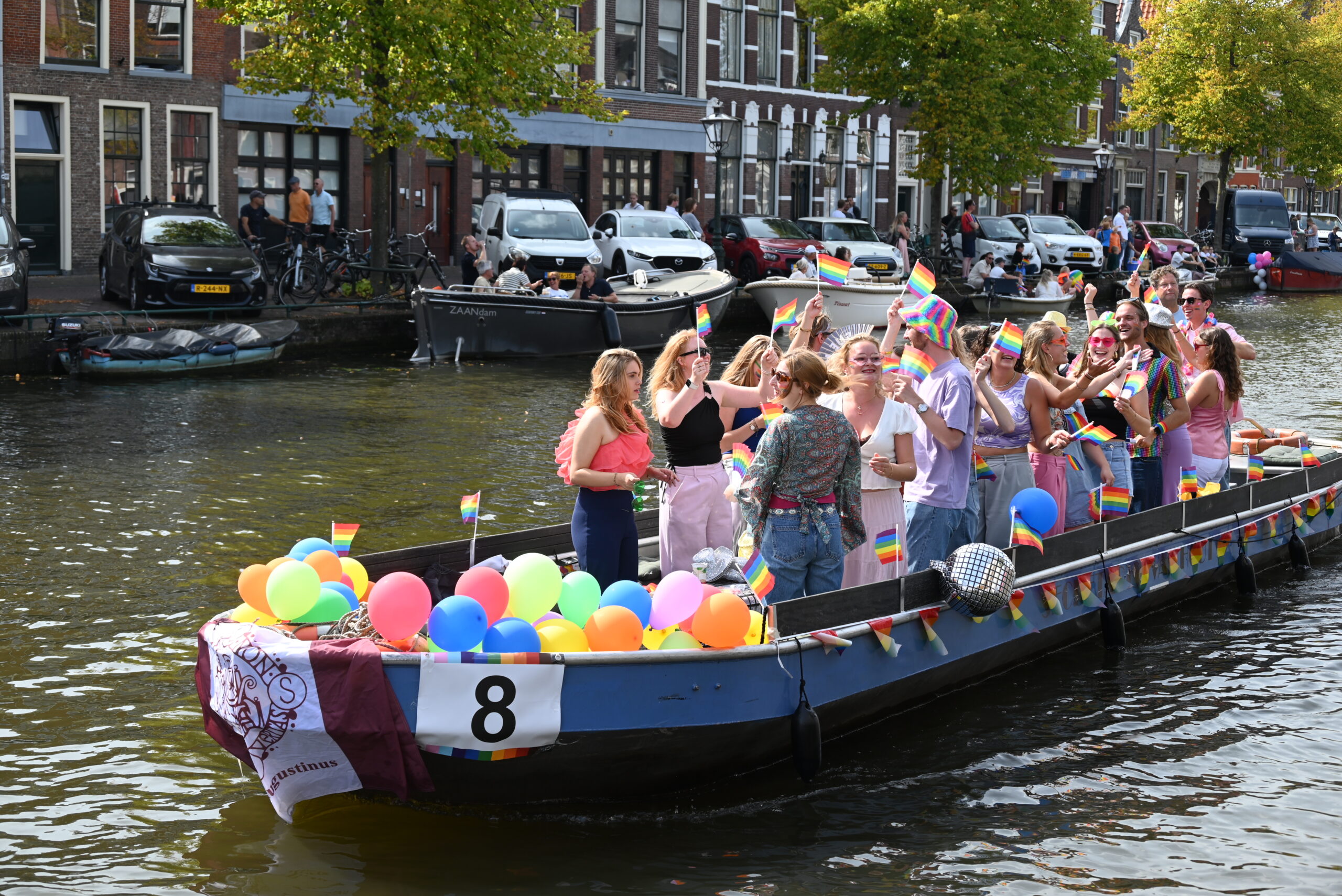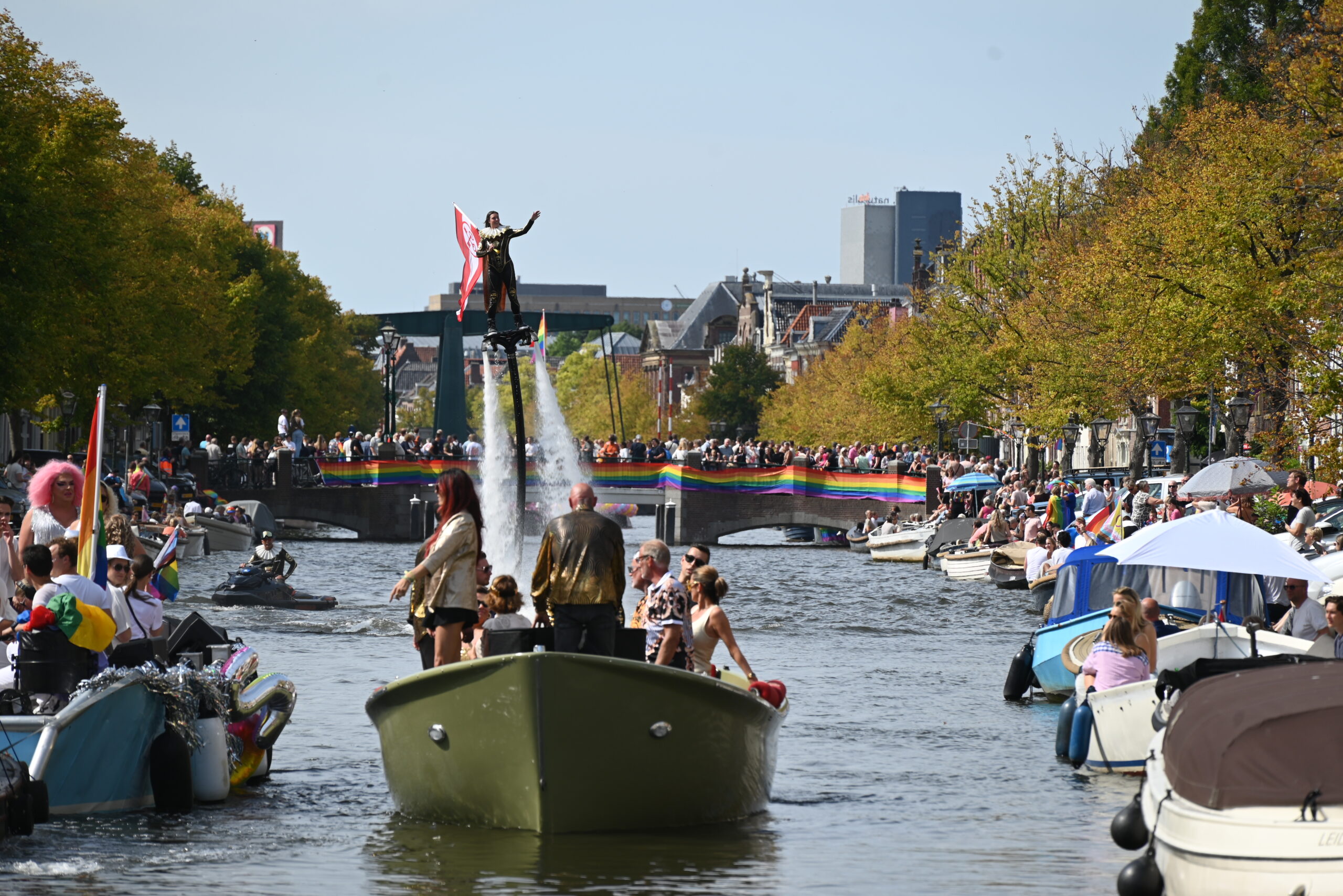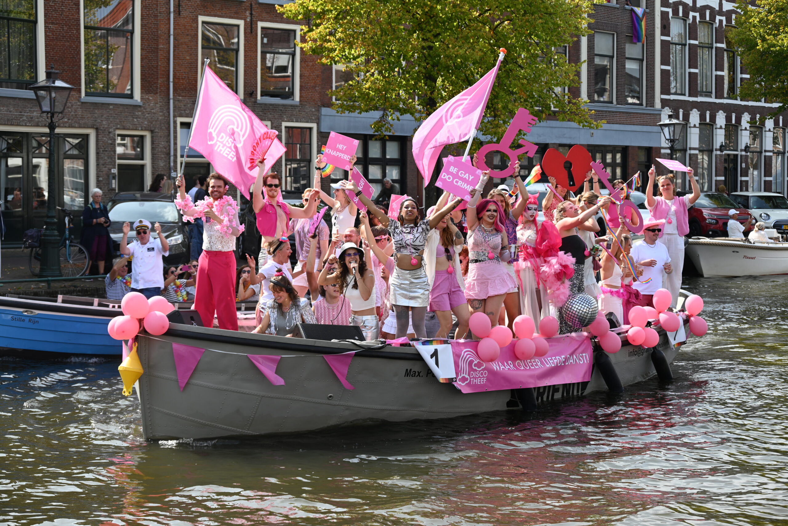 Dit keer voeren zo’n vijftig deelnemers mee in de kleurige vaartstoet door de Leidse grachten. Net als vorig jaar werkte het weer goed mee en vierden deelnemers en publiek het feest van gelijkheid uitbundig mee.