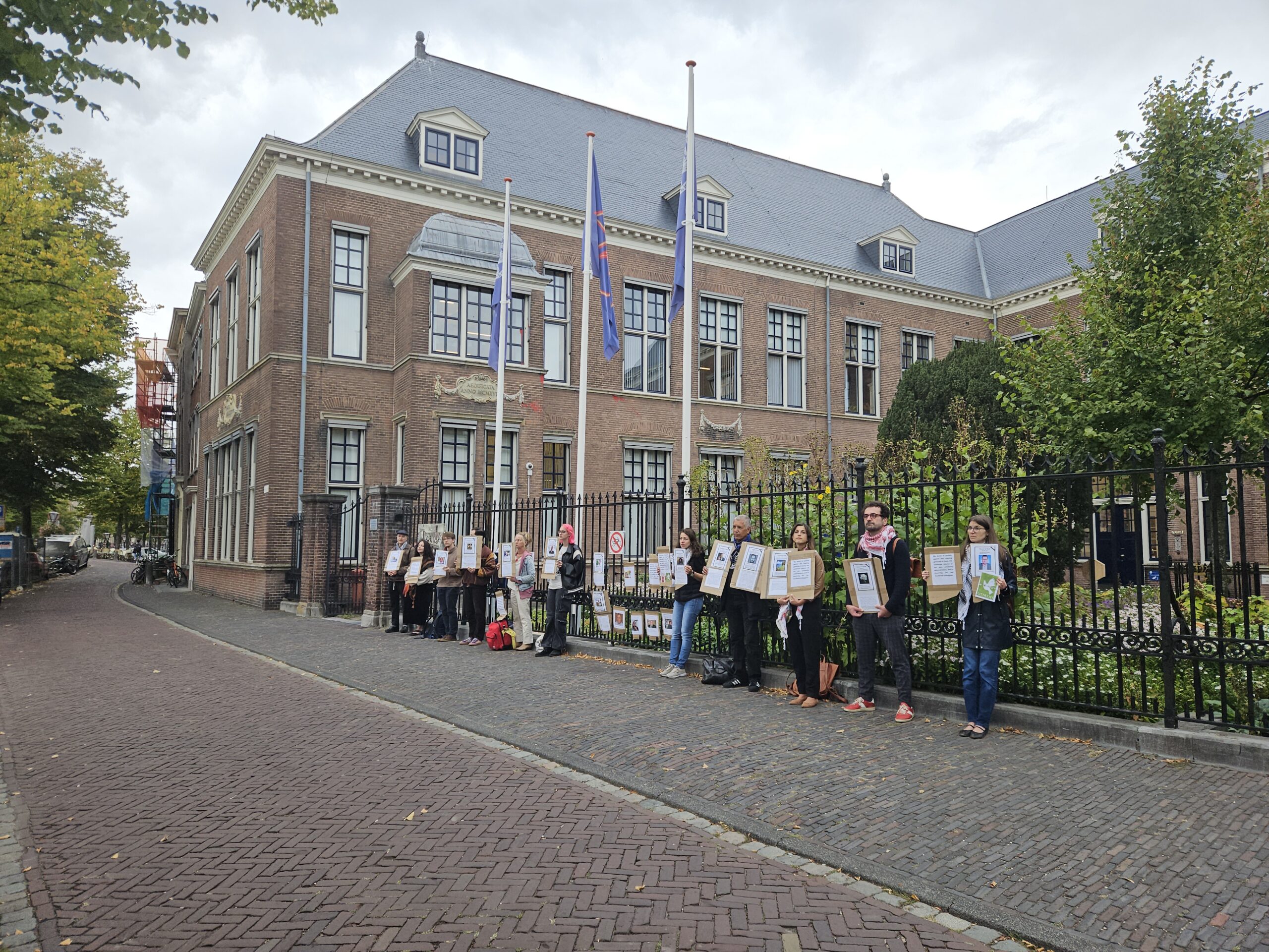 Demonstranten van onder meer Leiden Scholars for Palestine hielden dinsdag een stil protest op de stoep voor de Oude UB, het gebouw waarin het bestuur van Universiteit Leiden huist.