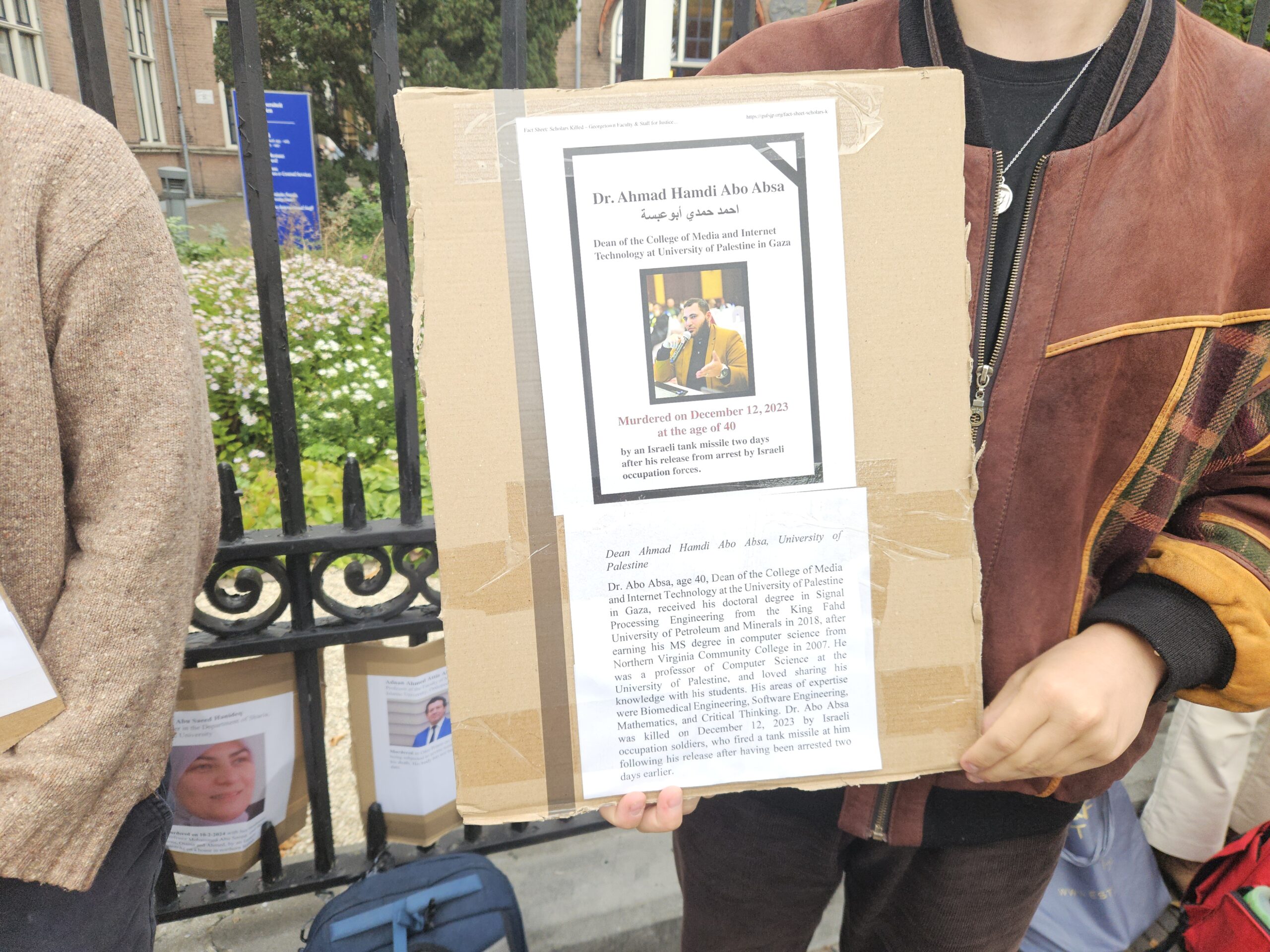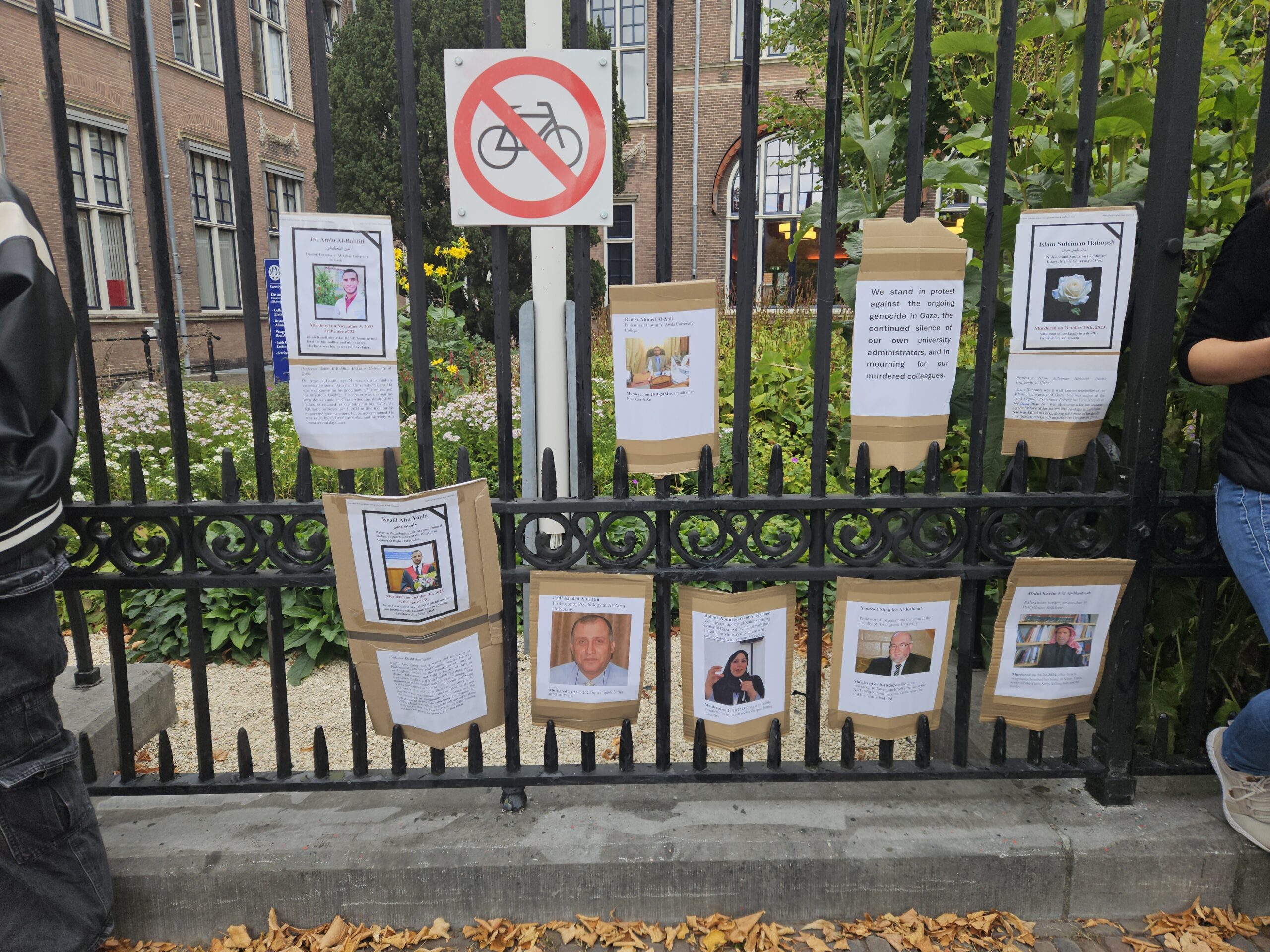 Ze hielden borden op met daarop foto’s van Palestijnse academici die door het Israëlische leger zijn gedood. De actievoerders, onder wie studenten en docenten, roepen de universiteit op om alle banden met Israëlische universiteiten te verbreken.