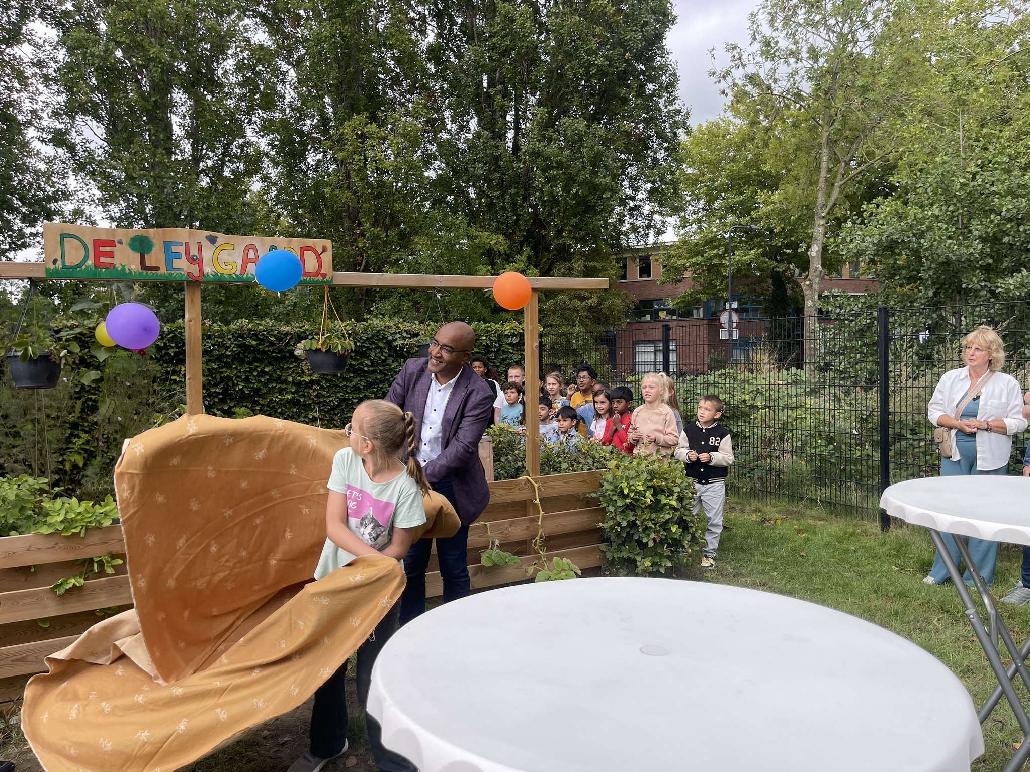 Basisschool De Ley heeft woensdag officieel haar eigen schooltuin geopend. Leerlingen onthulden het naambord van de tuin, die vanaf nu de naam Leygaard draagt.