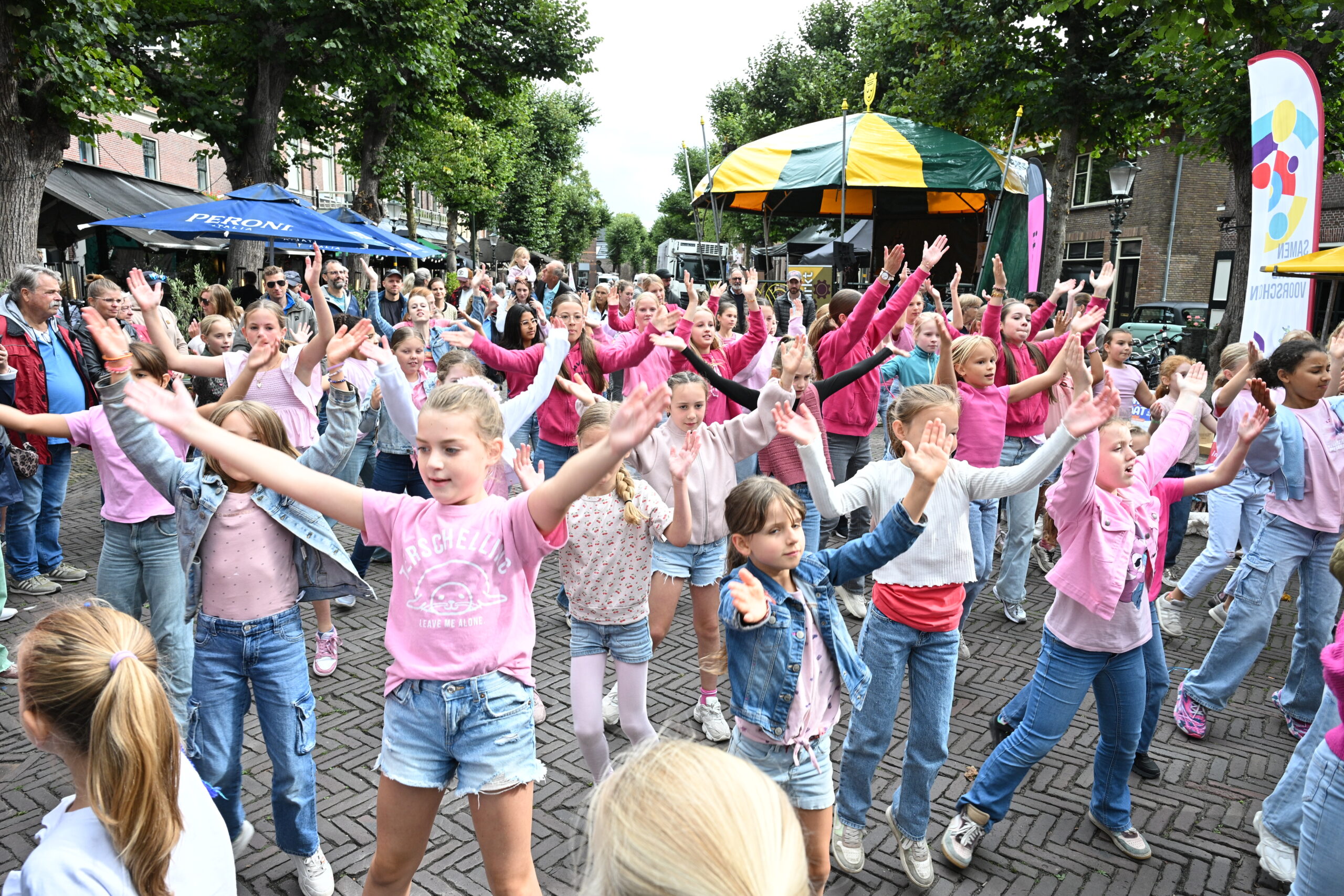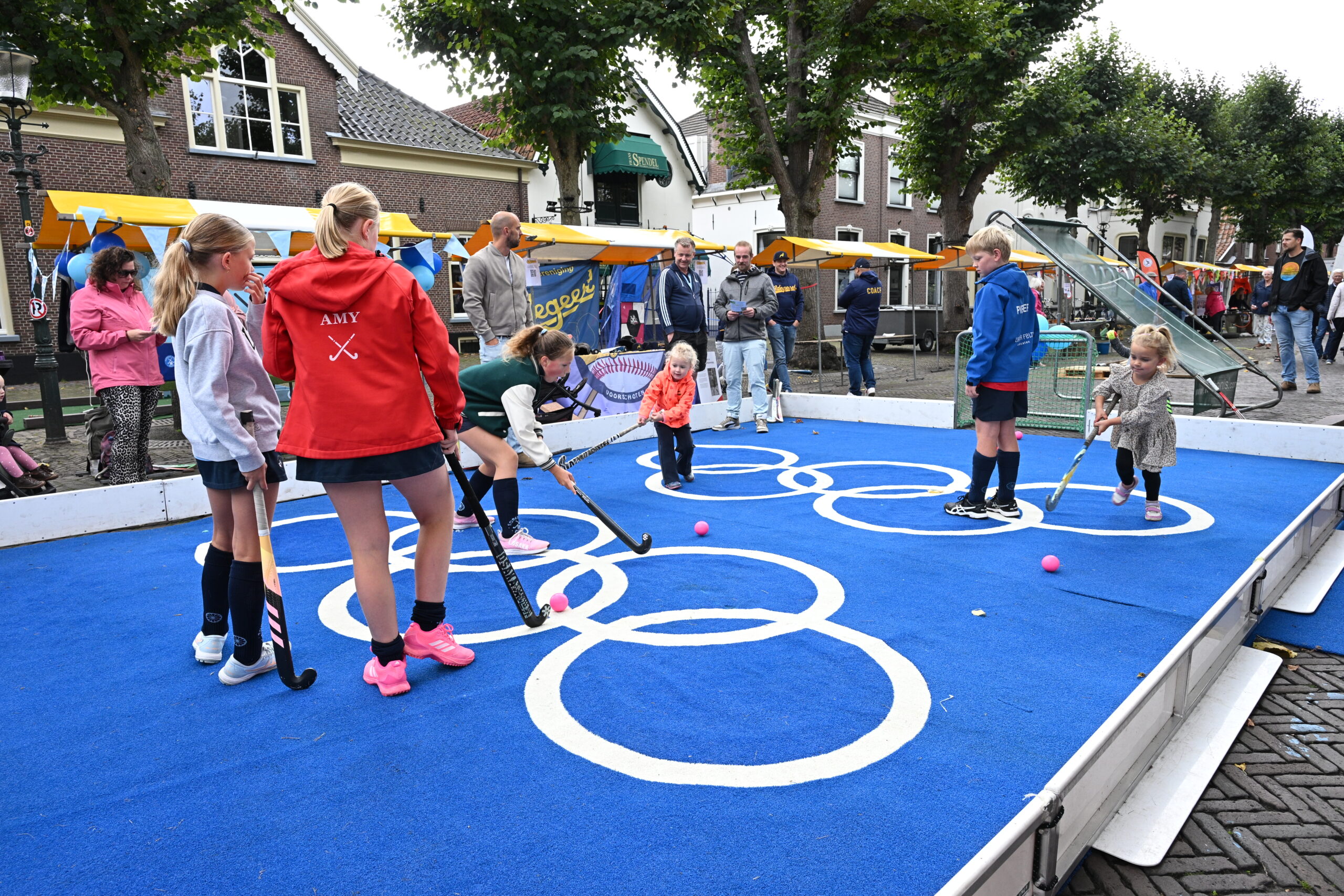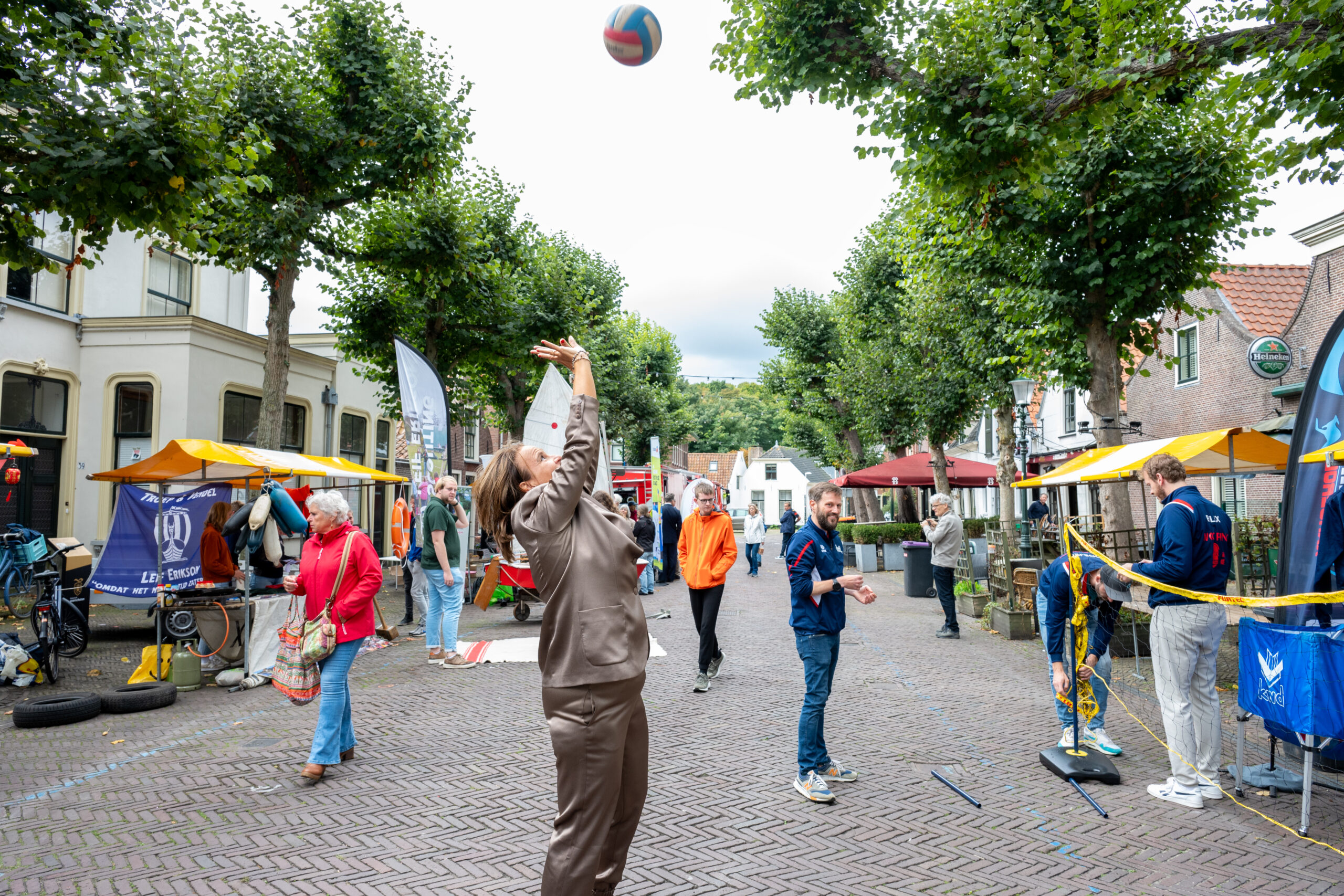 Buiten begon aansluitend de verenigingsmarkt met talloze activiteiten. Met de regen viel het gelukkig al met al mee, in elk geval in de ochtend. De sportstraat die was ingericht in de Voorstraat ging gewoon door met onder andere hockey en dansen. Burgemeester Stemerdink liet zien dat zij vroeger op hoog niveau volleybalde. Fotografe Nelleke de Vries was er op tijd bij om dat vast te leggen.