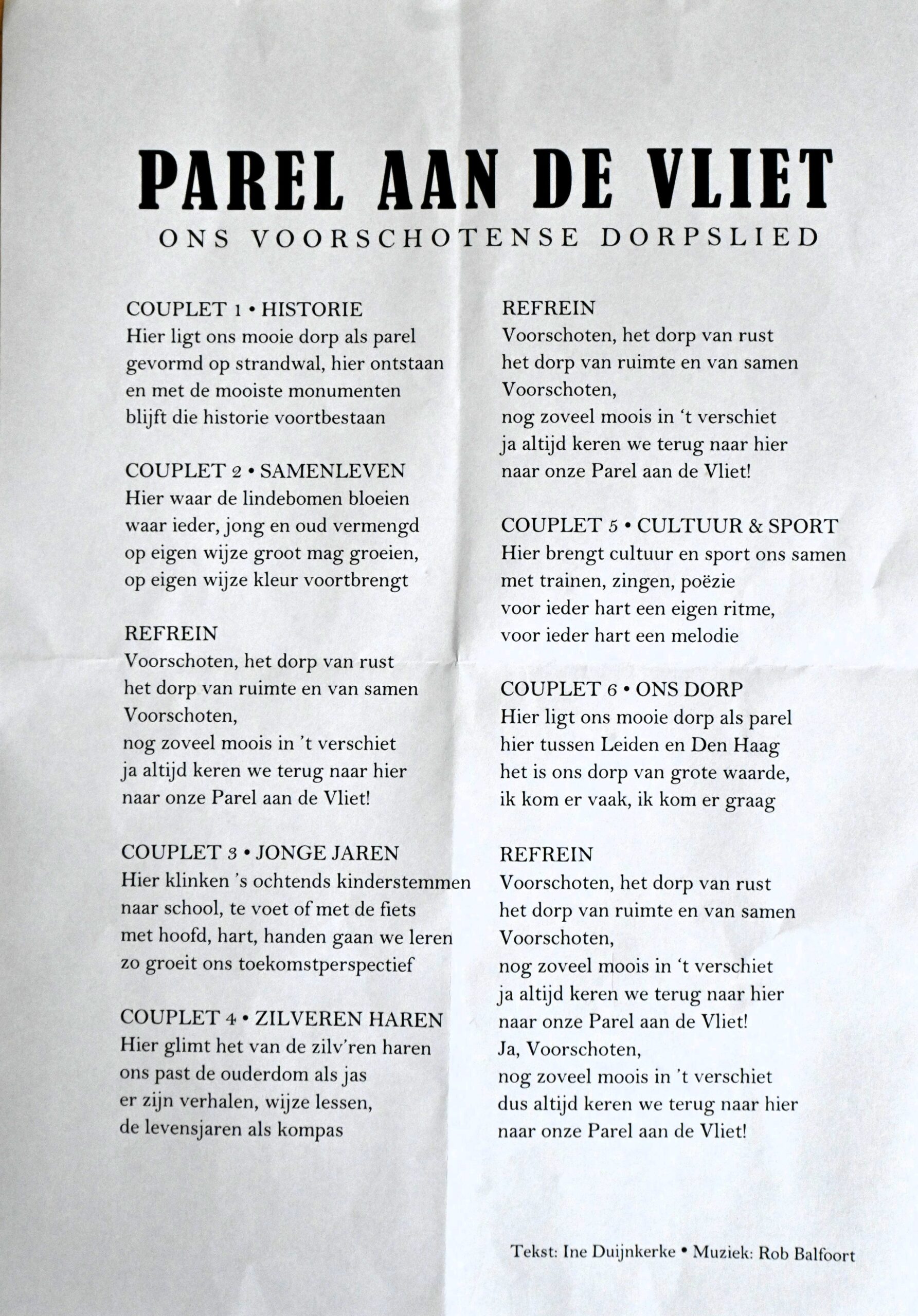 Daarna ontpopte wethouder Hans van der Elst zich als een ware entertainer. Fluitend bereidde hij het publiek voor op het nieuwe dorpslied, gecomponeerd door Rob Balfoort en met een tekst die is geschreven door Ine Duijnkerke. De tekst van het lied werd aangeboden aan burgemeester Stemerdink die haar zangstem vandaag niet bij zich had. Daarom was er een koor van jonge en wat oudere jongere inwoners die het lied hadden ingestudeerd. Maar liefst zes coupletten telt het nieuwe ‘Parel aan de Vliet’ maar het heeft een lekker modern ritme, een prettige melodie en een tekst die beter aanspreekt dat de vorige versie.