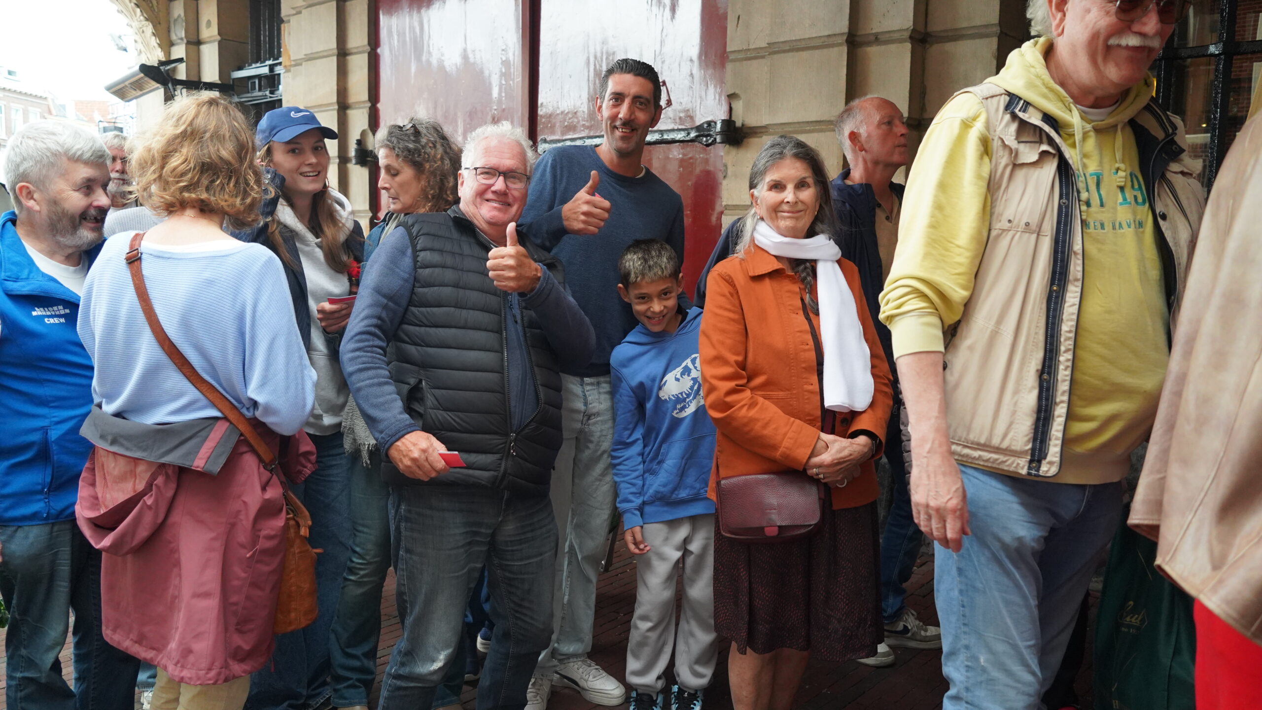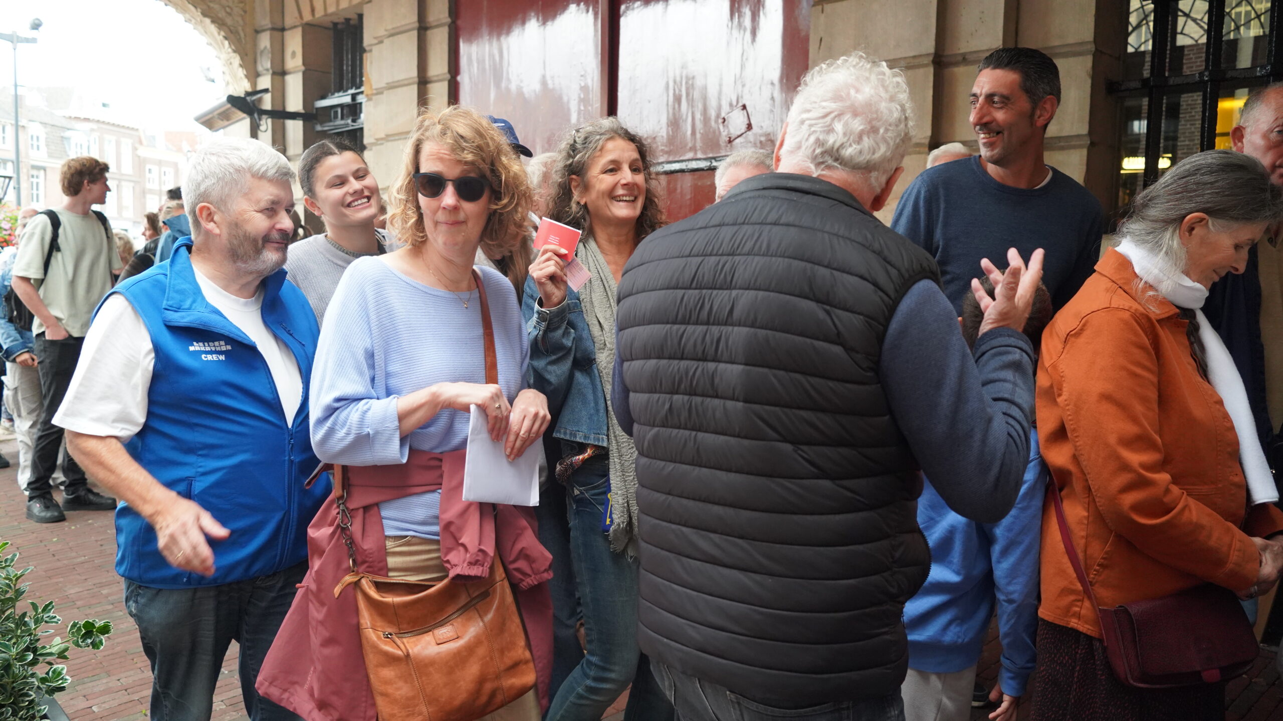 De rij naar de Waag toe liep dit jaar bijna tot het Kort Rapenburg. In de rij menig rood-wit uitgedoste Leidenaar. Van jong tot oud.