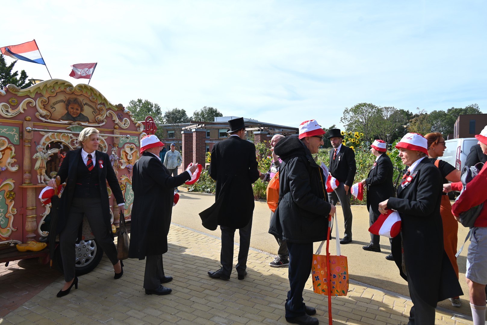 Om de bewoners alvast in een feeststemming te brengen stonden Mart en Cor Broers met hun draaiorgel voor de deur en deelden de Commissieleden 3 Octoberhoedjes uit. Bij alle huizen waren ook al oliebollen bezorgd om na het feest op te eten.