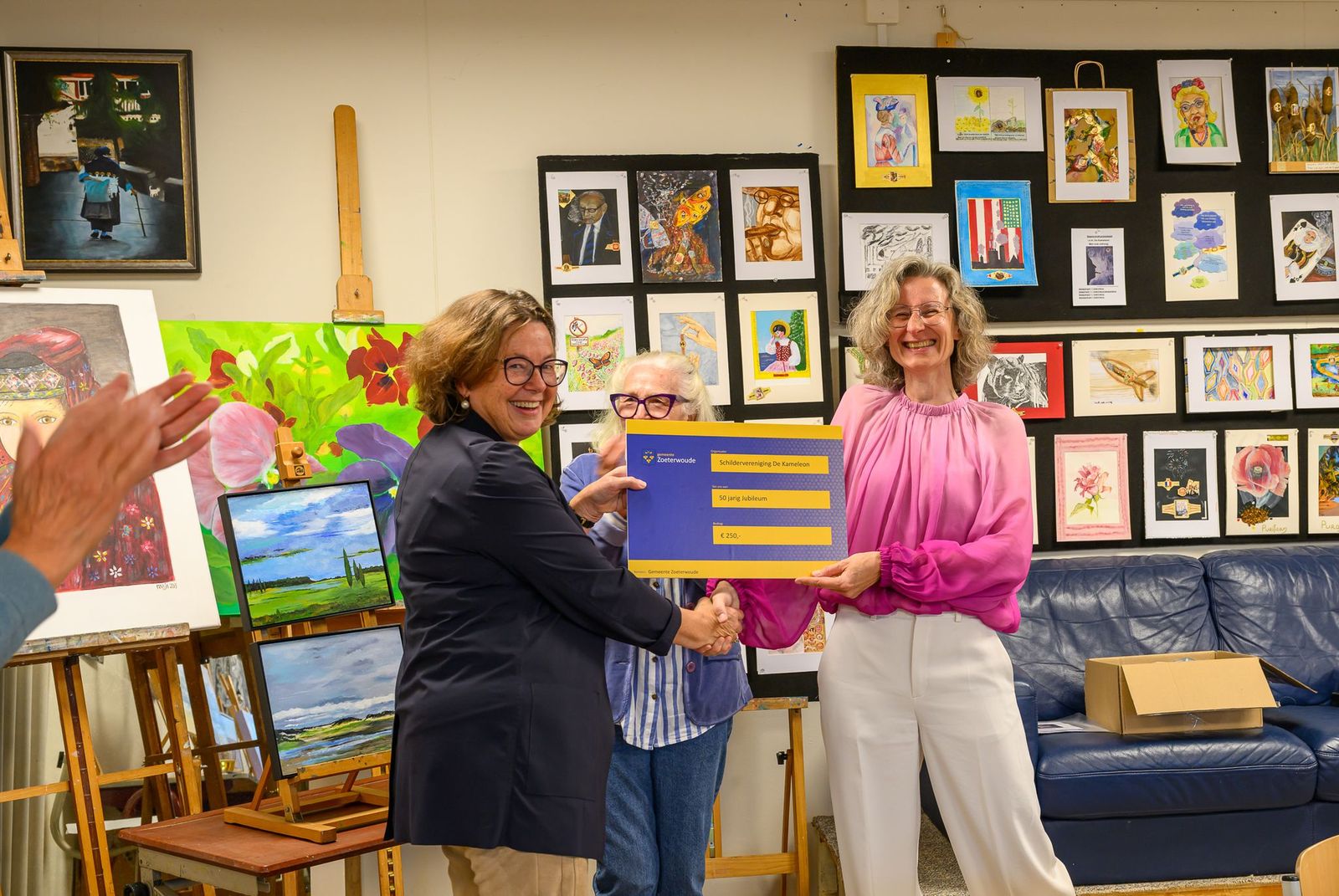 Namens de gemeente Zoeterwoude overhandigde wethouder Kunst en Cultuur Moniek van Sandick een cheque ter waarde van 250 euro aan de vereniging. “Kunst en cultuur brengen mensen samen, inspireren en versterken de verbinding in ons dorp. De Kameleon laat al vijftig jaar zien hoe waardevol het is dat inwoners hun creativiteit met elkaar delen”, aldus de wethouder.