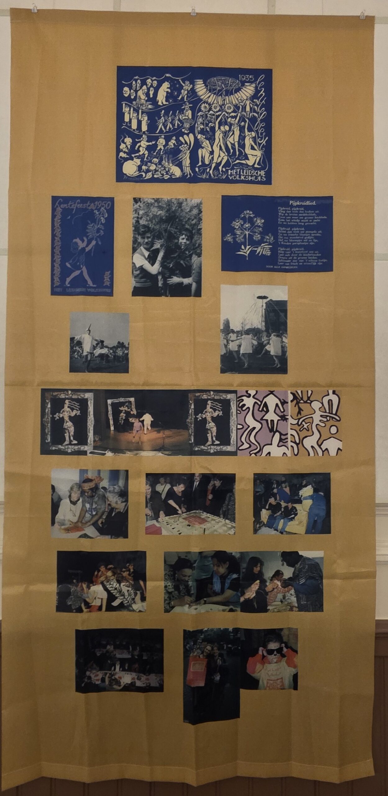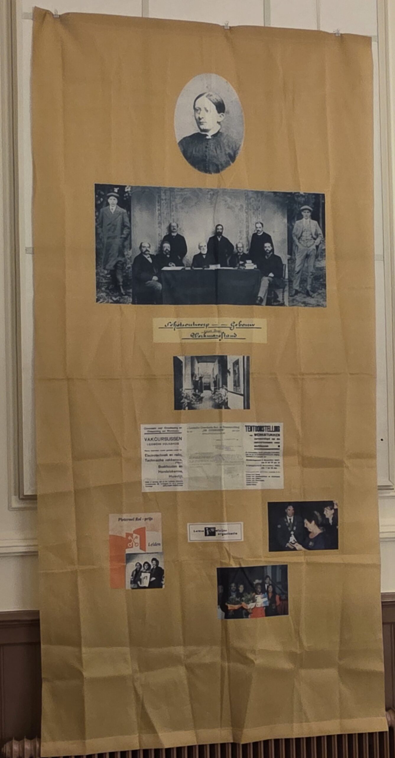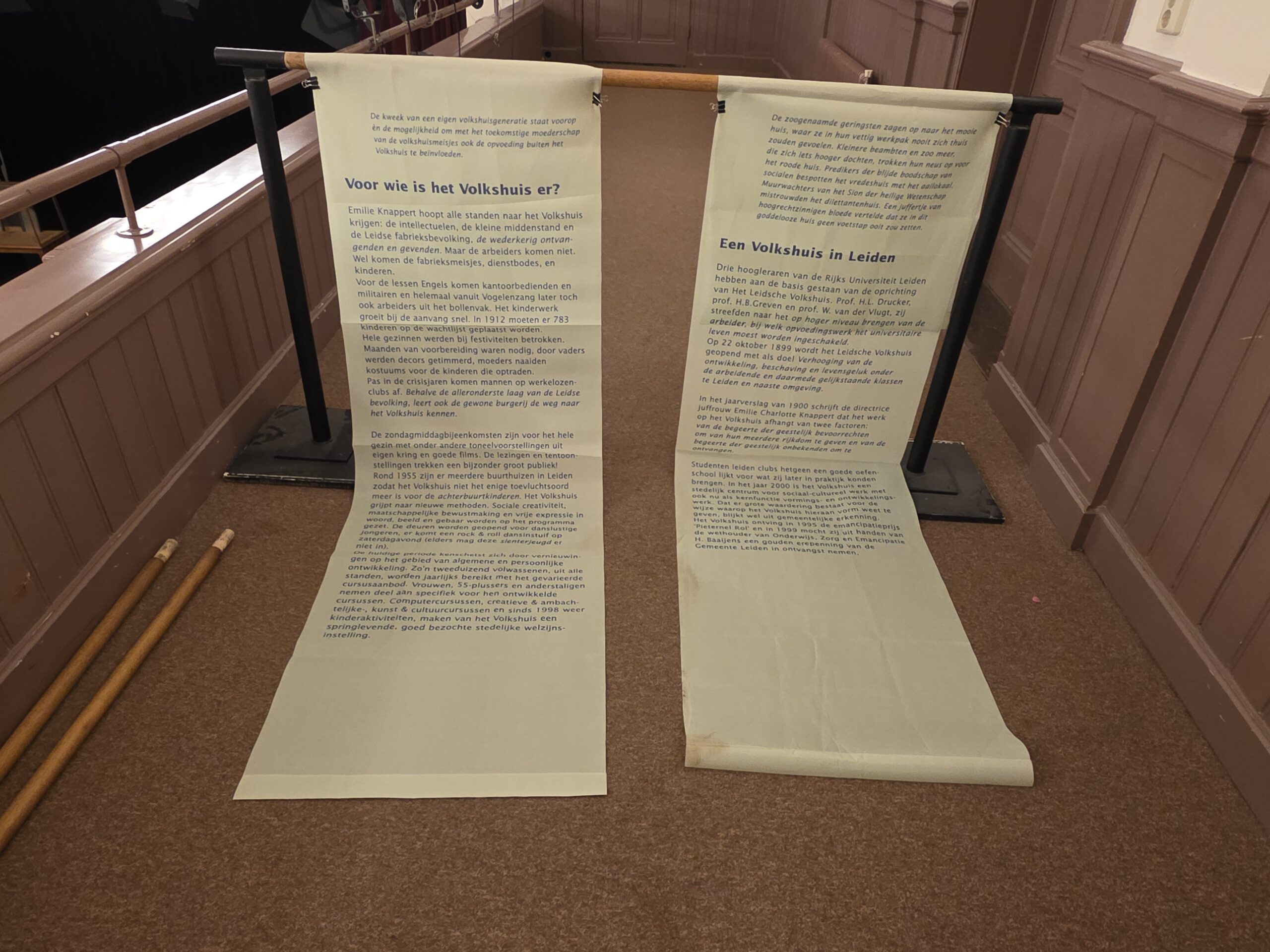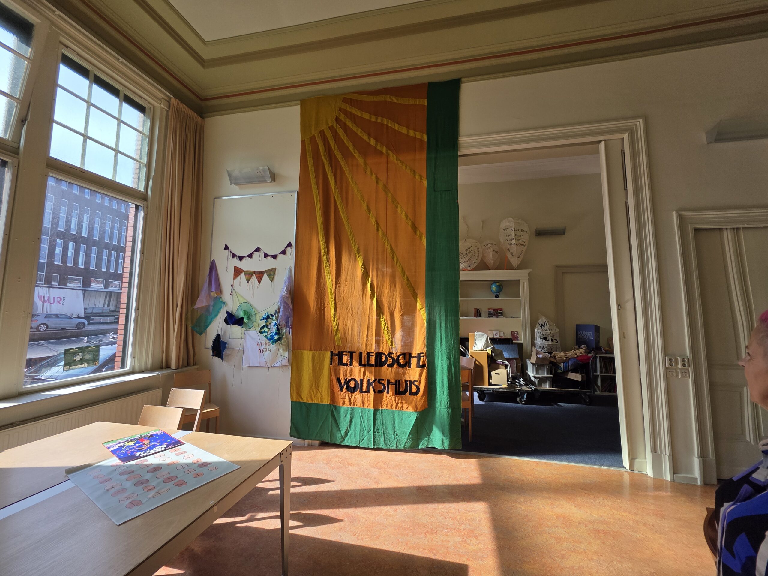 In het gebouw hangen foto’s, vlaggen en allerlei herinneringen uit het verleden van het Leidse Volkshuis.